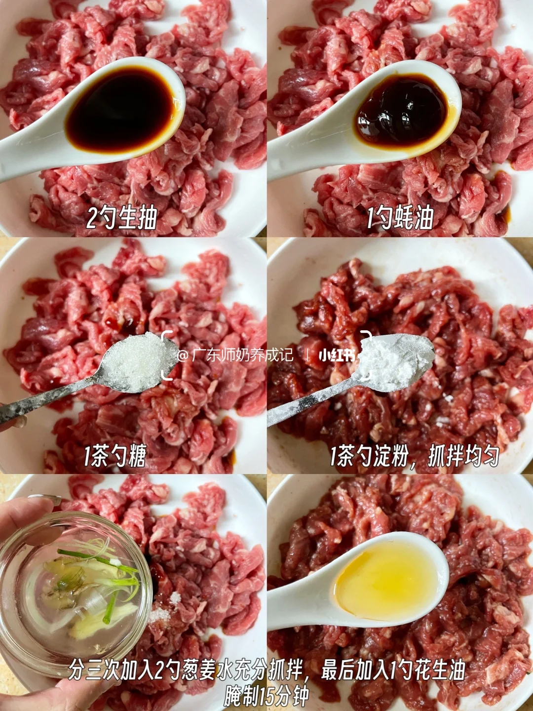 1⃣牛肉横纹切薄片,参考图片方法腌制15分钟