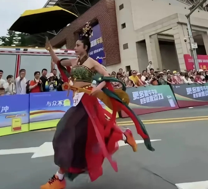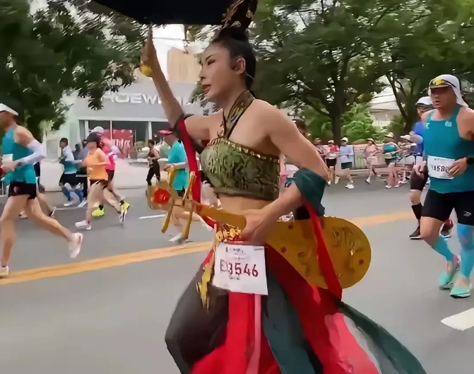 完全搞不明白,兰州马拉松"飞天女″杨文娟的行为! 说她是作秀吧!人家居然全程,一手拿伞,一手拿着琵琶,穿着盛装,跑完了马拉松。 说她是资深马拉松爱好者,她所做的一切,又完全不符合马拉松长跑的要求!和众多参赛者们又格格不入!