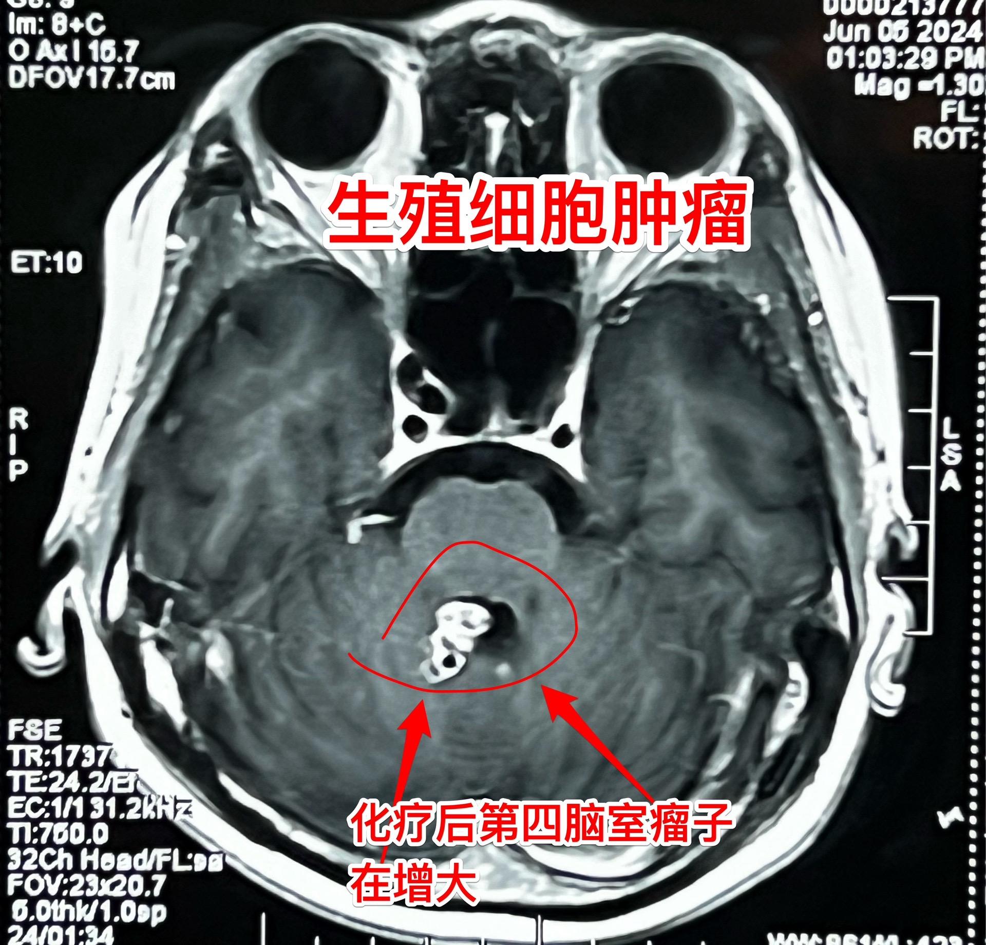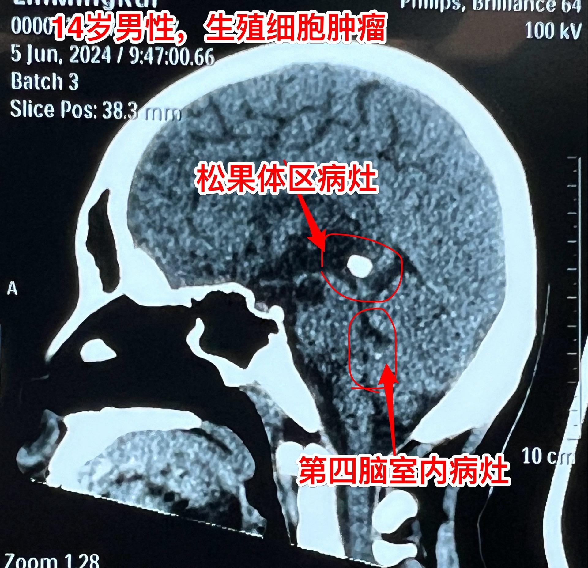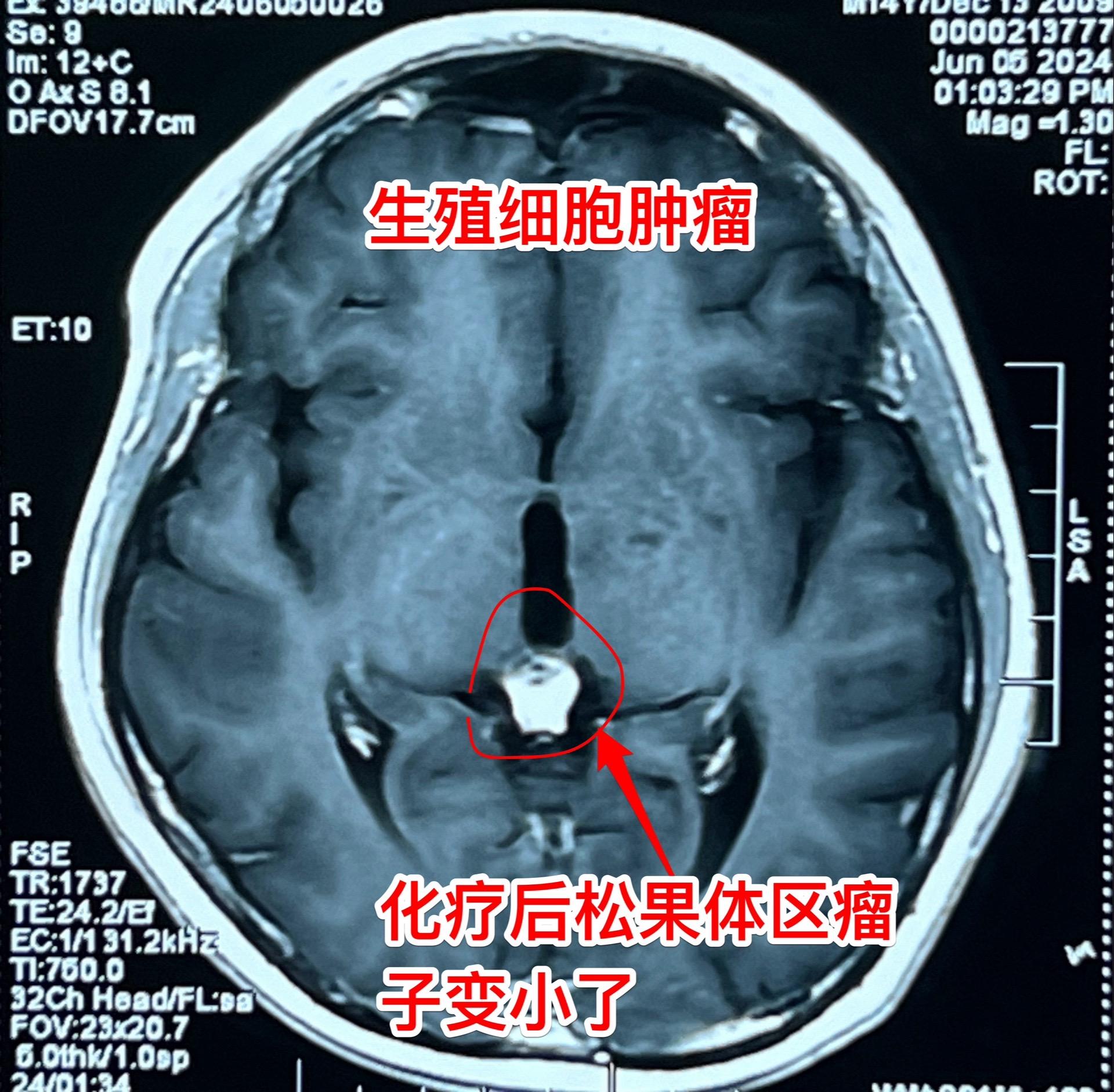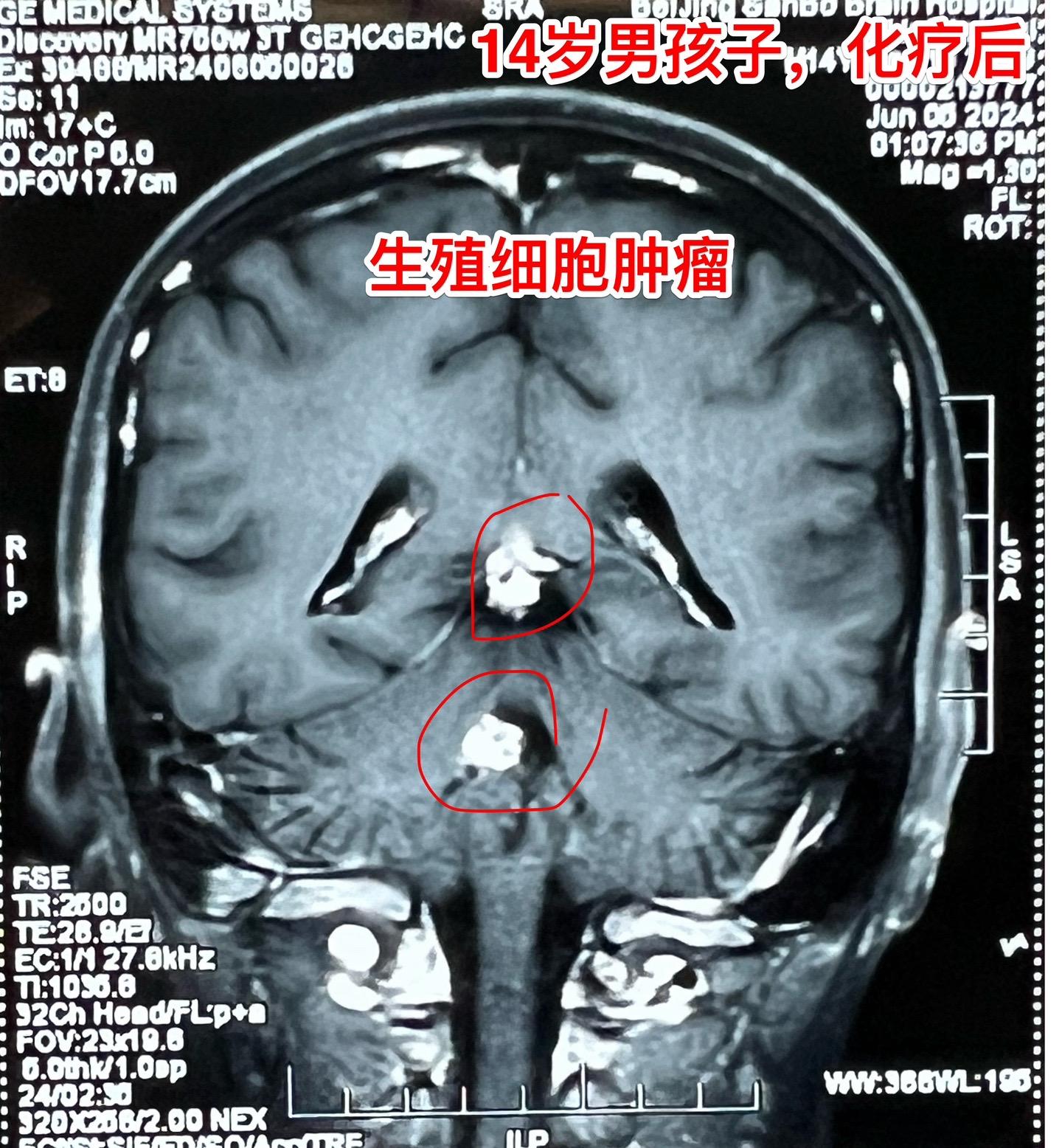 脑部生殖细胞肿瘤一般需要综合治疗。14岁广东省男孩子发现松果体区及第四脑室内多发肿瘤,怀疑是生殖细胞肿瘤。在广州市某医院作了两个疗程的化疗,松果体区的肿瘤明显变小了,但是第四脑室内的肿瘤体积却增大了!