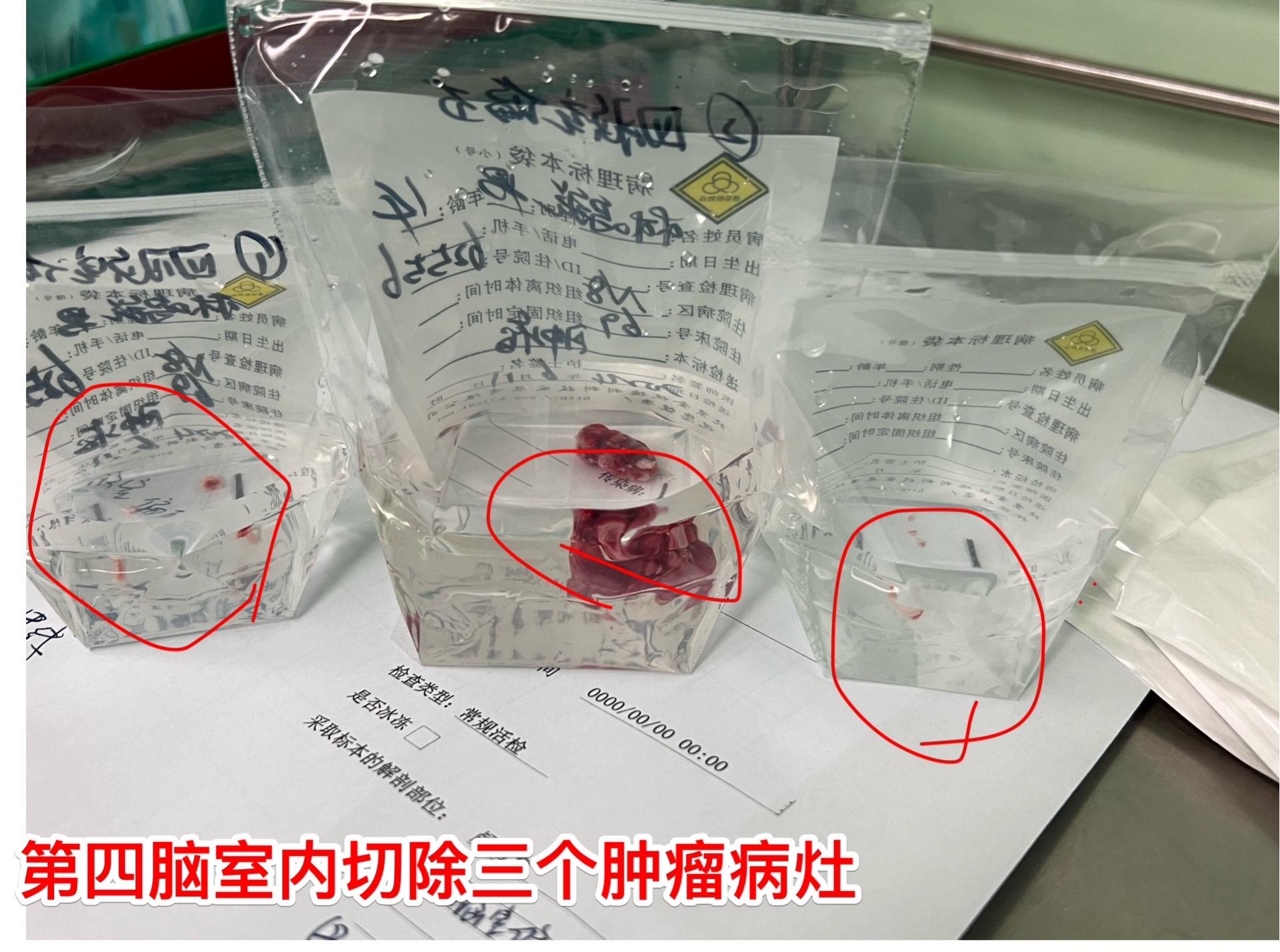 昨天为他作了开颅手术,看见第四脑室内的肿瘤病灶一共有四个,切除了三个,另一个经过化疗后似乎坏死了!等病理报告出来后还需要综合治疗。