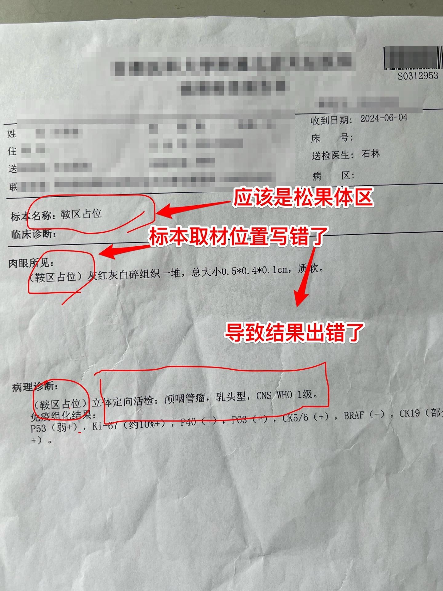 近两个月他记忆力差、爱睡觉、听力下降、视力下降。脑部磁共振显示松果体区肿瘤,在北京市某医院行肿瘤穿刺活检术,病理报告结果考虑是乳头型颅咽管瘤(活检标本标注为鞍区占位,可能误导了病理科医生,见图6)。