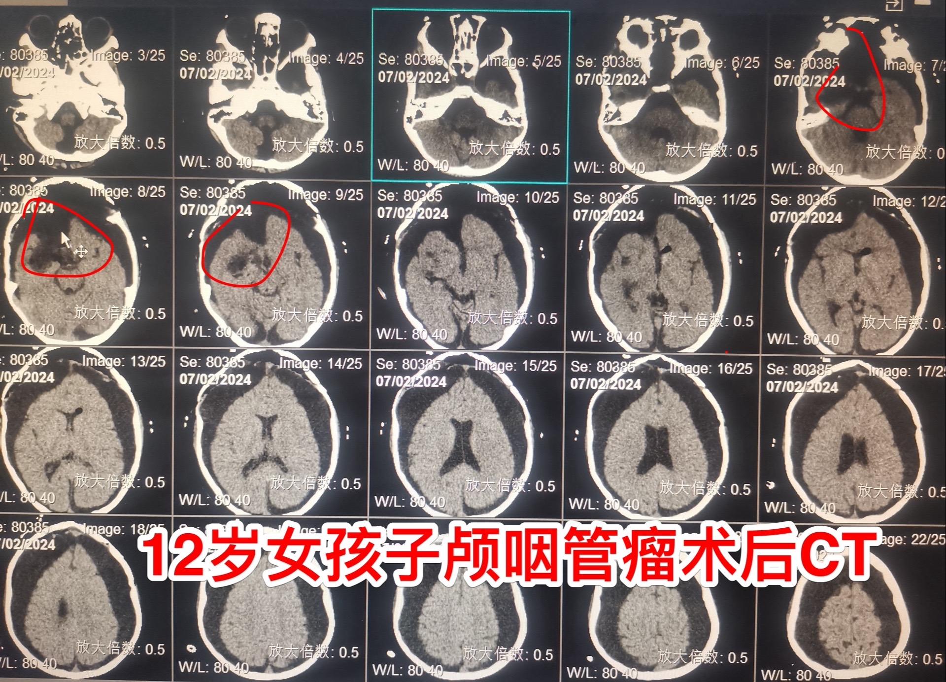 开颅手术+2次伽马刀治疗后颅咽管瘤复发。12岁的四川女孩子,5年前发现颅咽管瘤,在上海作过一次开颅手术,因颅咽管瘤残留先后作了两次伽马刀治疗。到三博脑科医院就诊时右眼已经失明了。 这样的颅咽管瘤属于难题中的难题! 肿瘤在增大,尽管切除肿瘤的难度大,我们不应该放弃,而是要积极再次手术,争取将肿瘤完全切除。 2024年7月2日作了开颅手术,将巨大肿瘤完全切除。