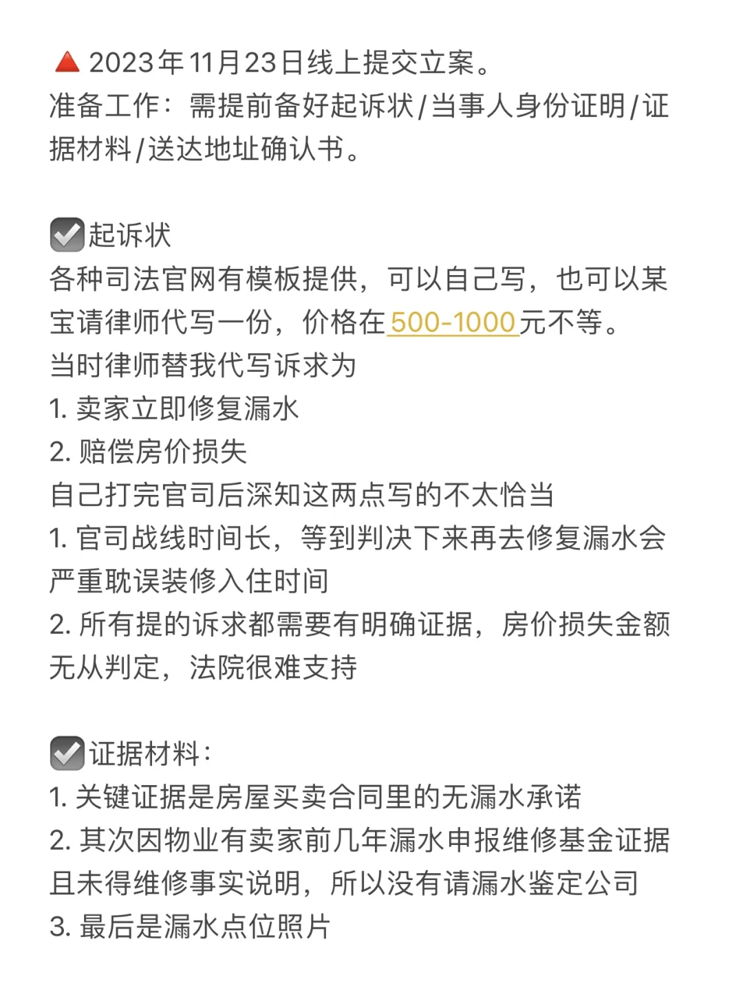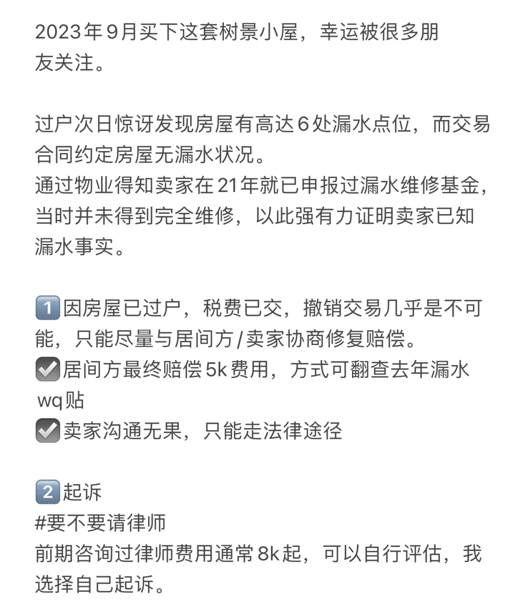 2023年9月买下这套树景小屋 幸运被很多朋友关注 过户次日惊讶发现房屋有高达6处漏水点位 而交易合同约定房屋无漏水状况 通过物业得知卖家在21年就已申报过漏水维修基金 当时并未得到完全维修 以此强有力证明卖家已知漏水事实 但最终与卖家协商无果 只能通过法律途径维护权益 后续见图文~ 写的不一定全部详细 如果大家有什么疑问或者类似经验可以评论区分享 后台每天都有很多朋友分享买到漏水房甚至危房 即使买家一百个心眼子盯着房子都抵不过卖家一个小心机的刻意隐瞒 买一套房不易 希望这个社会多点真诚吧[捂脸R]