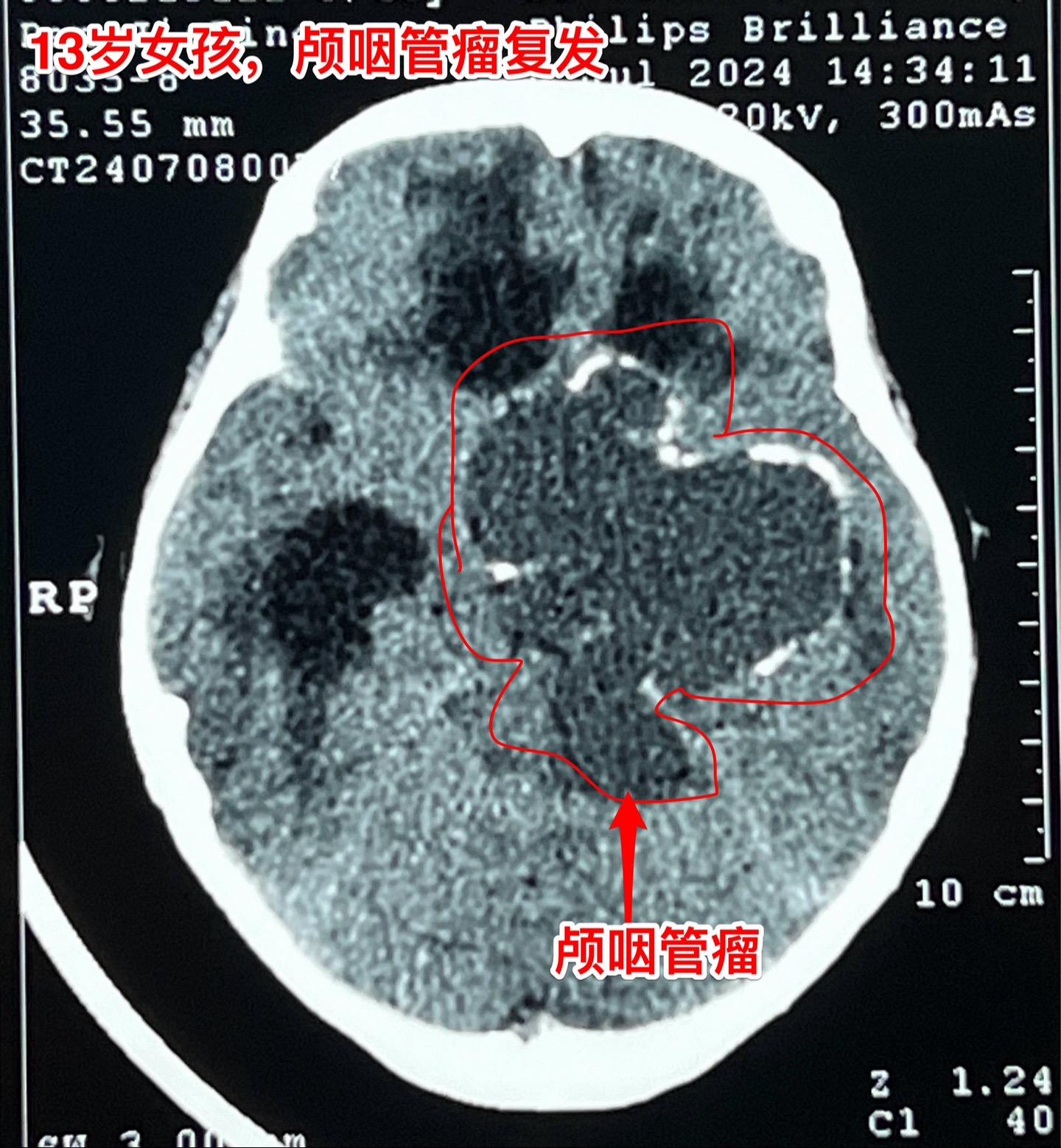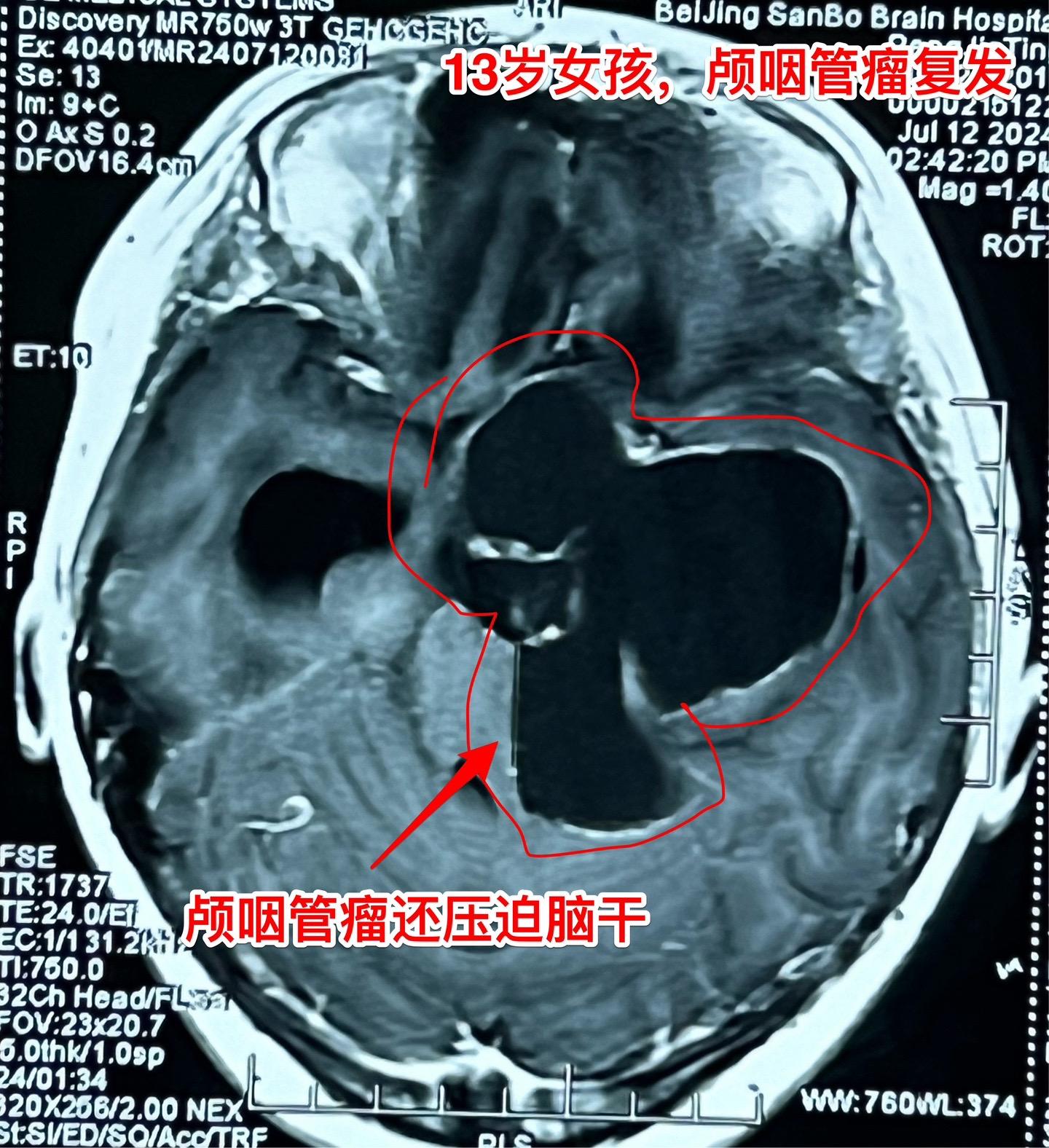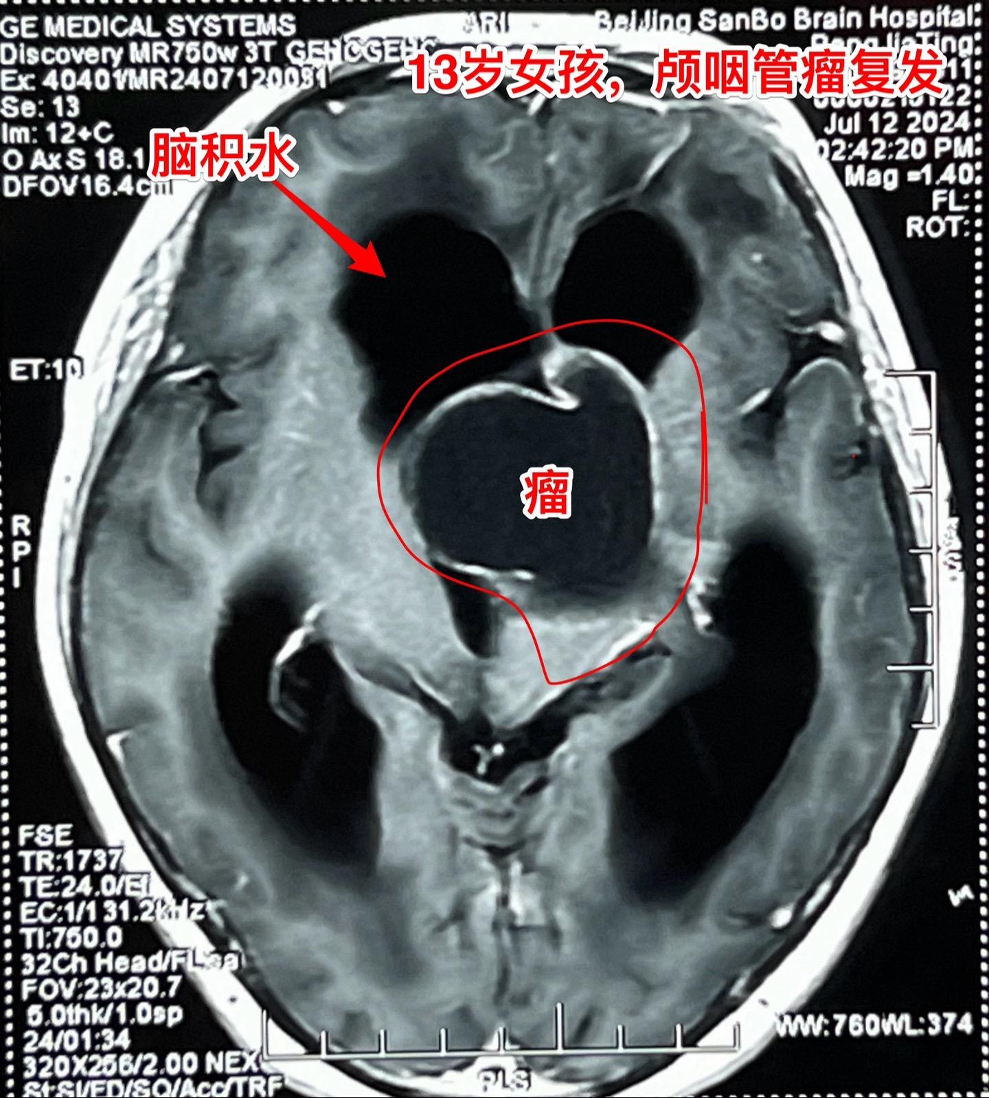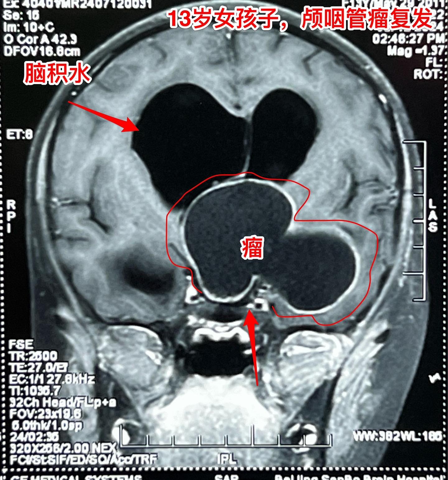 复发的巨大颅咽管瘤,难度很大。13岁四川女孩子,2022年6月在外院行开颅手术切除颅咽管瘤。半年后颅咽管瘤复发,家长采用中药治疗。中药控制颅咽管瘤的效果也不理想,肿瘤还在继续生长。