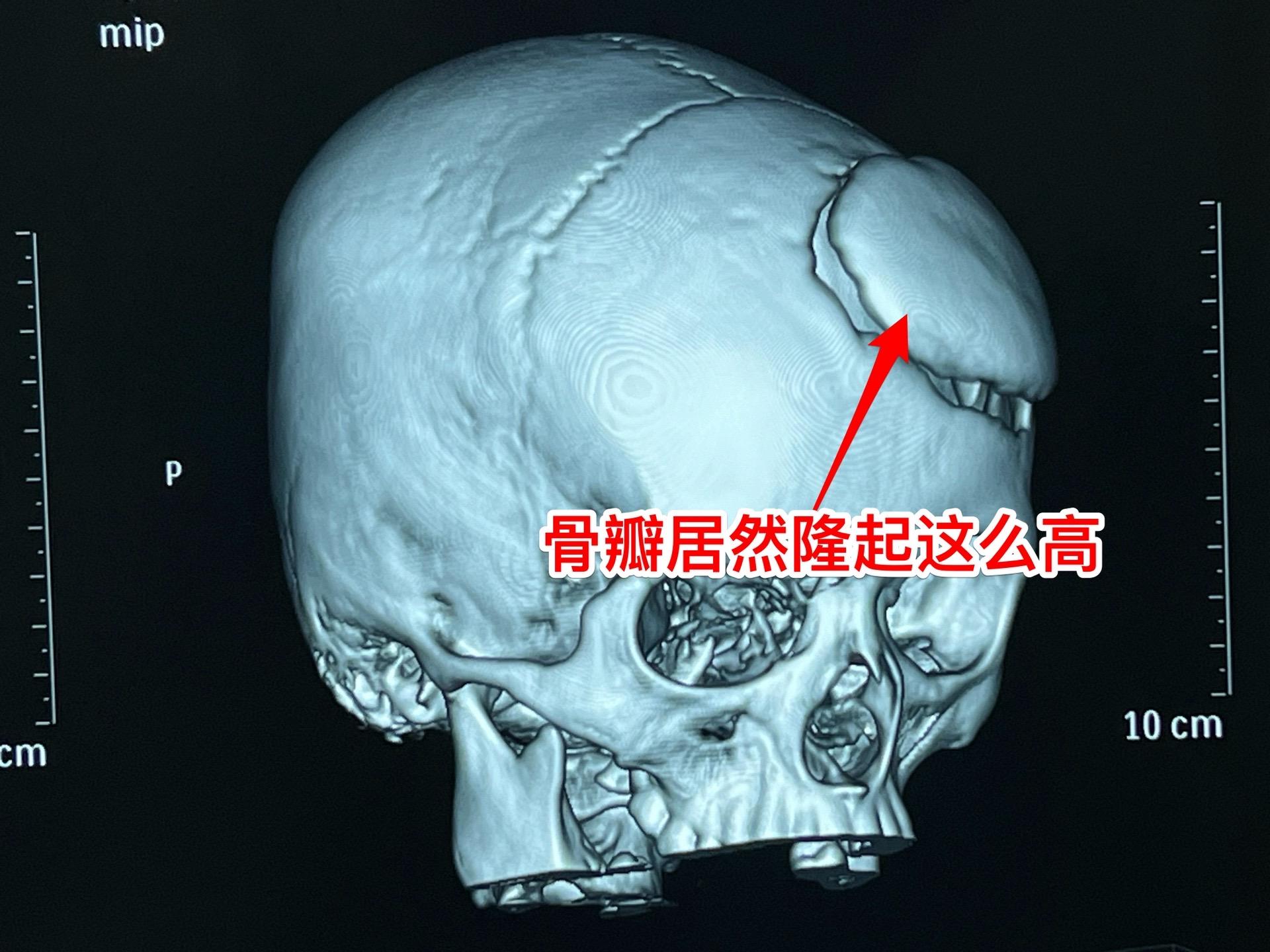 复发肿瘤体积越来越大,患儿曾经出现过头痛、呕吐、多睡症状。经过补充糖皮质激素后症状有好转。额部骨头逐渐出现隆起,见图4、5。