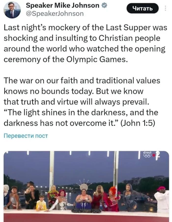 他这样写道:“昨晚对“最后的晚餐”的嘲讽令全世界观看奥运会开幕式的基督徒感到震惊和侮辱。
