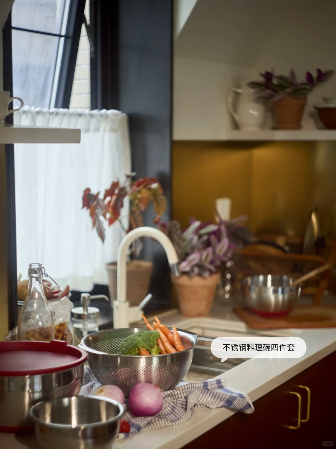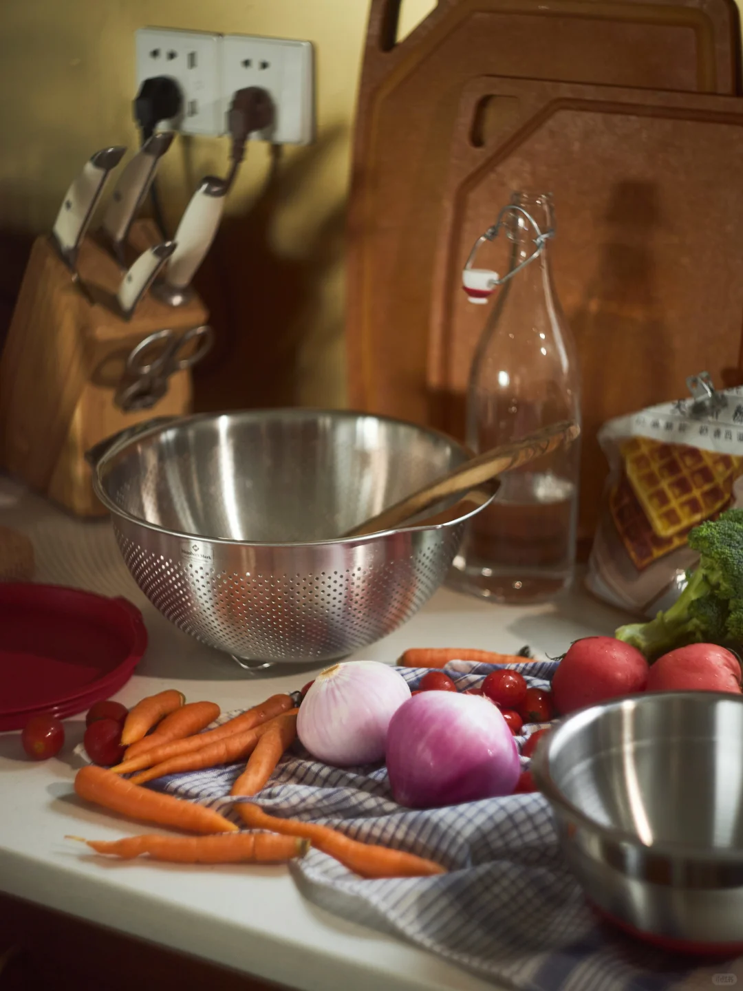从大到小的四件套,方便嵌套收纳;底部硅胶设计,还能防滑降噪;沥水篮的底部有支架,可以快速沥干。