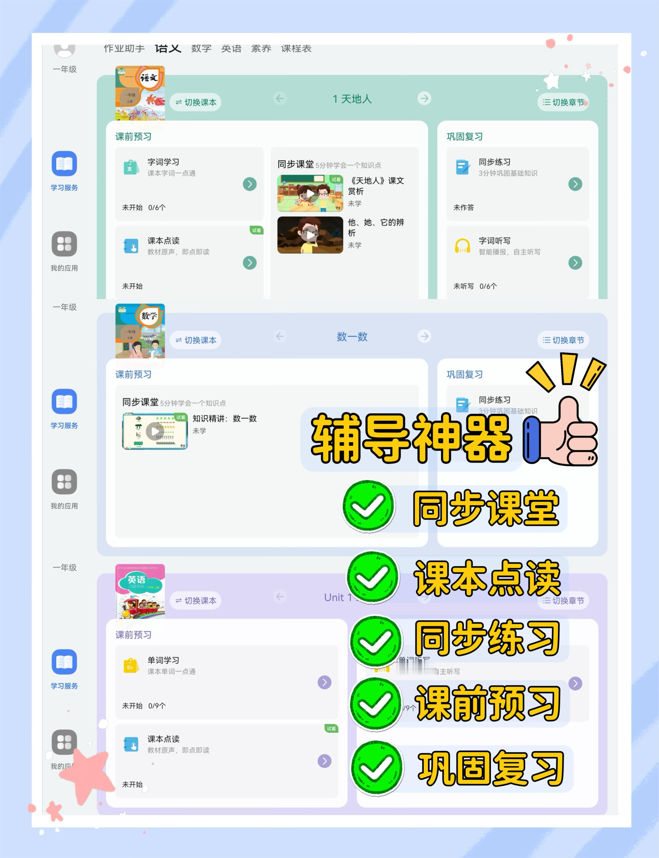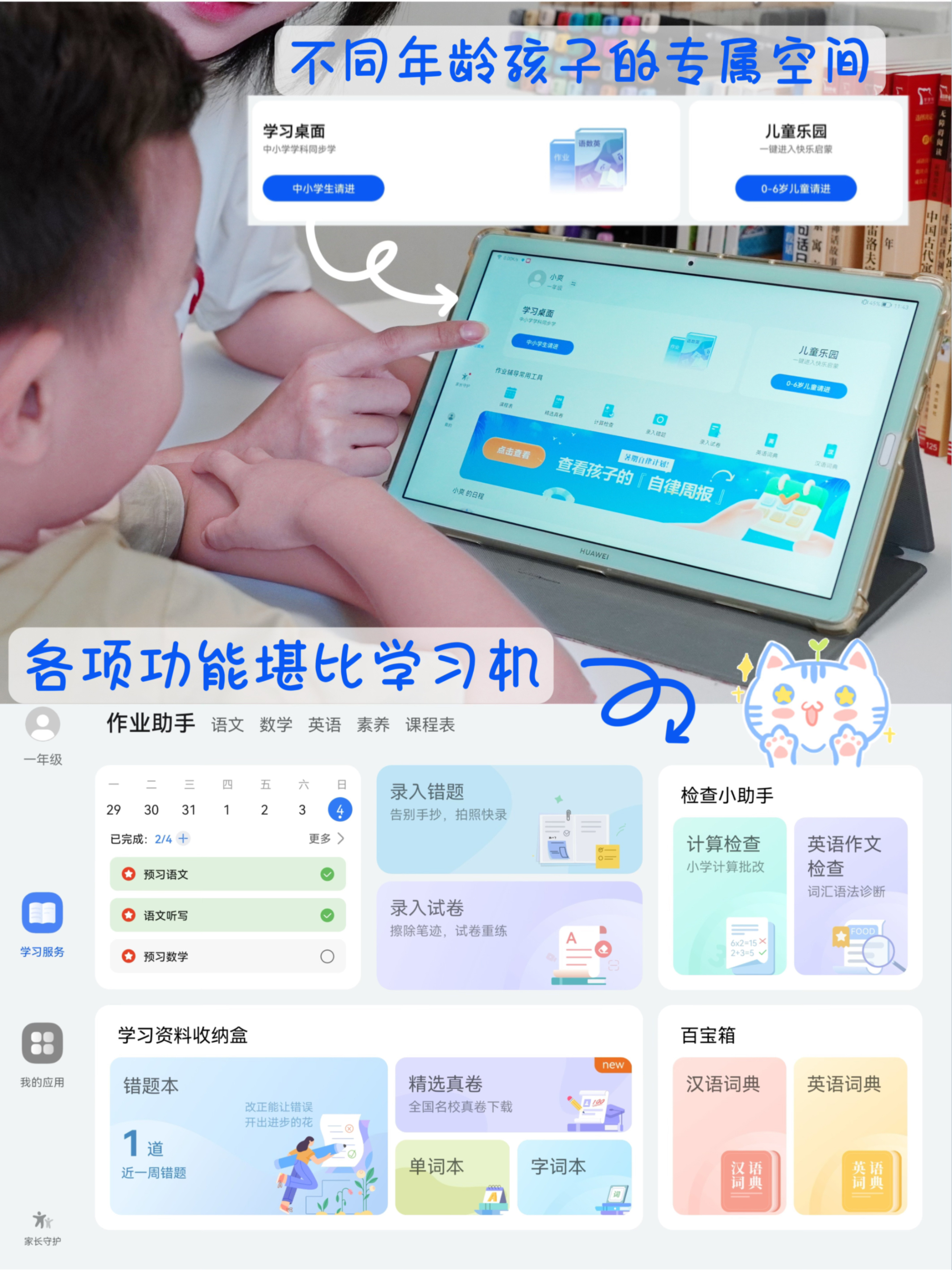 ⭐教育中心为不同年龄阶段的孩子提供了专属空间,为学龄前儿童设立了儿童乐园, 为中小学生配备了学习桌面。用过的家长们表示,在专属空间里丰富的学习服务和多种AI学习工具对孩子学习习惯培养才是最有帮助的~孩子进入学习桌面,同步学是能够帮助孩子更好的跟随学校教学节奏的学习服务,引导孩子养成预习复习好习惯 [赞啊] 像小爽这种刚步入一年级的小朋友,完全没有预习和复习的意识,借助同步学都能高效完成~还有作业助手中的错题本,精选真卷,计算检查等,也让小爽查漏补缺,提高学习效率!在中小学生的专属空间里,小爽和我一起规划每日学习任务和完成任务后的娱乐时间。完成任务后,小爽就能使用我允许的第三方应用~不得不说,如此全面的功能让我和小爽亲子关系更和谐了~~[二哈],