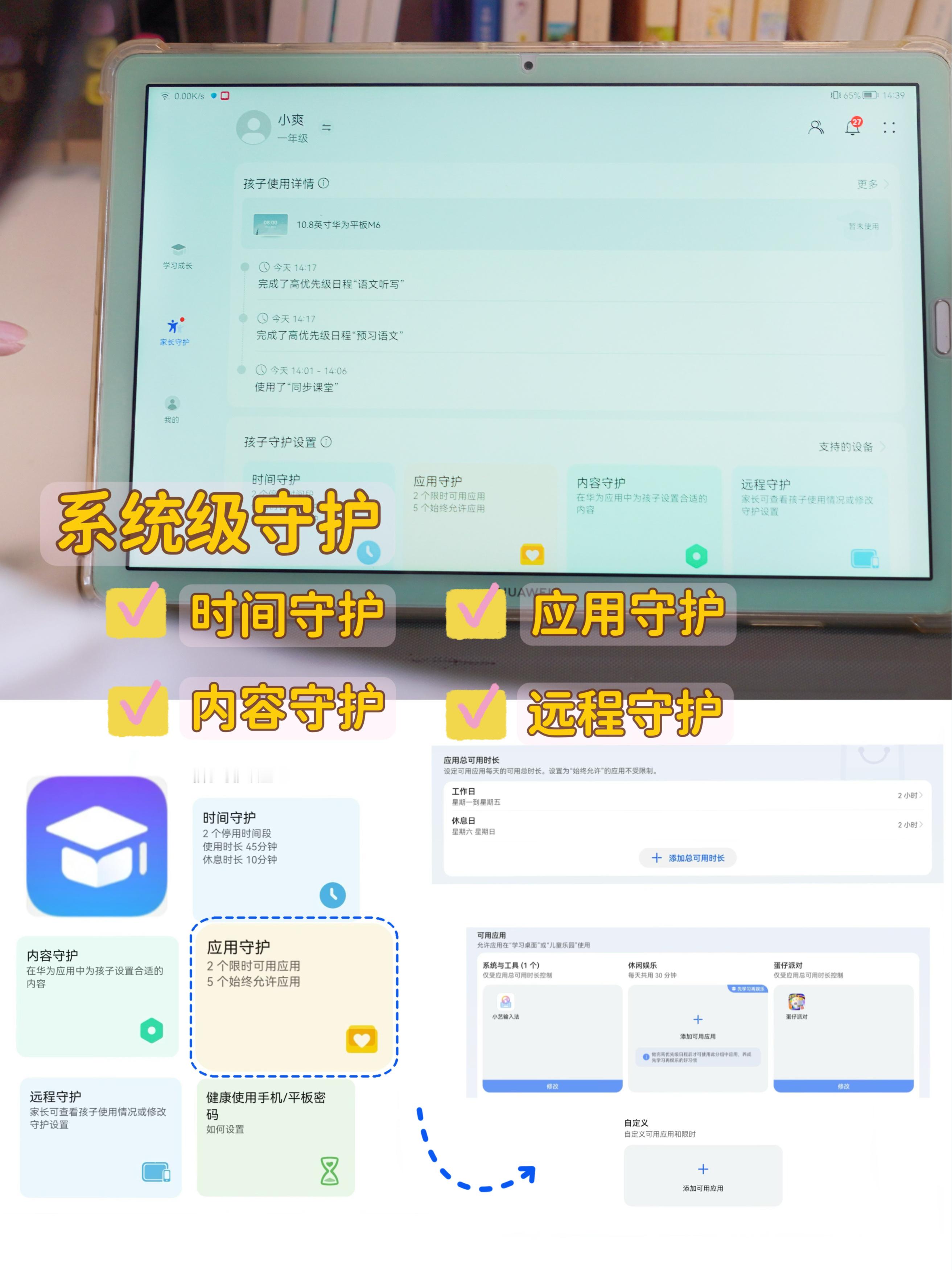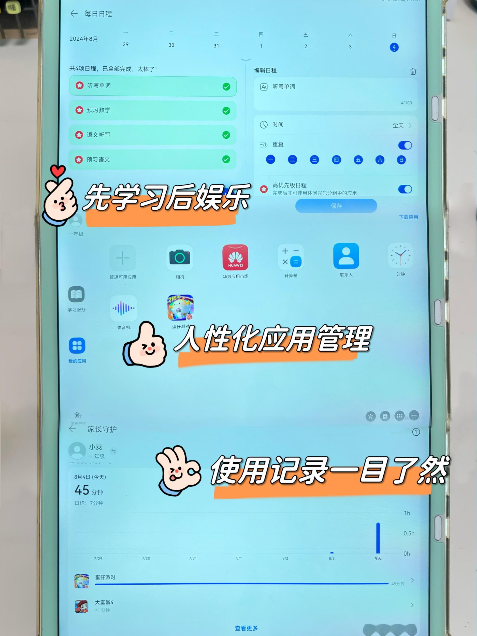 ⭐通过家长守护功能,家长可以轻松设置应用使用时长,合理规划孩子的作息时间。并通过应用分组管理功能,为孩子挑选合适的应用,设置学习与娱乐的时限,防止孩子过度沉迷视频、游戏。配合先学习后娱乐功能, 引导孩子主动学习自律娱乐好习惯,此外,即使在忙碌的工作中,也能通过手机端远程查看孩子的学习状态和报告,及时调整守护规则,让教育更便捷安心。家长还可以通过设置管理密码,避免孩子随意退出或修改规则。当孩子进入专属空间即可享受全方面的守护~这绝对是家长们必备的应用之一!