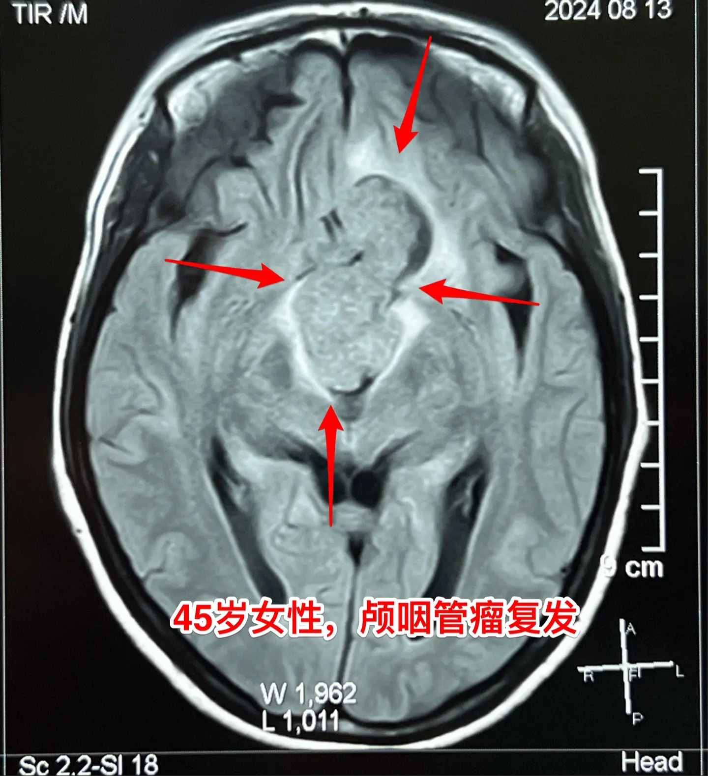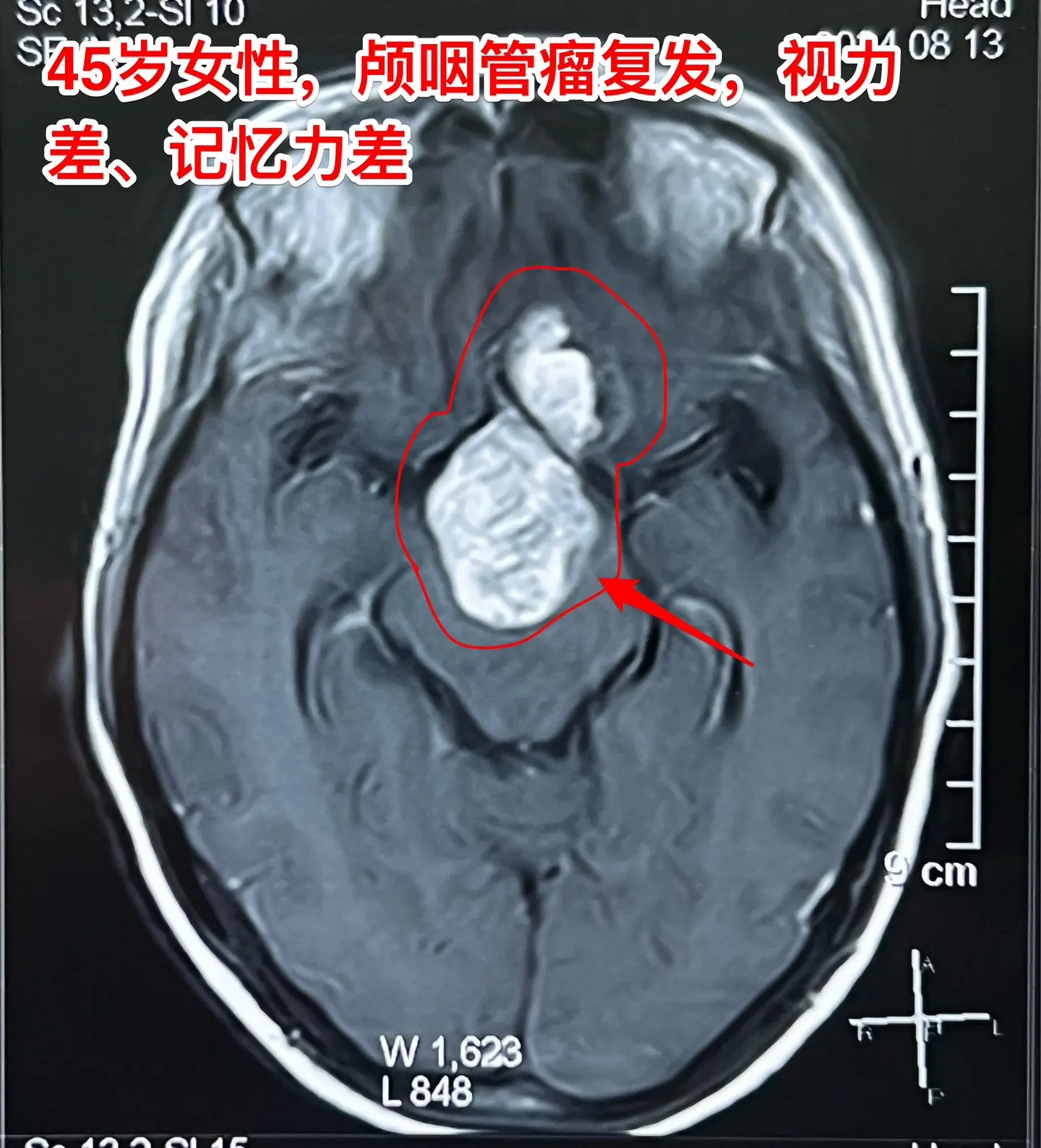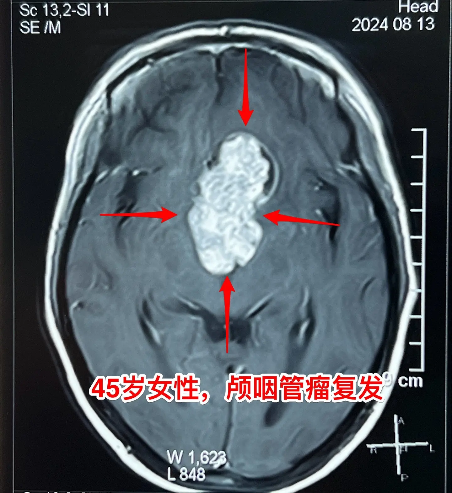 巨大的颅咽管瘤。45岁浙江女性,在外院作了颅咽管瘤手术不到一年,作磁共...