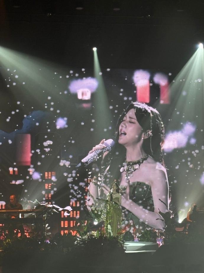 刘亦菲这一身衣服太丑了,用花挡住了才觉得好一点,全靠脸撑着