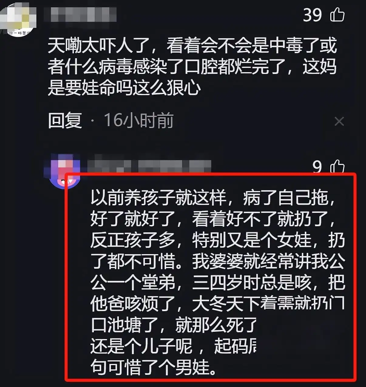 此事引发了热议。有网友说:“天哪!这要在国外,早就被剥夺监护权了!孩子得疼成什么样啊,不敢想象。不爱孩子就不要生。”也有网友说:“医院不让告诉孕妇孩子性别,很多都是生下来了才发现不是自己想要的。我倒希望怀孕的时候性别可以透明,这样可以少很多悲剧!比如这个女孩!”还有网友质疑这位妈妈是否真的关心孩子:“赚钱不就是为了孩子吗?为什么要让孩子遭这样的罪呢?”