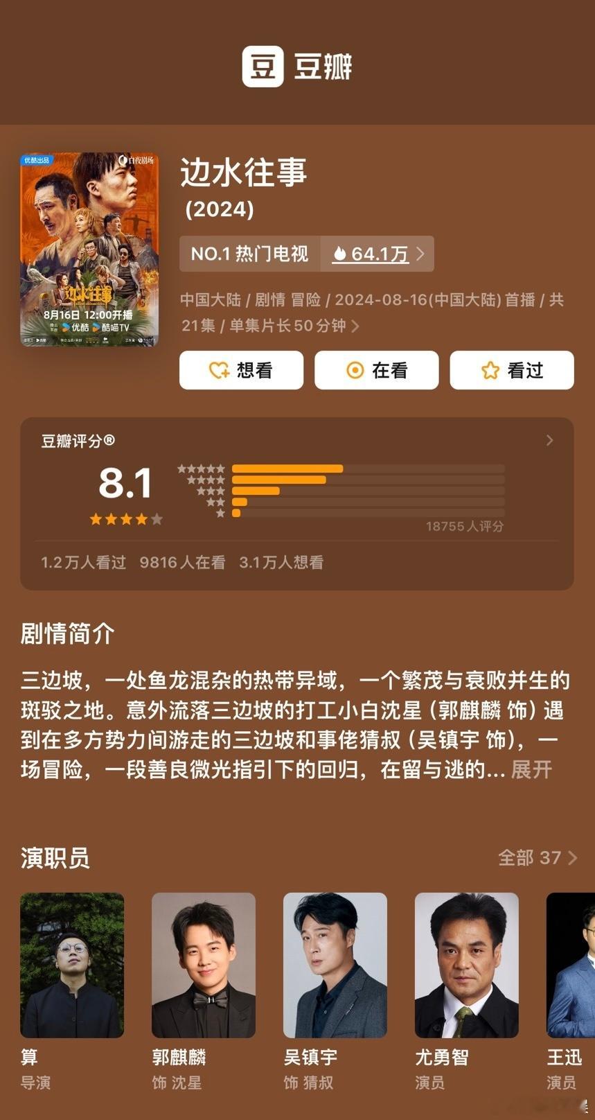 #边水往事豆瓣开分8.1# 这部剧的精彩之处在于悬念的开篇、巧妙的剧情和出色的演员,追了十几集后还期待着后续的发展。