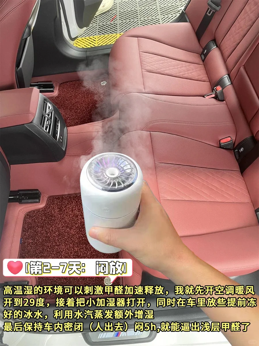 高温湿的环境可以刺激甲醛加速释放,我就先开空调暖风开到29度,接着把小加湿器打开,同时在车里放些提前冻好的冰水,利用水汽蒸发额外增湿💦