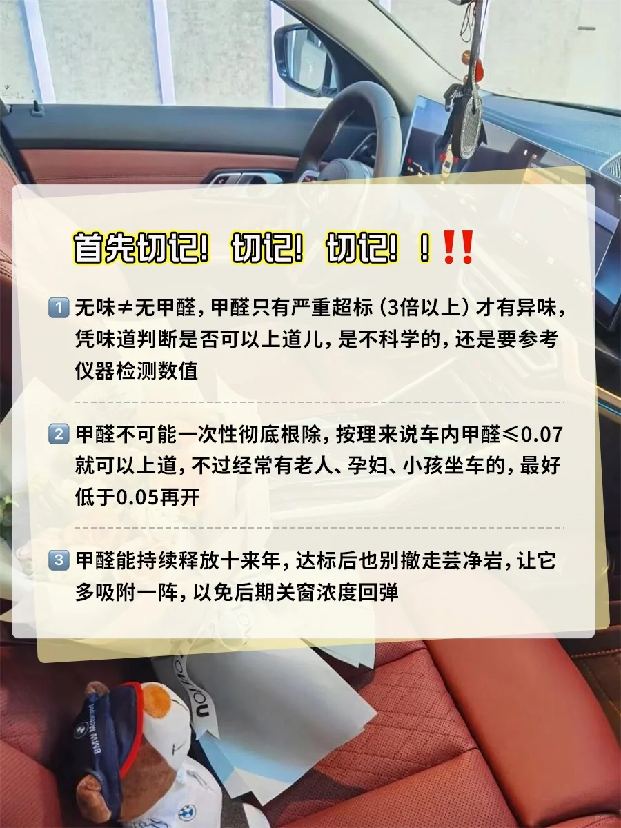 ②甲醛不可能一次性彻底根除,按理来说车内甲醛≤0.07就可以上道,不过经常有老人、小孩坐车的,最好低于0.05再开