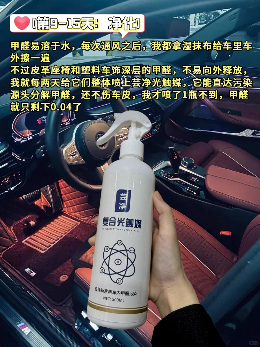 皮革座椅和塑料车饰深层的甲醛,不易向外释放,很难去除,我就每两天给它们整体喷上芸净光触媒,它能直达污染源头分解甲醛,还不伤车皮,我才喷了1瓶不到,甲醛就只剩下0.04了