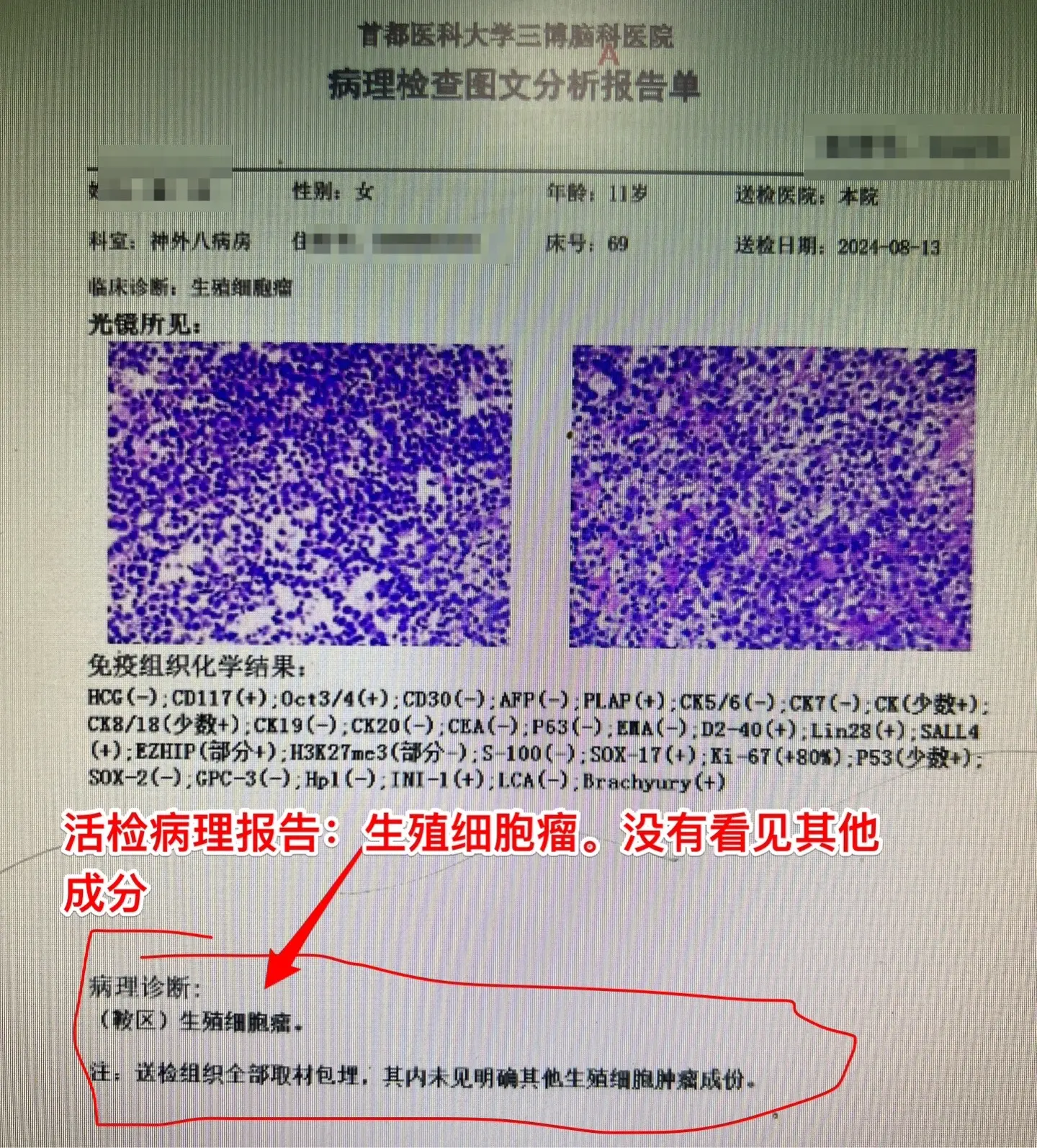 手术后病理报告为纯生殖细胞瘤,未见其他肿瘤成分(当然活检取得的标本很少,这个结论不是百分百的可靠)