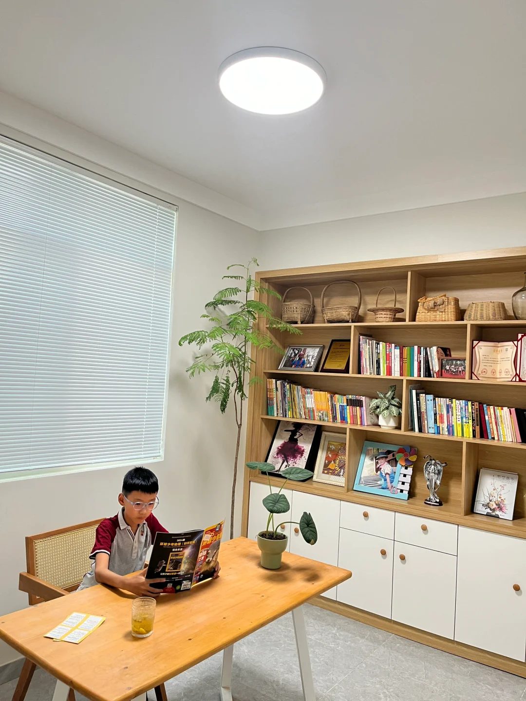 🌱我家花30万在农村的自建房 🌱房子的建筑面积是120平米 🌱四室一厅一厨一卫 很庆幸当初自己没有听老爸的,把客房改为了书房,客人不会经常来,但书房孩子每周都要读书学习,一个独立的书房可以让孩子专心学习 以前没有注意光源问题,自从我家孩子近视后,我对灯光就要求比较高,做了一些功课后,给书房安装了美的Lunar护眼吸顶灯,选择这款灯,我主要被它的这几点所吸引: 1、36mm超薄设计,灯体近似隐形,与我家吊顶完美融合,安上后我家10平米的书房更显大 2、它是全光谱吸顶灯,接近自然光,Ra98高显指,更能还原物体的真实色彩,没有蓝光危害,还防眩晕,甚至优于教室的照明标准,孩子长时间学习最担心的就是眼睛疲劳,度数增加,换了它之后,让我安心很多 3、加厚航空铝材一体成型的全封闭灯体结构,防潮、防尘、防蚊虫,不用担心里面会进蚊虫,打理起来比之前的灯方便多了 4、采用高效率的高亮灯珠,48w的功率流明就能达到3120lm,提高光效的同时也更省电 5、直接打开美的Homlux小程序就能随时随地随心控制开关、调整亮度和色温,非常方便,不用下载新的APP,麻烦也占内存 最近要购买吸顶灯的宝子,推荐我家使用的这款,美的是大品牌,品质值得信赖,在满足孩子读书学习的同时,日常照明功能也能满足