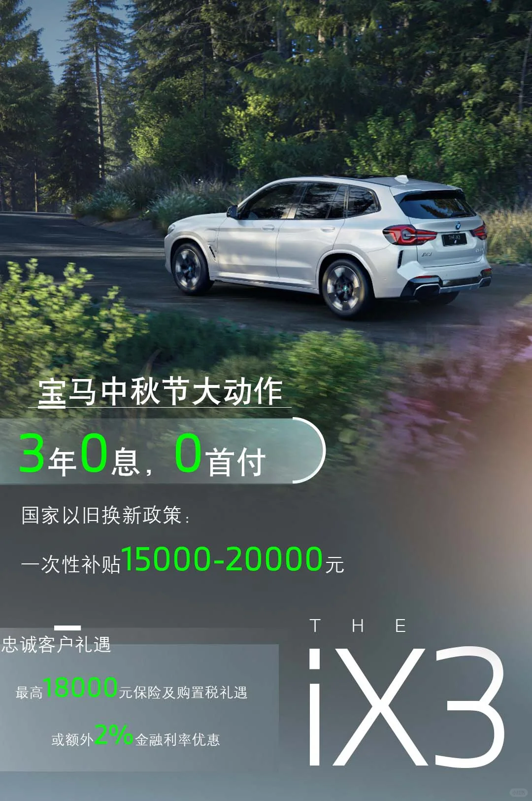 [星R]金九银十,又到了丰收的季节, [黄金薯R]这个9月,宝马让你收获满满。 【福利一】 如您符合国家以旧换新补贴政策要求,购买BMW车型可享受一次性补贴15000元~20000元。 【福利二】 忠诚客户礼遇,最高18000元保险及购置税礼遇或额外2%金融利率优惠。 【福利三】 金融礼遇,众多车型可享3年0息、0首付。 【福利四】 纯电车型礼遇,购买纯电车型可享2000 BMW会员积分/台。 【福利五】 188元尽享10800精品礼包,BMW 3系/X3车型还可享厂家保养礼遇。 [飞吻R][飞吻R][飞吻R]纯电动BMW iX3完全符合上述的政策哈,它线条锐利、轮廓充满张力,车身多处蓝色元素,彰显其鲜明的纯电内核;内饰运用精致的Sensatec 2.0皮革与金属装饰搭配,主打舒适体验座椅,尽享豪华感官之悦;在动力发面更是无可挑剔,纯电续航540公里,百公里提速6.8秒,让您旅程不再焦虑! 总之,你永远可以相信宝马宠粉的实力,9月这波大羊毛抓紧薅起来吧[鼓掌R][鼓掌R][鼓掌R]