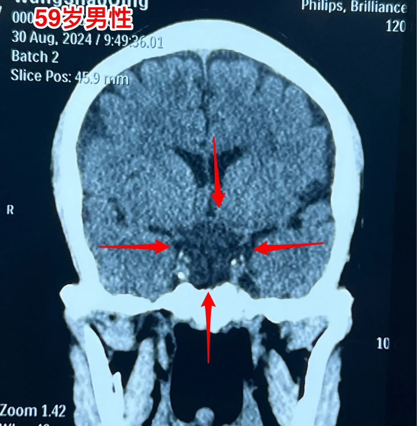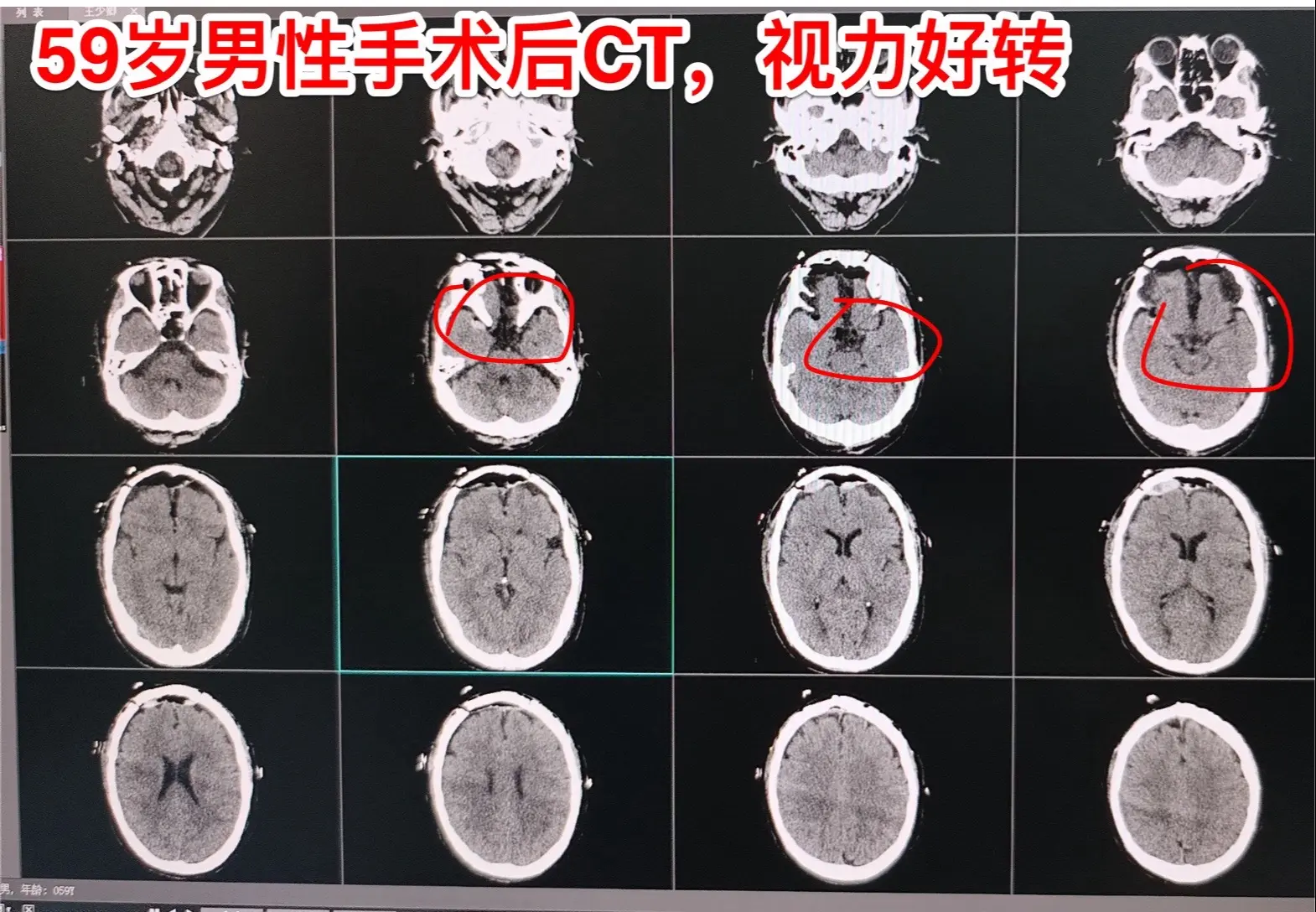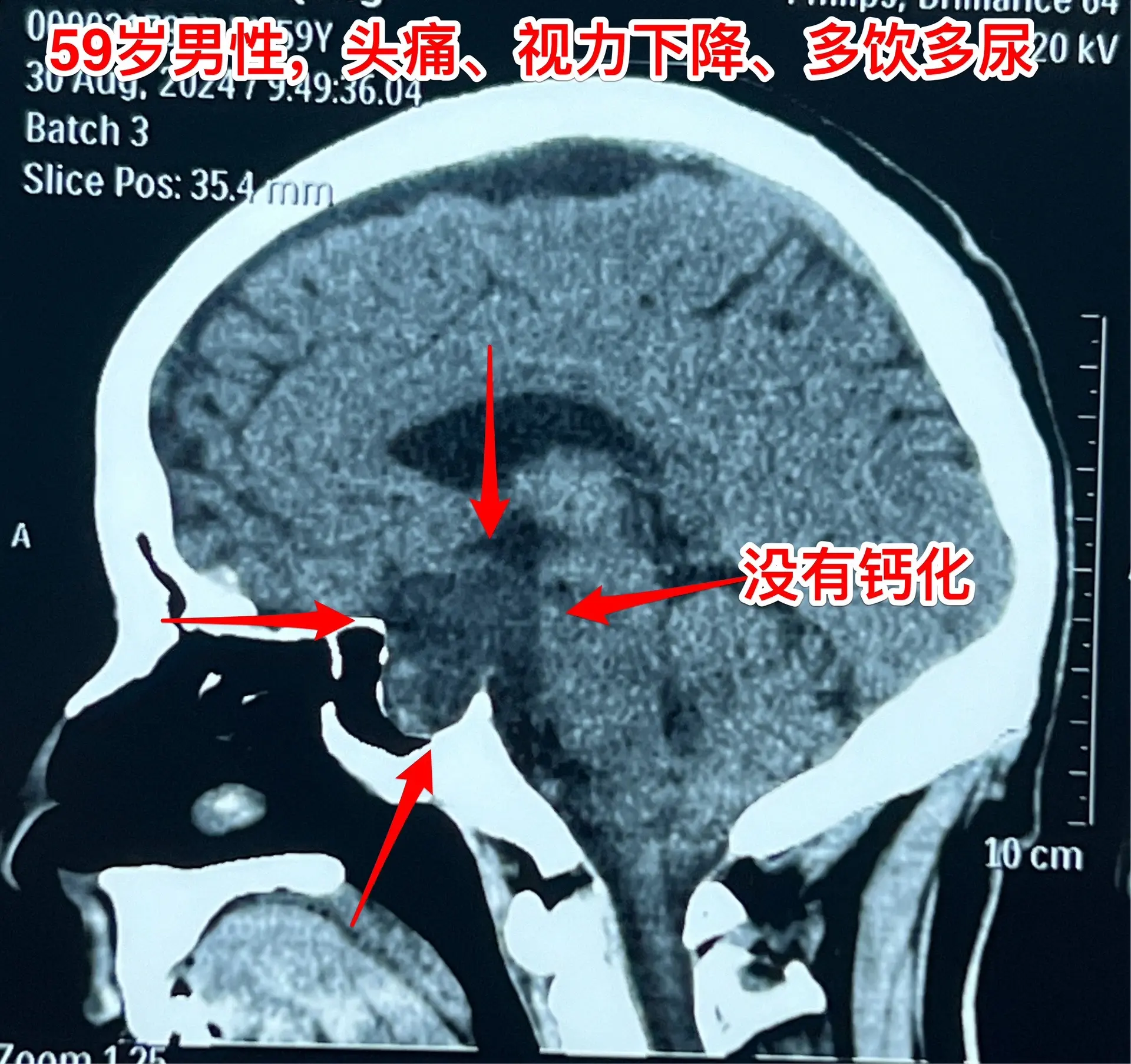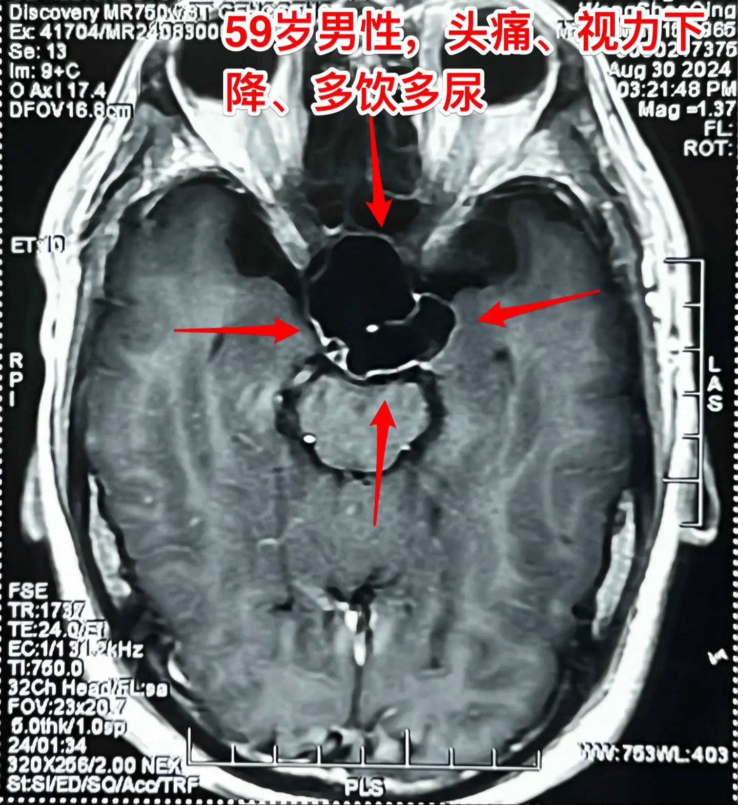 2024.8.23到医院就诊,作头部磁共振发现颅咽管瘤。2024.9.5在我科行开颅手术切除颅咽管瘤。手术中发现肿瘤是囊性的,内壁有瘤结节,没有钙化,所以是乳头型颅咽管瘤,肿瘤得到完全切除。手术后双眼视力显著改善。(今年的第133例颅咽管瘤)
