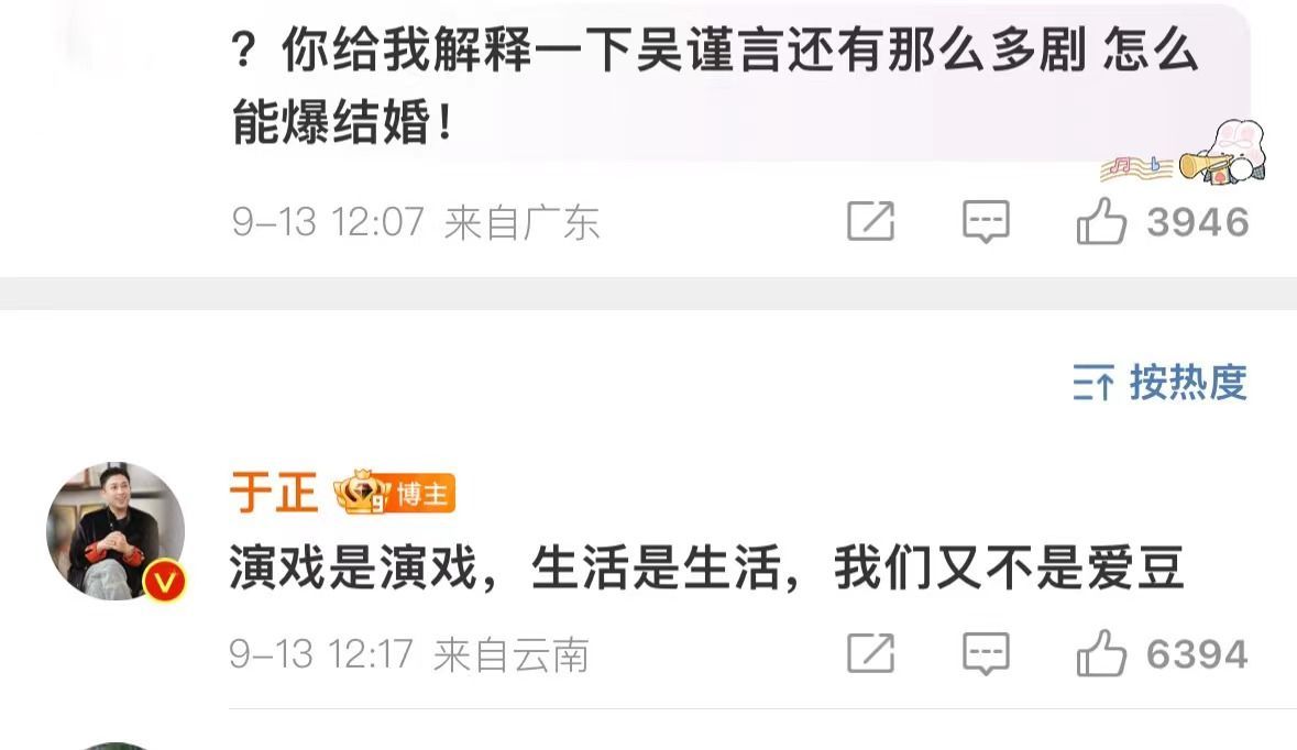 #于正说演戏是演戏生活是生活##于正说只是没把别人隐私告诉你们#于妈又开始在评论区开大了,面对网友们的质疑他说:“只是不想把别人的隐私告诉你们”、“演戏是演戏,生活是生活”。