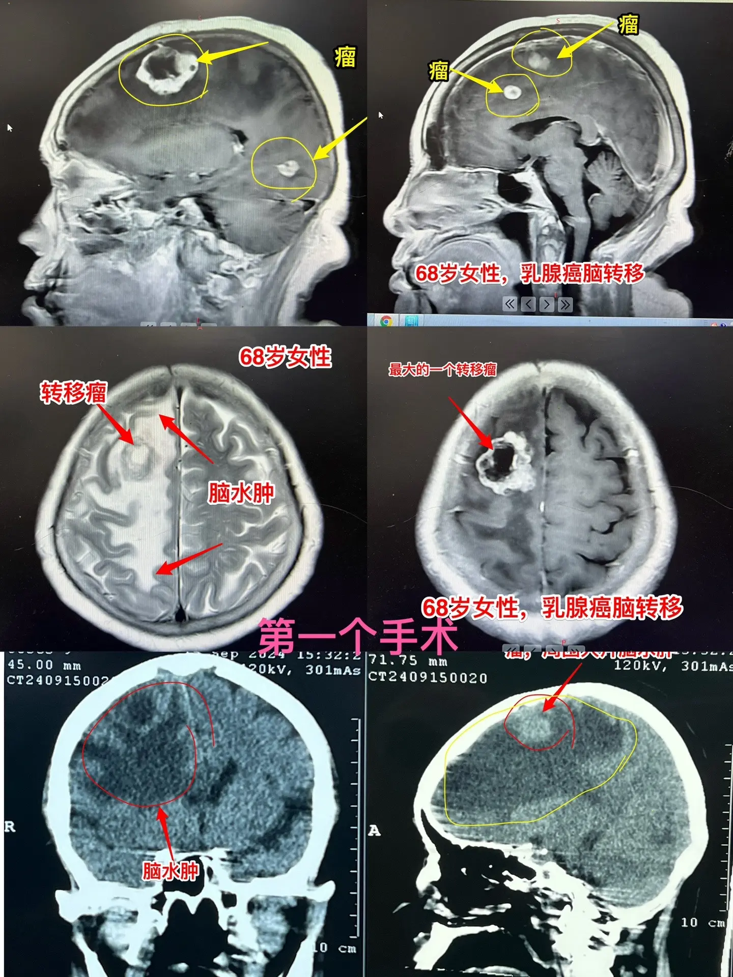 第一个是68岁女病人,乳腺癌脑转移。左侧偏身活动无力,脑部有三个转移瘤,切除了其中的两个,剩下的那一个最好用伽马刀来解决,病人会轻松点,毕竟是高龄老人。