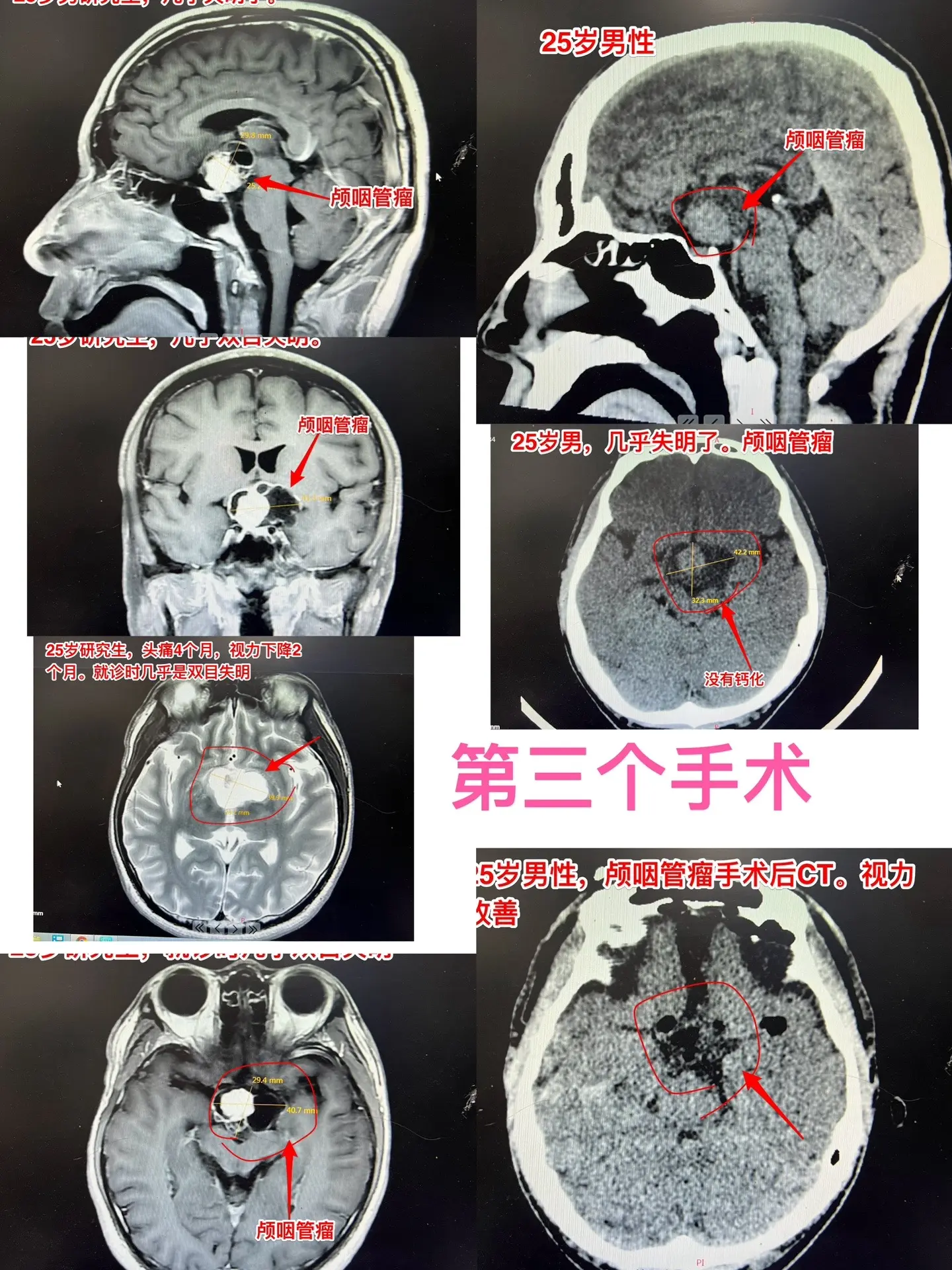 第三个结束的是25岁的医科大学研究生,刚刚毕业,颅咽管瘤。在两个月时间内视力下降,到看我的门诊时双眼只有光感!赶紧收住院,赶紧作手术。昨日手术很顺利,今天病人说视力在好转!