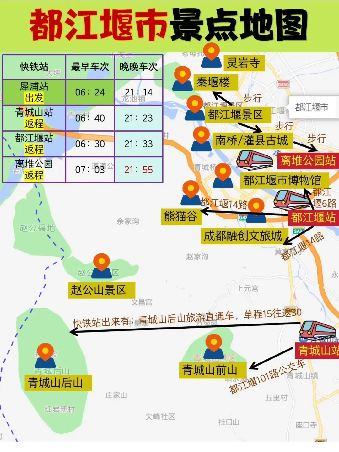 🚄高铁:坐地铁2号线到犀浦站,再换乘动车30min到离堆公园站/或者青城山站(票价10💰)