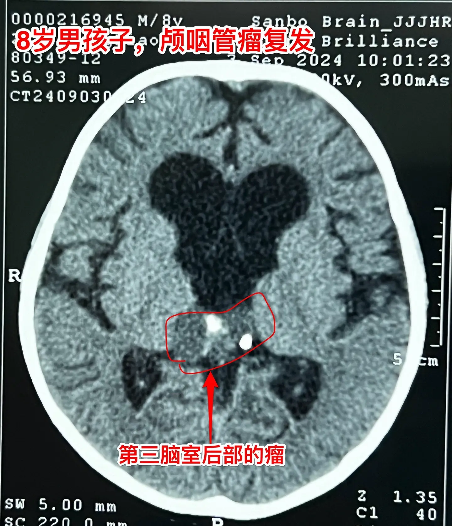 2024.7复查磁共振显示第三脑室后部肿瘤复发,当时小孩子没有任何症状,找我咨询,我建议先观察。2024.9小孩子出现视物模糊、眼球活动障碍,复查磁共振显示第三脑室后部的肿瘤体积增大了,不得不接受手术治疗。住院后作CT发现肿瘤不单单是在第三脑室后部,鞍区及鞍上均发现散在的钙化。这就提示残留的肿瘤远不止一处。
