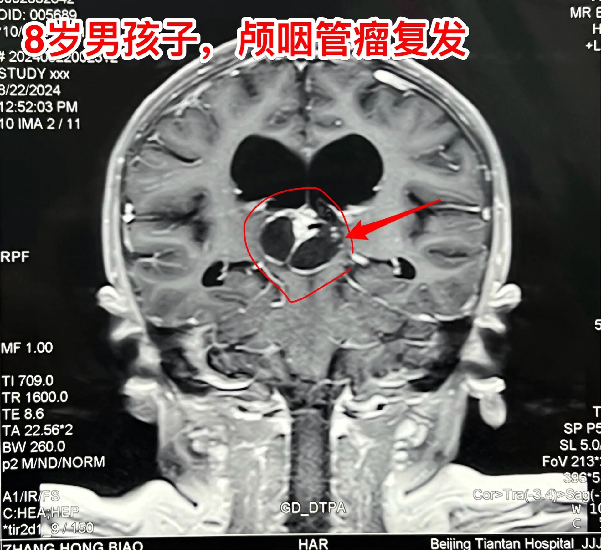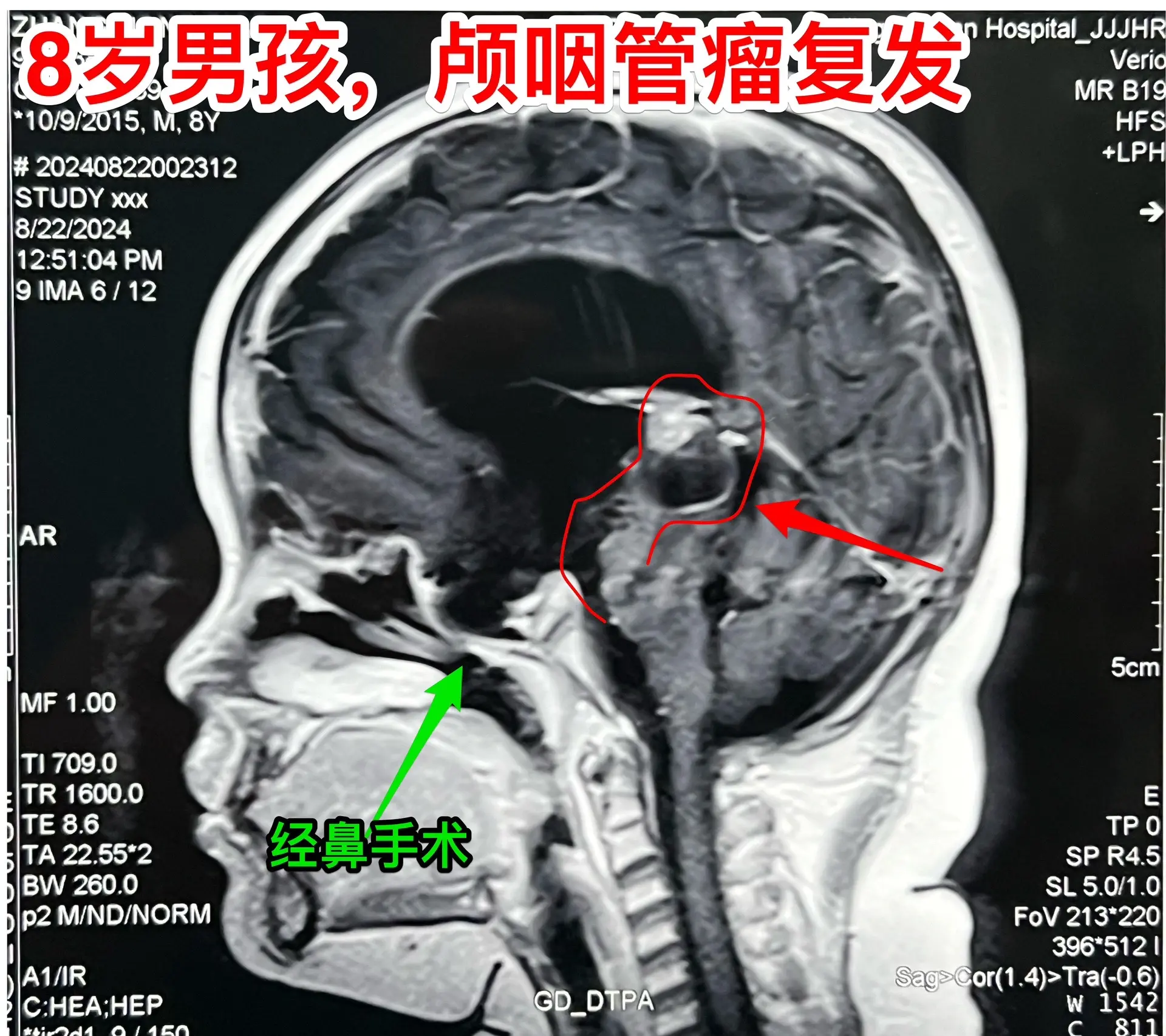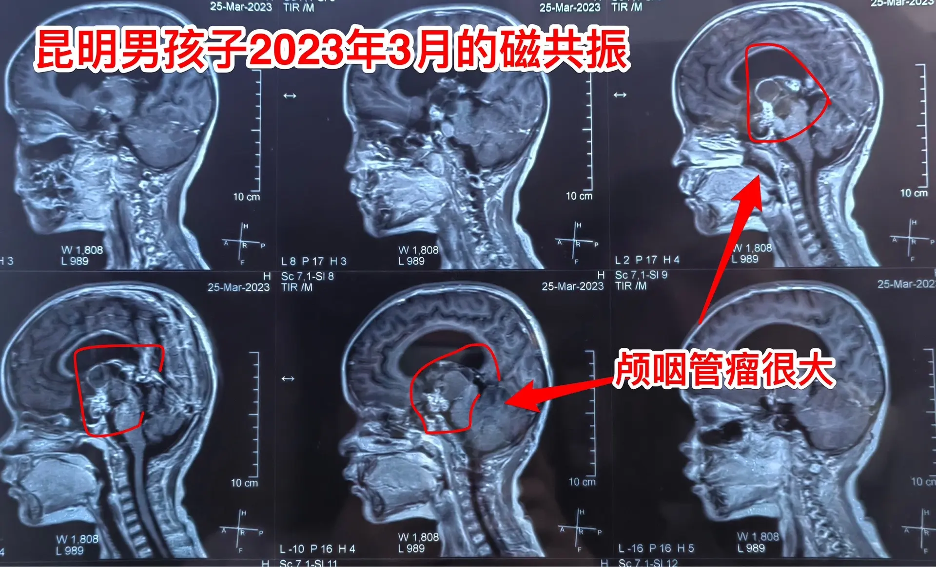 昆明男孩在14个月时间内两次大手术。昆明的8岁男孩子,2023.3在昆明发现颅咽管瘤,体积很大。这样的肿瘤想切干净是很有难度的。2023.7.1在北京市某医院作了经鼻手术,当时告知家长肿瘤得到完全切除。
