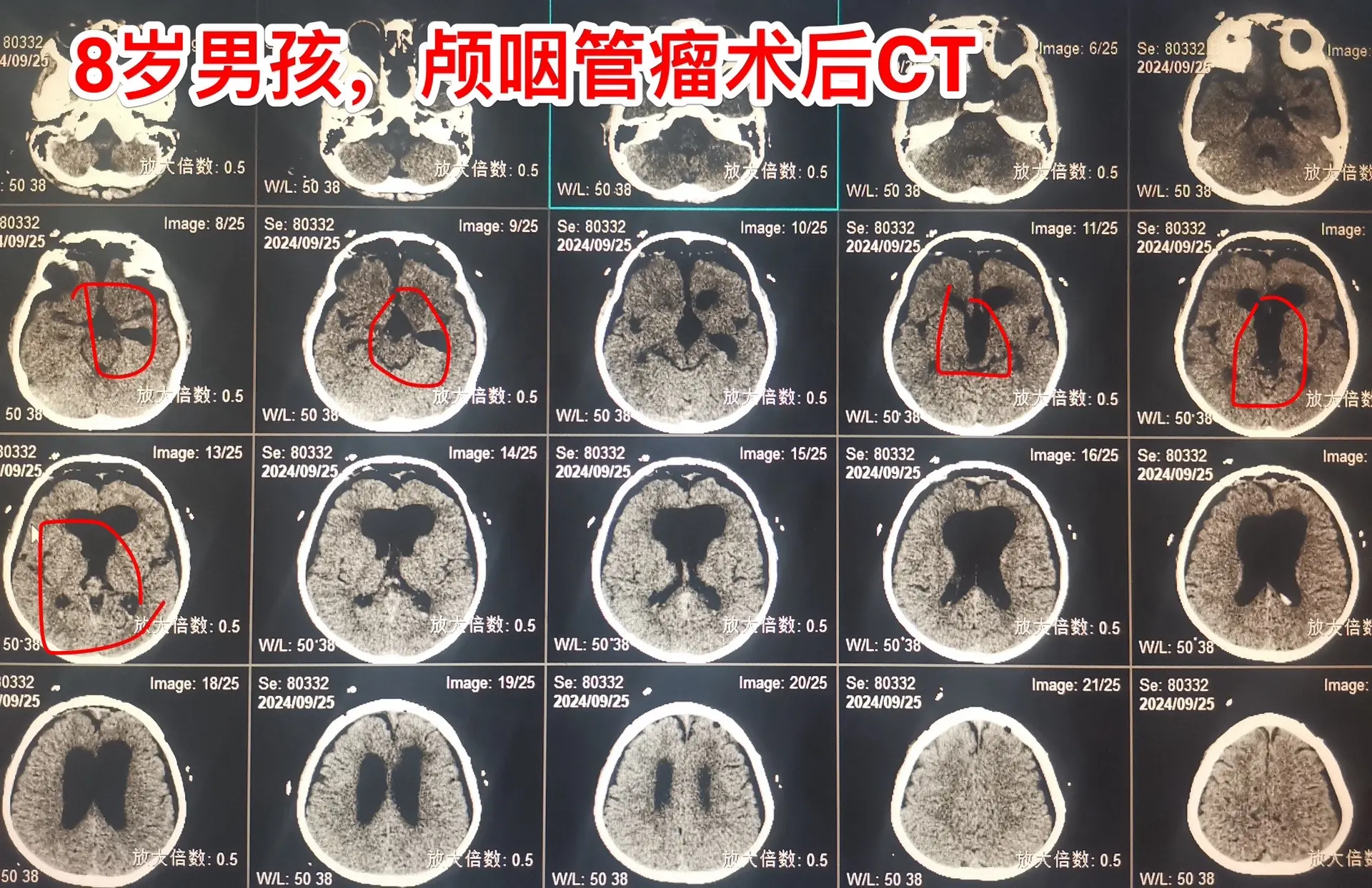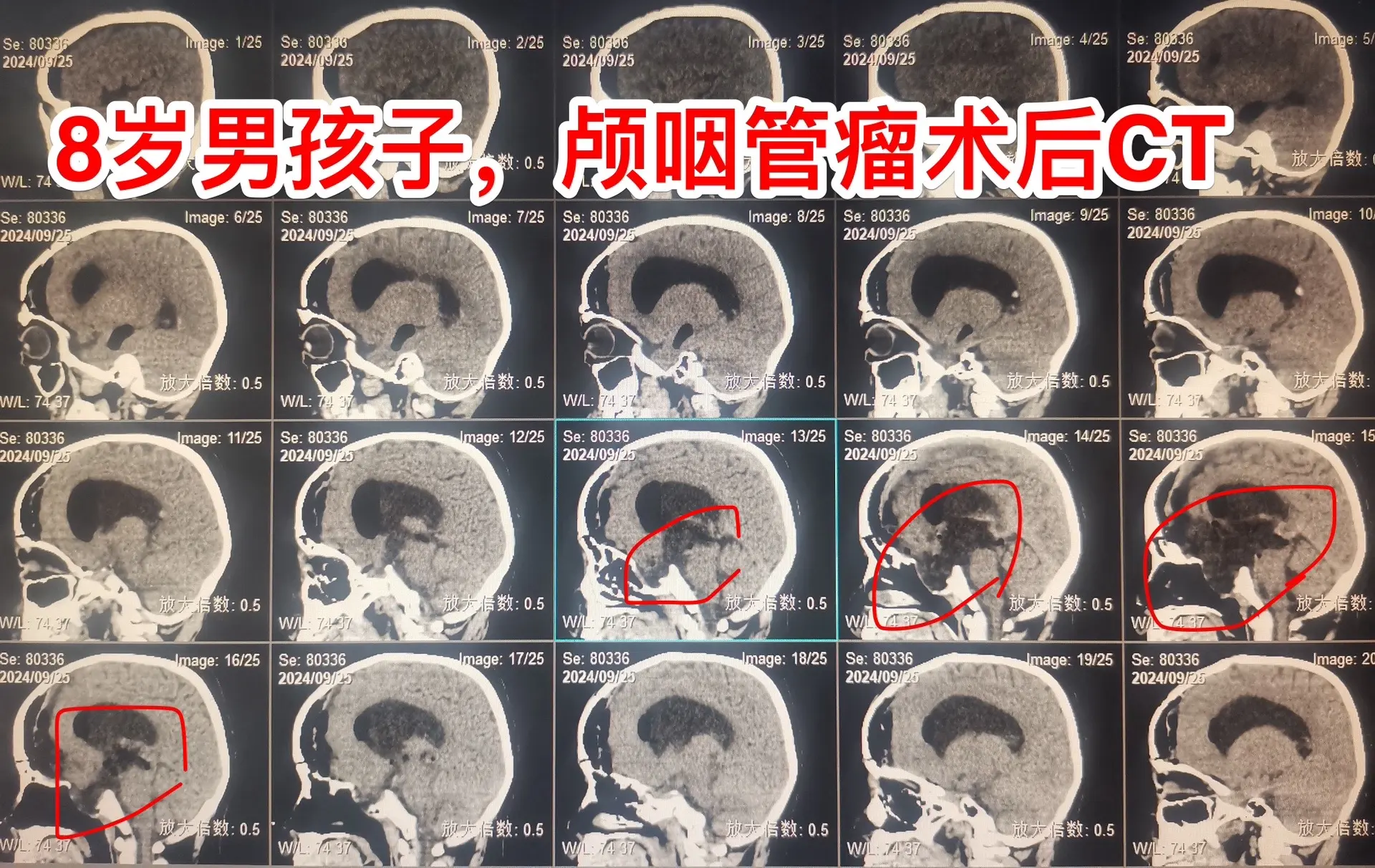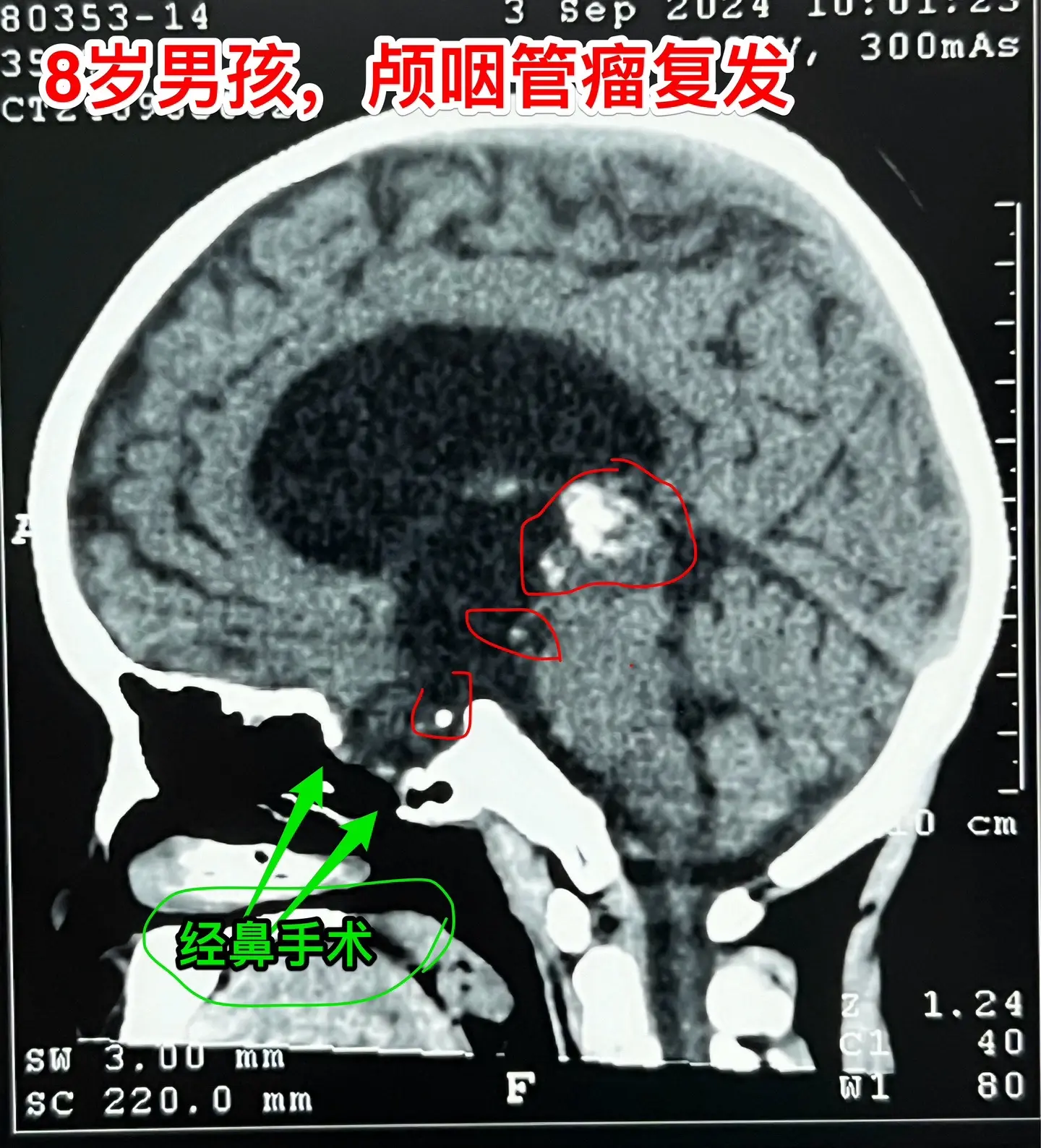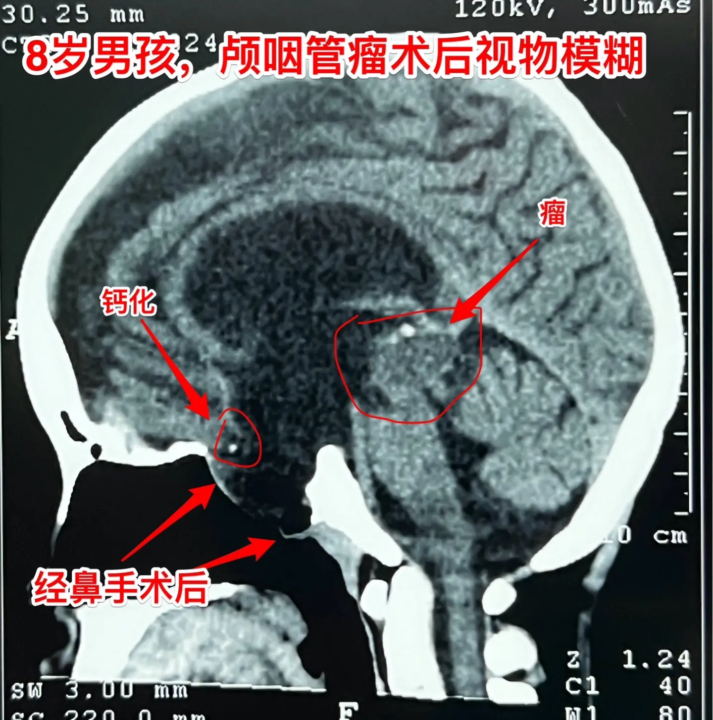 9.25作了开颅手术,顺利切除所能看见的十来个肿瘤灶。手术后CT显示鞍区及鞍上的小钙化均被切除。我如实告诉家长,后面还不保险,肿瘤仍有复发的可能性,需要定期复查。