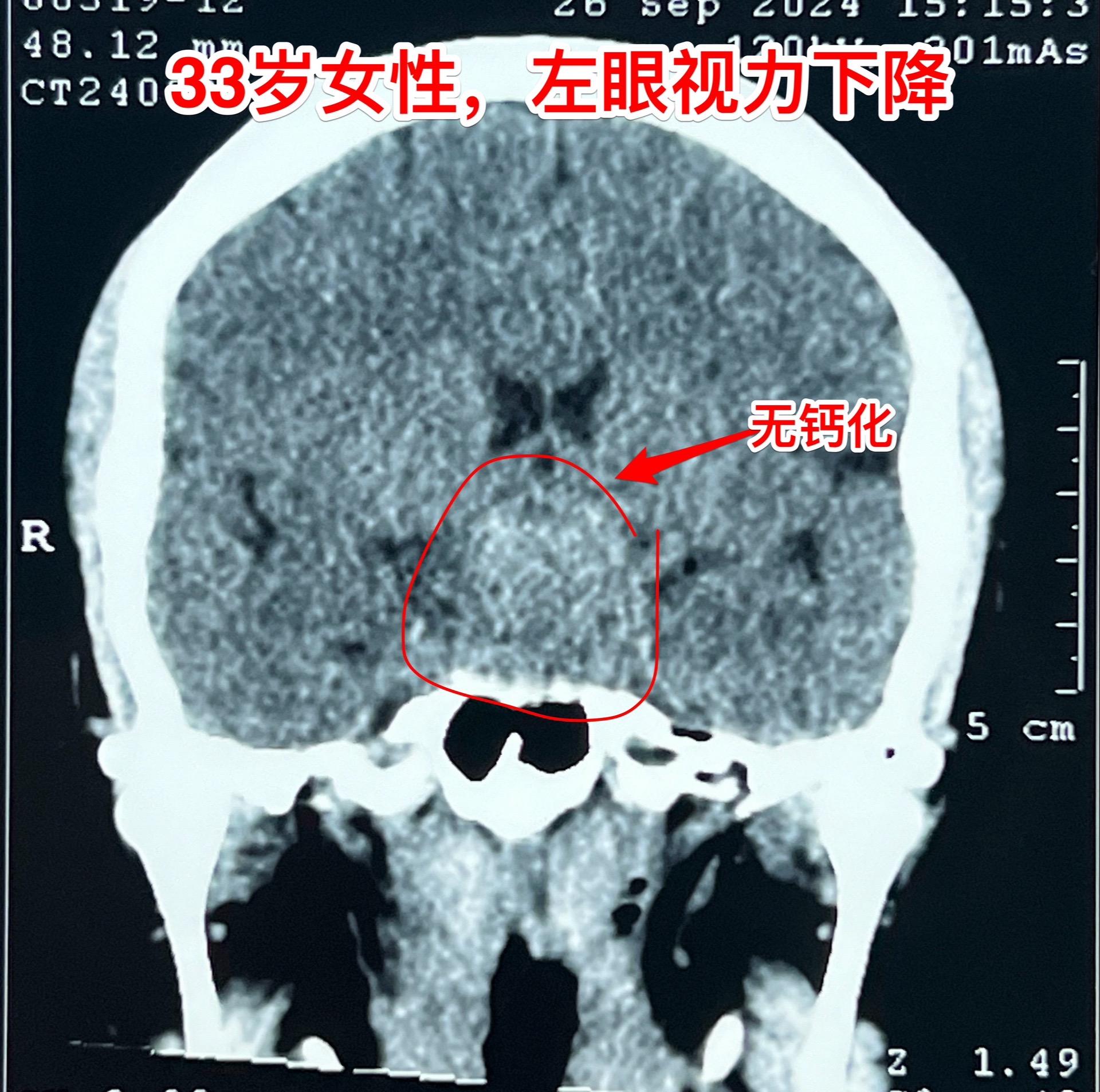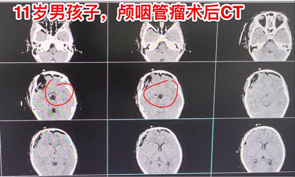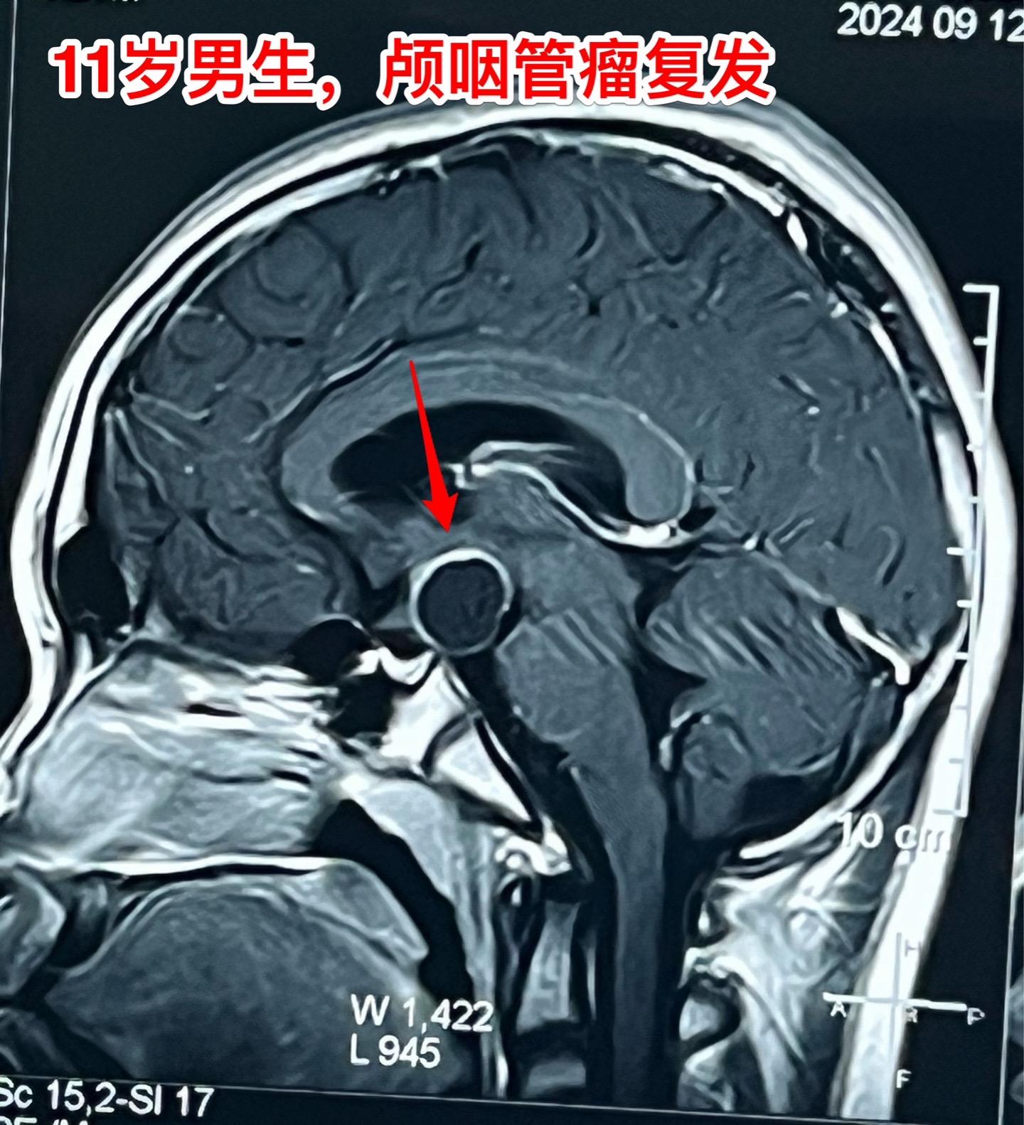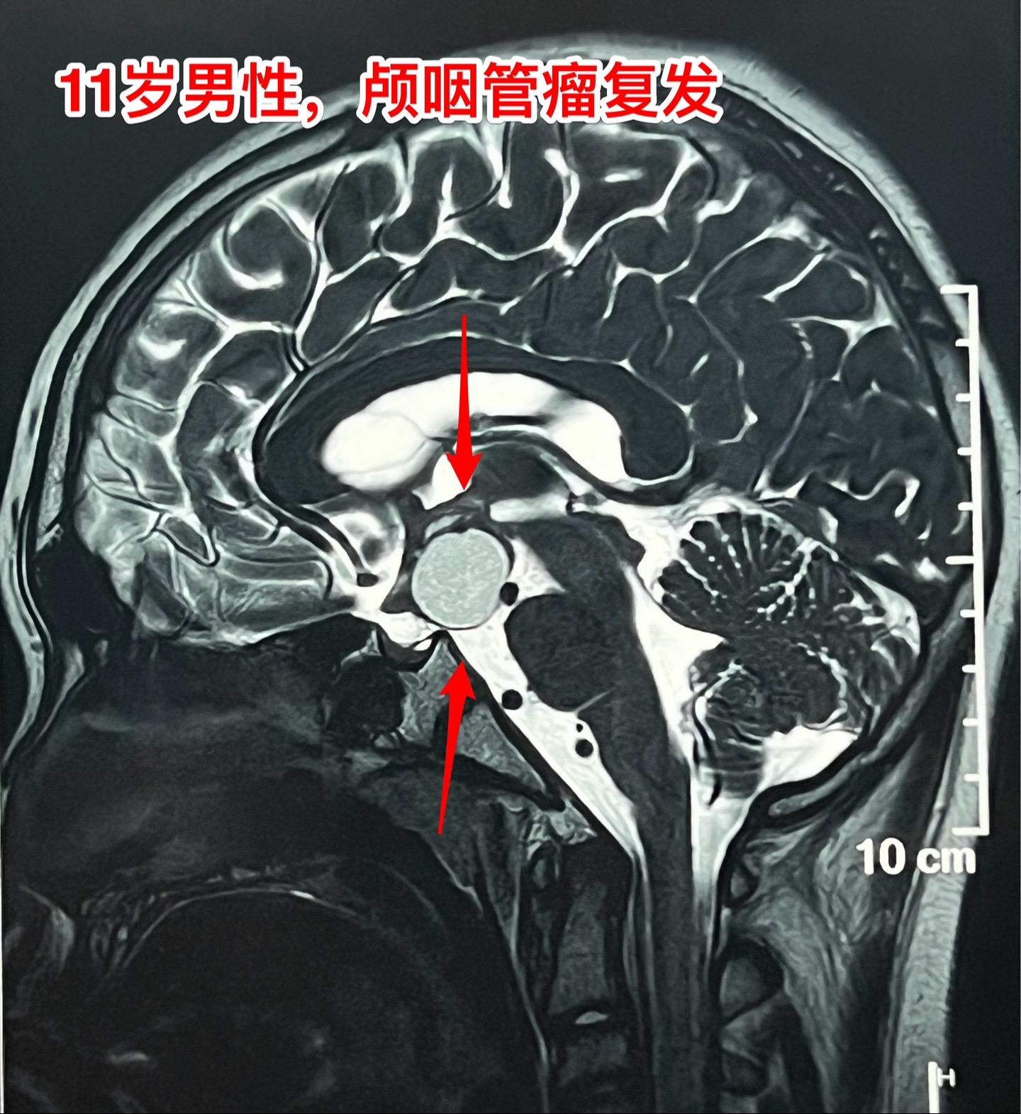 另一个手术是11岁男孩子,颅咽管瘤复发。经原切口翼点入路将肿瘤完全切除。术前磁共振只看见一个圆形肿瘤,术中发现除了这个肿瘤外还有5个散在的钙化斑,均得到完全切除。这样的散在钙化斑是潜在的危险因
