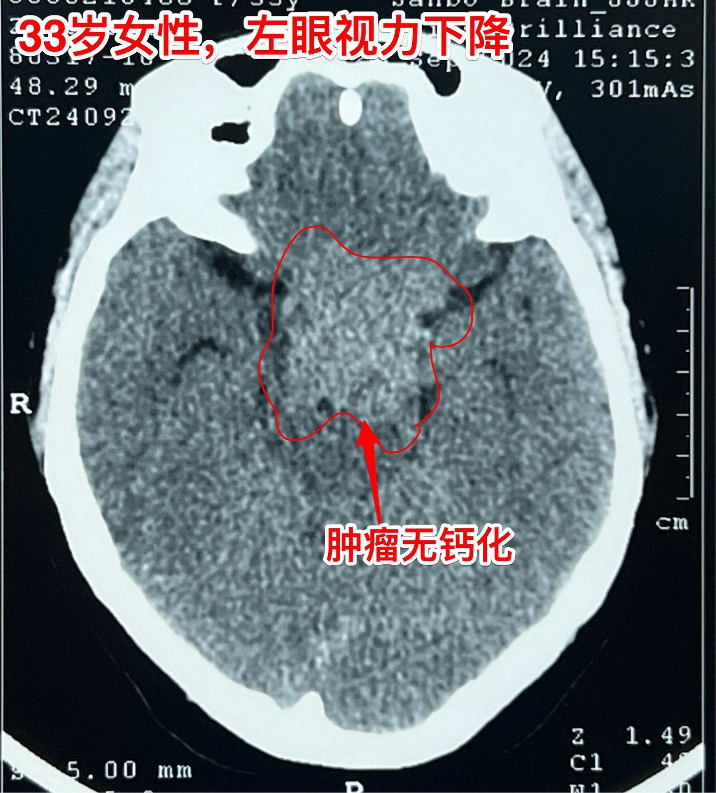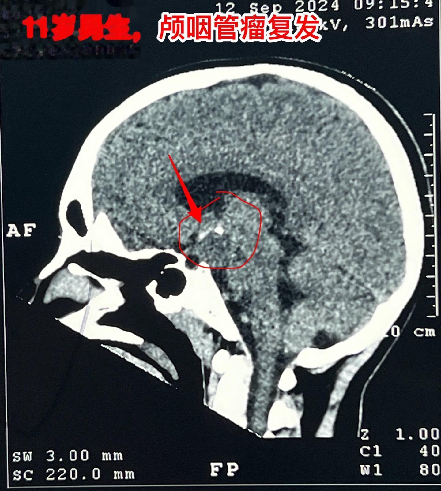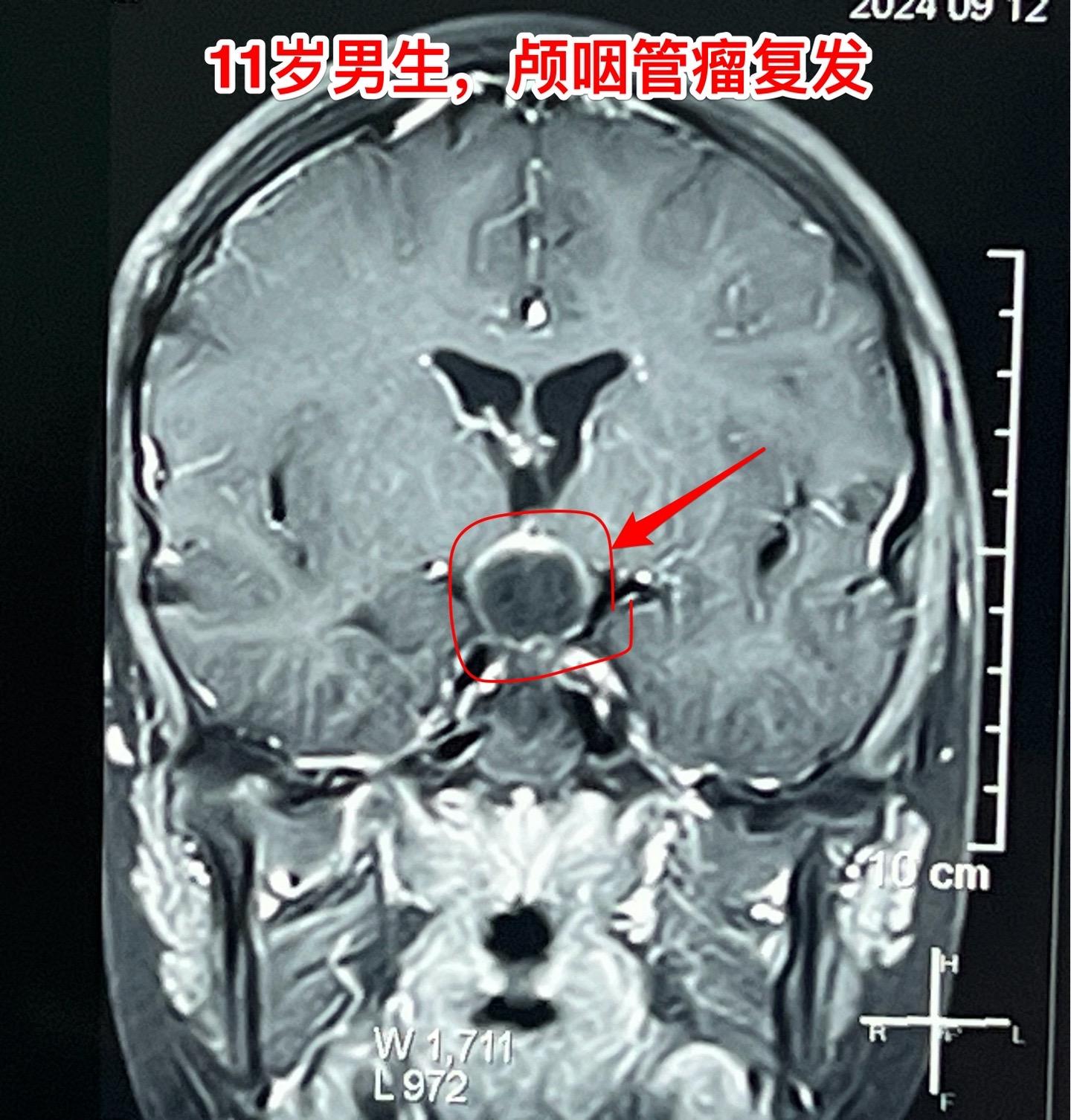 另一个手术是11岁男孩子,颅咽管瘤复发。经原切口翼点入路将肿瘤完全切除。术前磁共振只看见一个圆形肿瘤,术中发现除了这个肿瘤外还有5个散在的钙化斑,均得到完全切除。这样的散在钙化斑是潜在的危险因