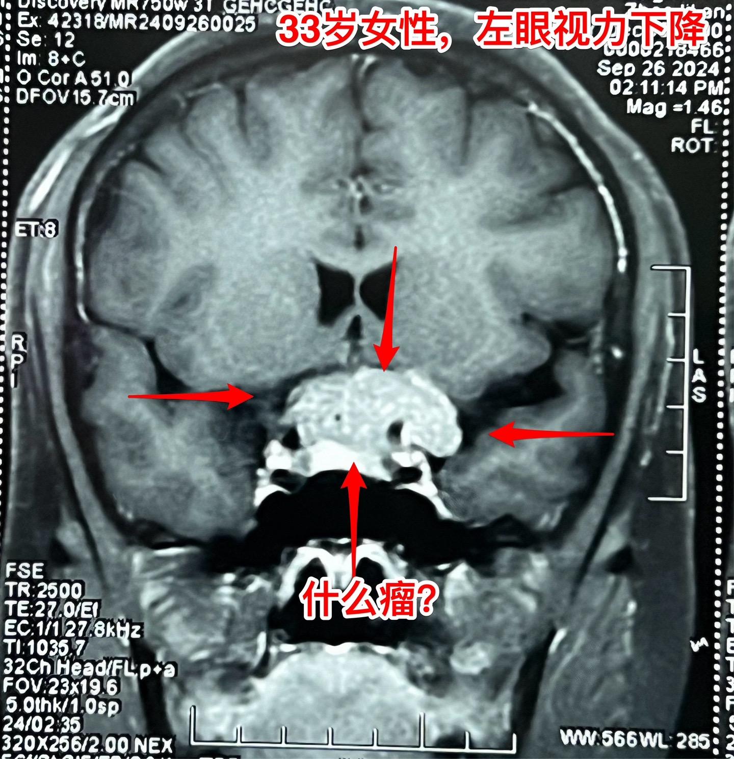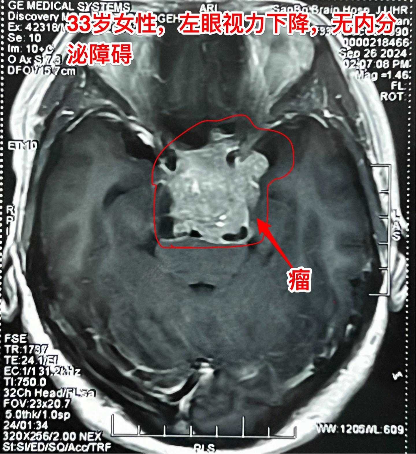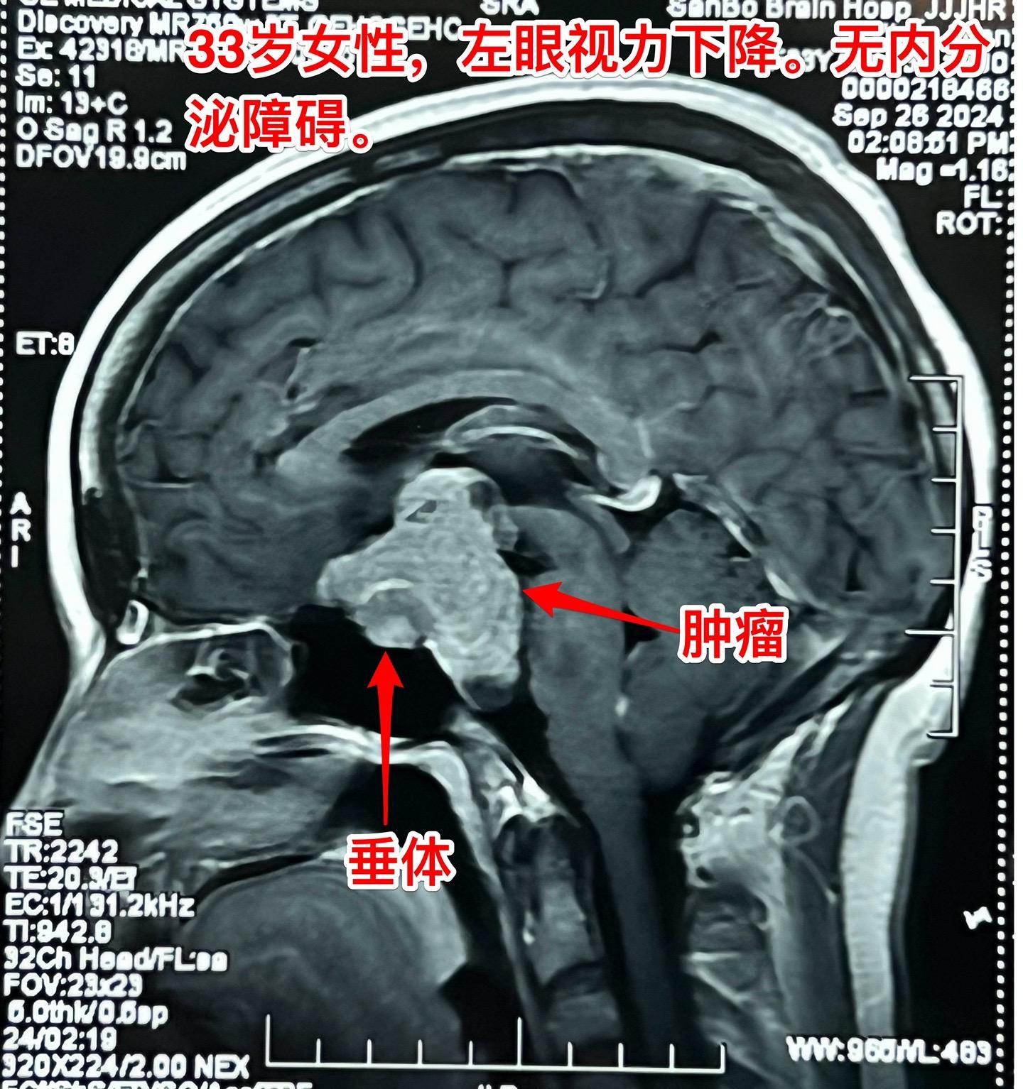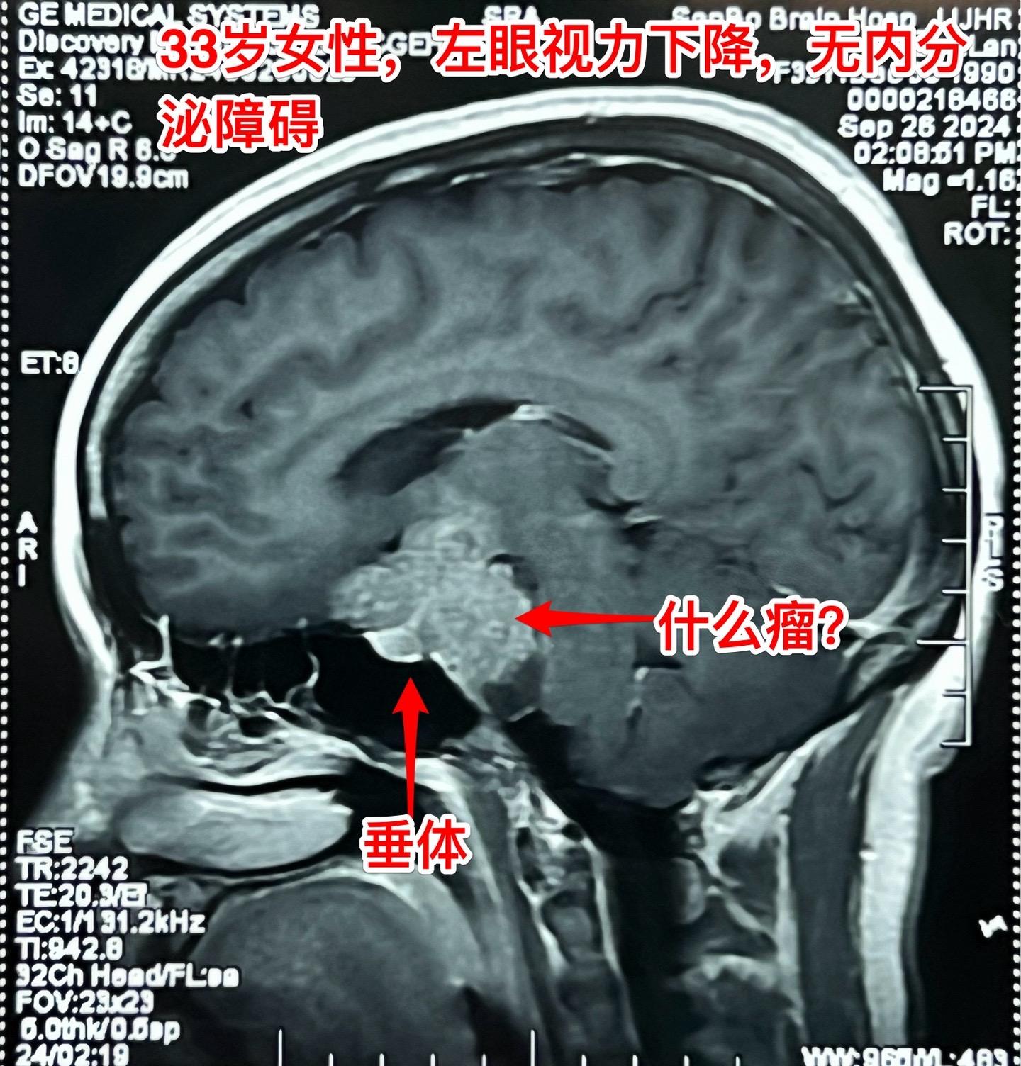 国庆节长假后第一天完成两个手术。一个手是33岁女性,来自云南省香格里拉。因左眼视力下降,到医院检查发现鞍区肿瘤,怀疑是颅咽管瘤。病人没有内分泌功能障碍。影像学上肿瘤是实性的,没有钙化,而且可以看见垂体信号。到底是什么肿瘤呢?今天手术中取肿瘤标本作快速冰冻病理检查,报告是垂体瘤。肿瘤得到完全切除,手术后病人视力好转了。
