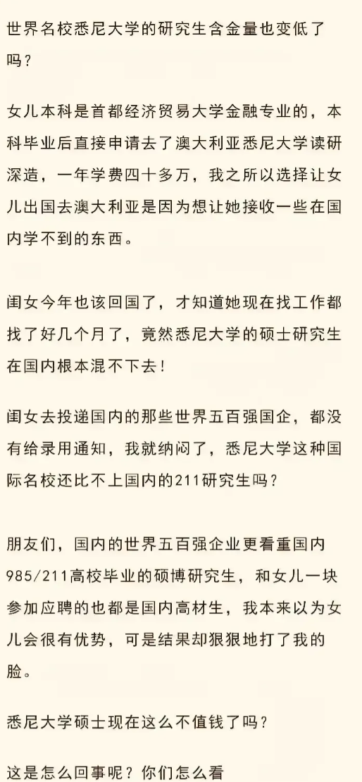 用钱堆积起来的留学生,回国无人问津,真是悲哀,我的女儿是澳大利亚悉尼大学读研深造,一年学费四十多万,毕业后闺女去投递国内的那些世界五百强国企,都没有给录用通知,悉尼大学这种国际名校还比不上国内的211研究生吗? 这事儿,说起来挺让人心塞的。家长们辛辛苦苦攒钱,把孩子送到国外读书,希望他们能有个好前程。可现实情况是,回国后的工作并不像想象中那么乐观。有时候,即使是悉尼大学这样的国际知名学府,也不一定就能在国内的就业市场中脱颖而出。 首先,我们要明白,现在的就业市场和过去不一样了。以前,只要是留学生,回国后都是香饽饽。但现在,随着留学生人数的增加,国内的企业也开始更加挑剔。他们不仅看重学历,更看重个人能力和实际工作经验。 再者,国内的教育水平也在不断提高,211和985高校的研究生教育质量得到了广泛认可。这些学生在国内的实习和就业机会也更多,企业对他们的了解也更深。 此外,留学生在国外的学习经历,虽然能开阔视野,但也可能导致他们对国内的就业市场不够了解。有时候,他们可能不太适应国内的工作环境和文化,这也会影响他们的就业竞争力。 还有一点,就是现在的留学生,很多人选择的专业可能并不是国内急需的。而国内的研究生,他们选择的专业往往更符合国内市场的需求。 所以,对于留学生来说,要想在国内找到好工作,除了要有扎实的专业知识,还需要有相关的实习经验,了解国内的就业市场,并且能够适应国内的工作环境。 最后,我想说的是,不管是留学生还是国内毕业生,找工作都是一场硬仗。大家都不容易,都需要努力提升自己的能力,才能在竞争激烈的就业市场中脱颖而出。 各位读者你们怎么看?欢迎在评论区讨论。