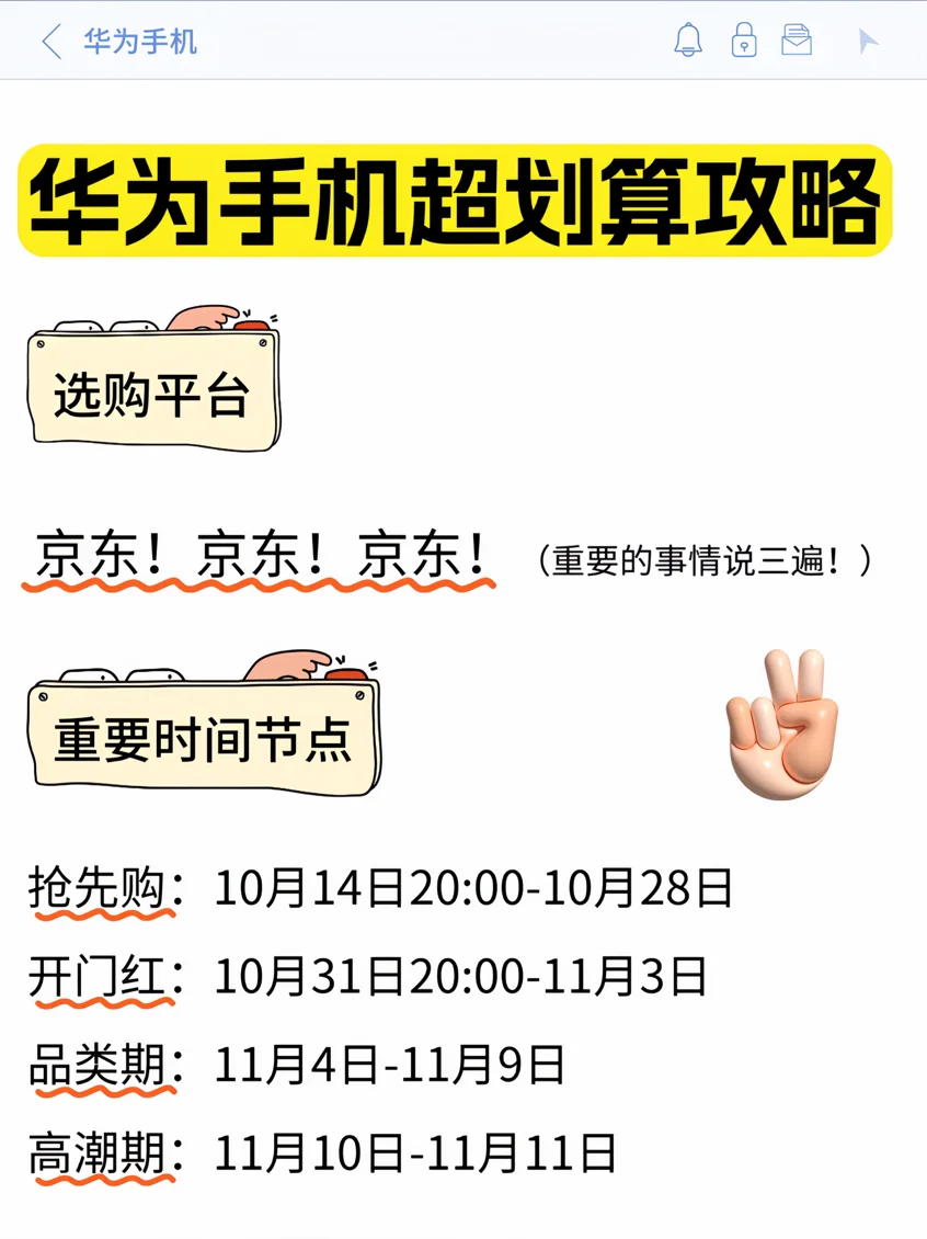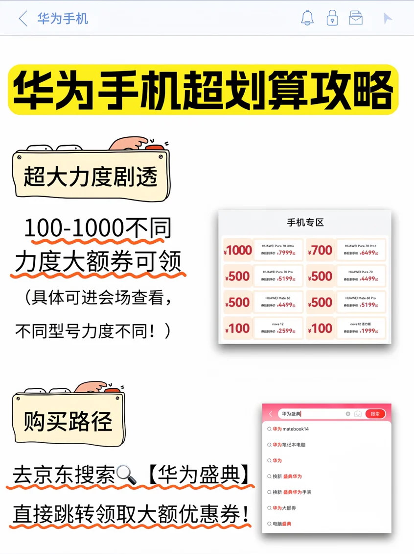 家人们❗️今年双十一真的太卷了❗️ 想买华为手机的一定要看这篇🙋‍♀️ 纯干货分享📖错过这次真的可能要等一年了😱 🛒【选购平台】 🔥京东❗️京东❗️京东❗️(重要的事情说三遍!) 不仅价格超划算!而且现货多!到货快!速度是真给力啊❗️❗️❗️ 🛒【重要时间节点】 🔥抢先购:10月14日20:00-10月28日 🔥开门红:10月31日20:00-11月3日 🔥品类期:11月4日-11月9日 🔥高潮期:11月10日-11月11日 🛒【超大力度剧透】 100-1000不同力度大额券可领(具体可进会场查看,不同型号力度不同!) ⭕️HUWEI Pura 70 Ultra可领💰1000元华为大额券 ⭕️HUWEI Pura 70 Pro+可领💰700元华为大额券 ⭕️HUWEI Pura 70 Pro、HUWEI Pura 70、HUAWEI Mate 60 Pro、HUAWEI Mate 60可领💰500元华为大额券 ⭕️HUWEI nova 12、HUWEI nova 12 活力版、华为畅想 70 Pro可领💰100元华为大额券 🛒【京东好物分享】 买完手机也可以在京东看看罗马仕充电宝、决色磁吸款手机壳,支持华为手机快充,现在也有优惠❗️ 🛒【华为手机购买路径】❗️❗️❗️ 🔥去京东搜索🔍【华为盛典】直接跳转领取大额优惠券!
