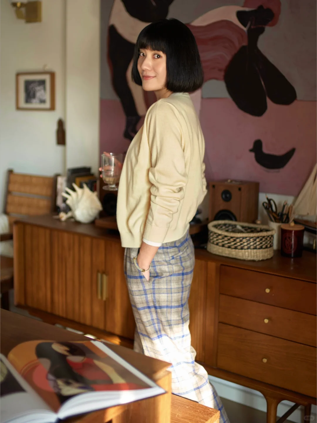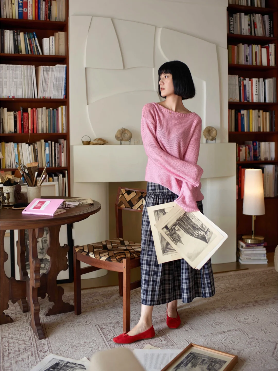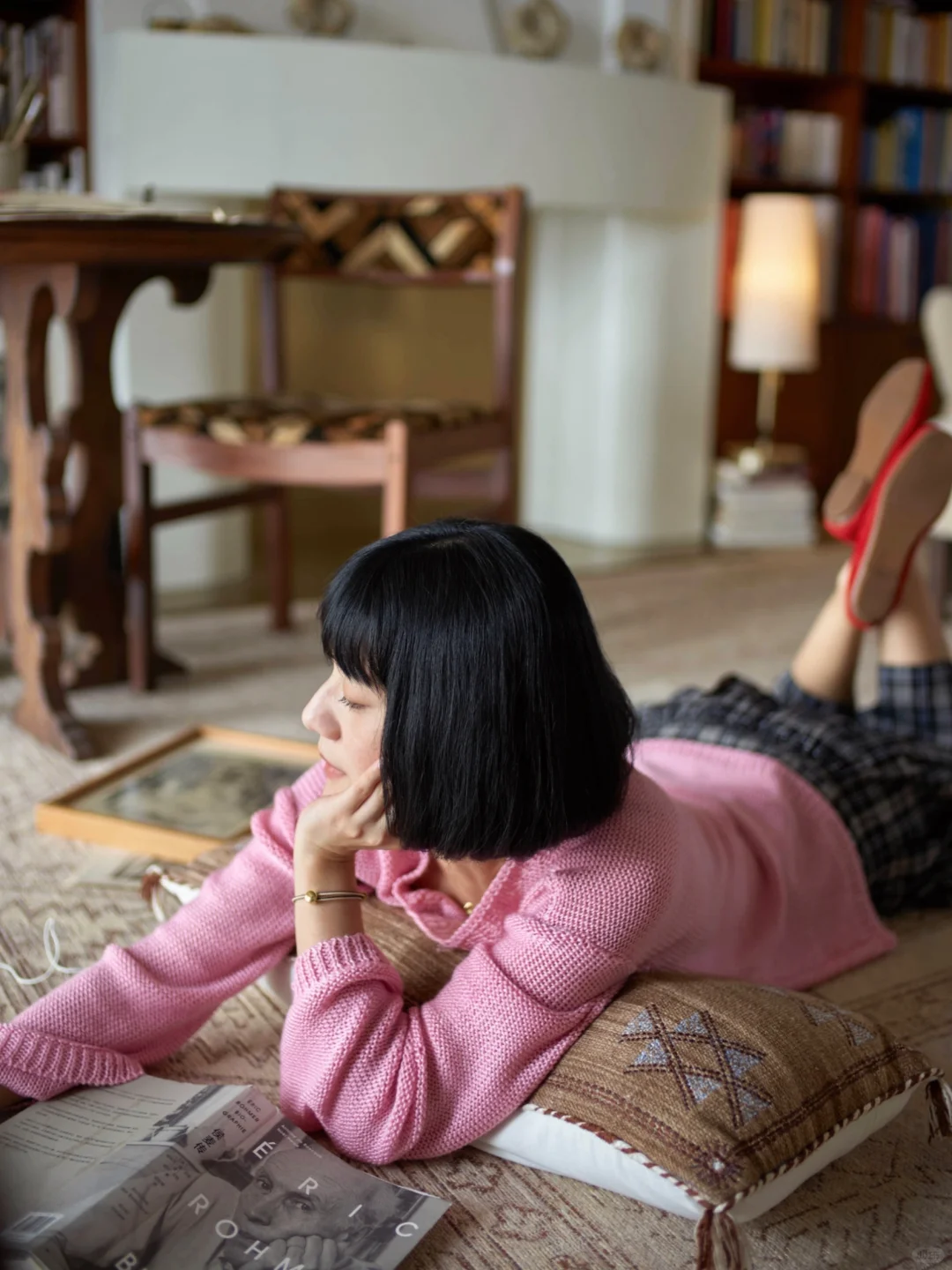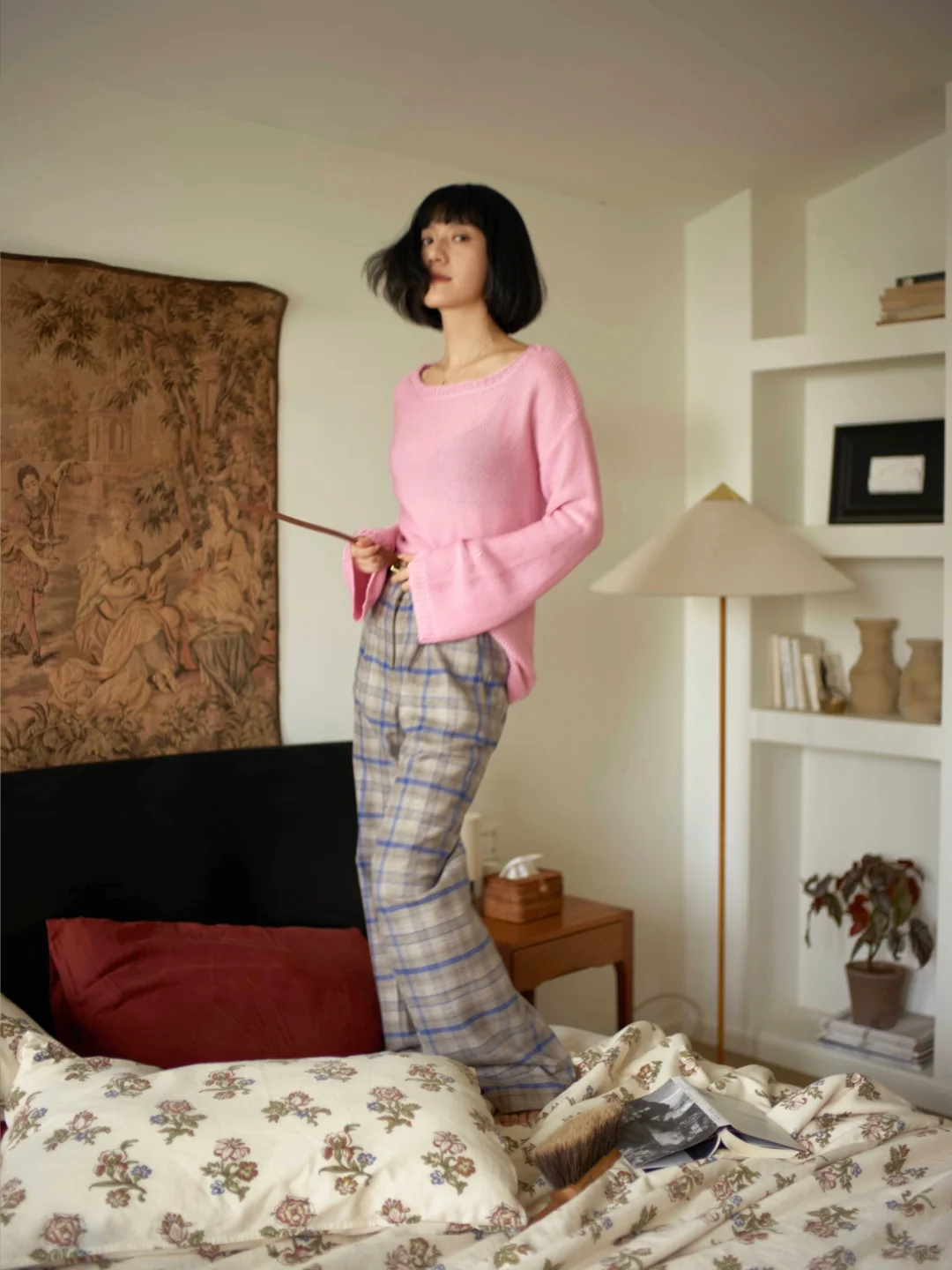 《绯暖栖于午后光》午后的光漫过墙面,铺出一片软和的暖。她立在光晕里,绯色衣