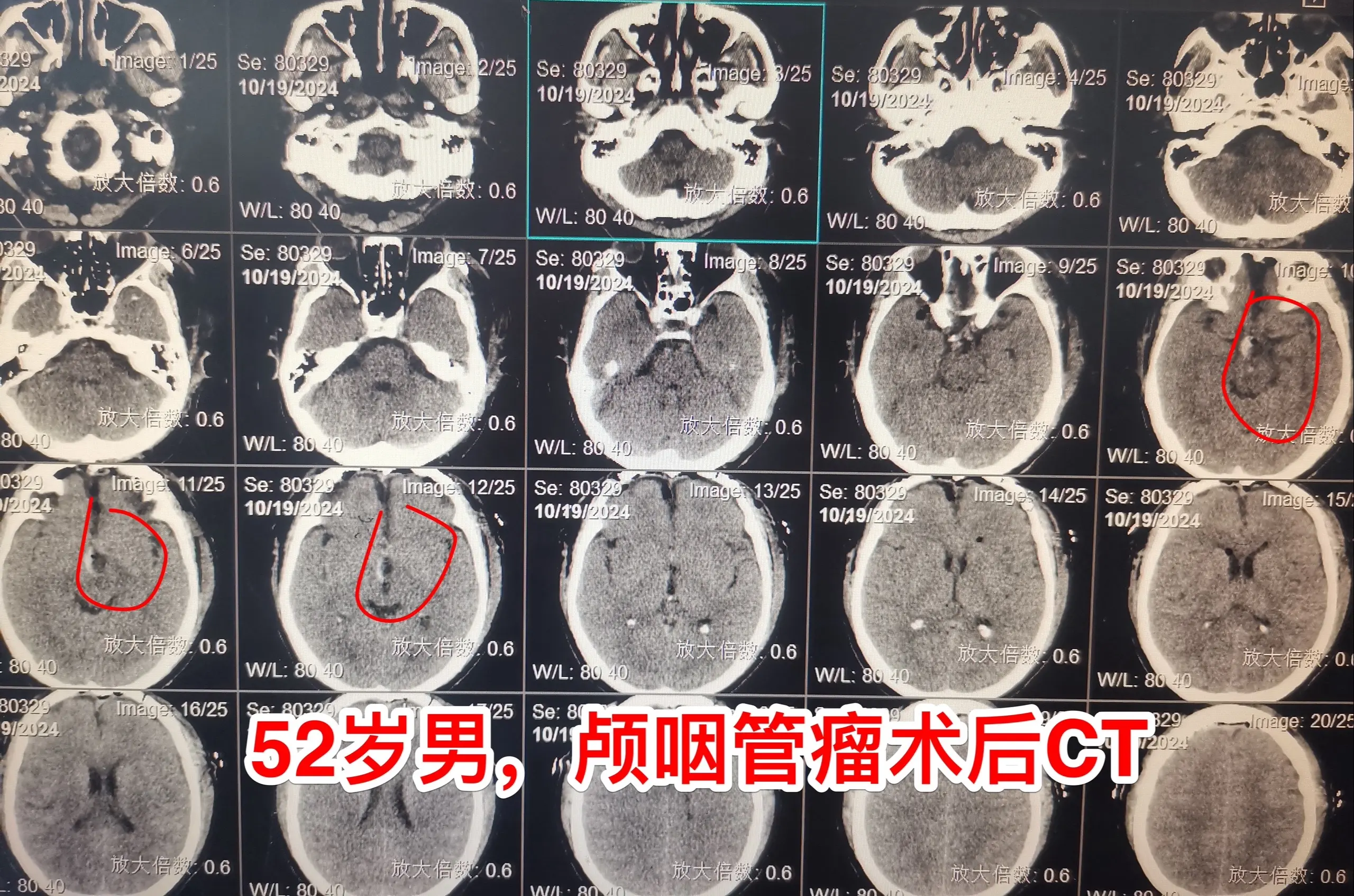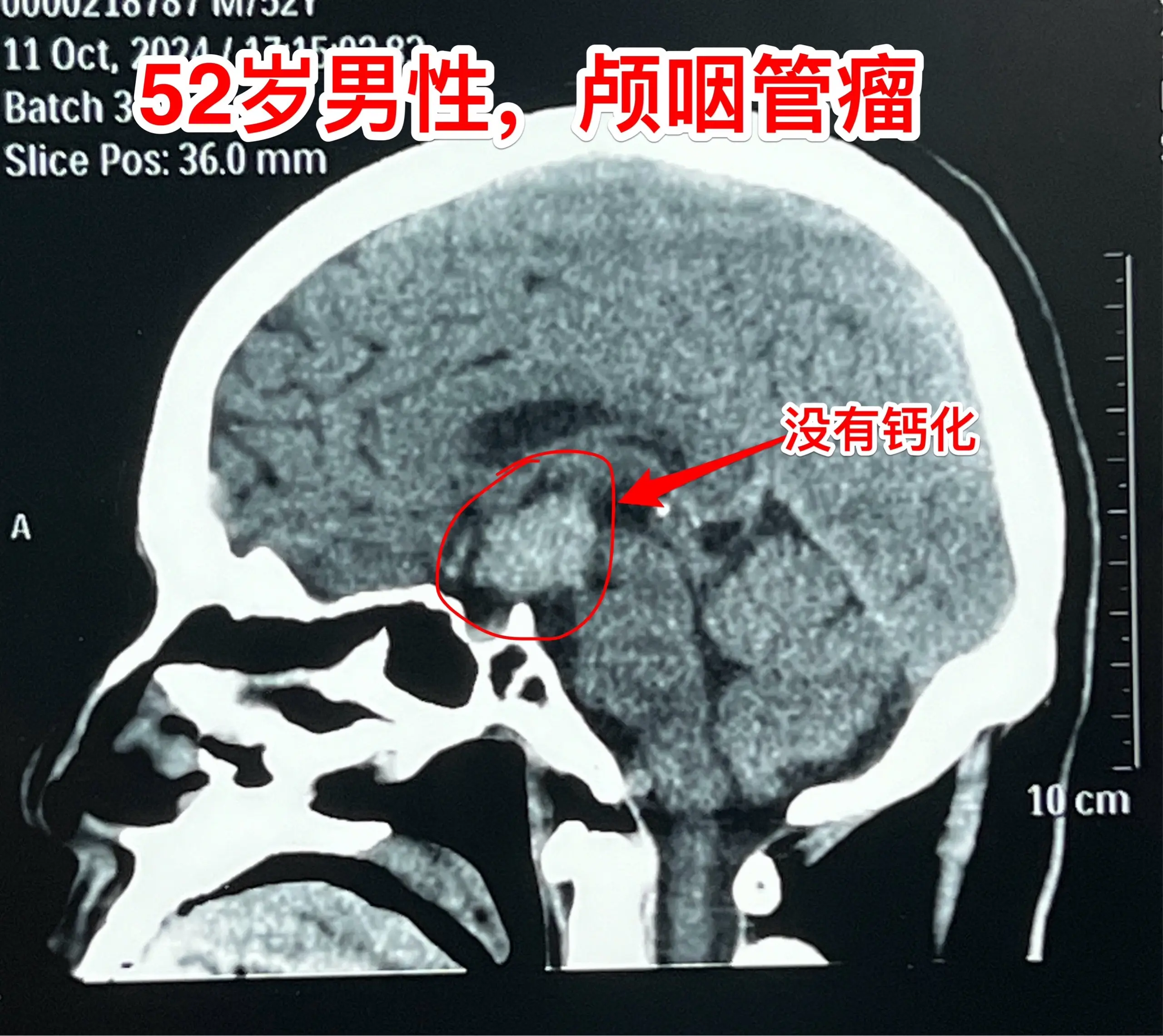 乳头型颅咽管瘤。52岁的重庆市男性,因为头痛到医院检查磁共振,居然发现脑部有个颅咽管瘤,典型的乳头型颅咽管瘤。CT显示肿瘤没有钙化,基本就是一个实性肿瘤。