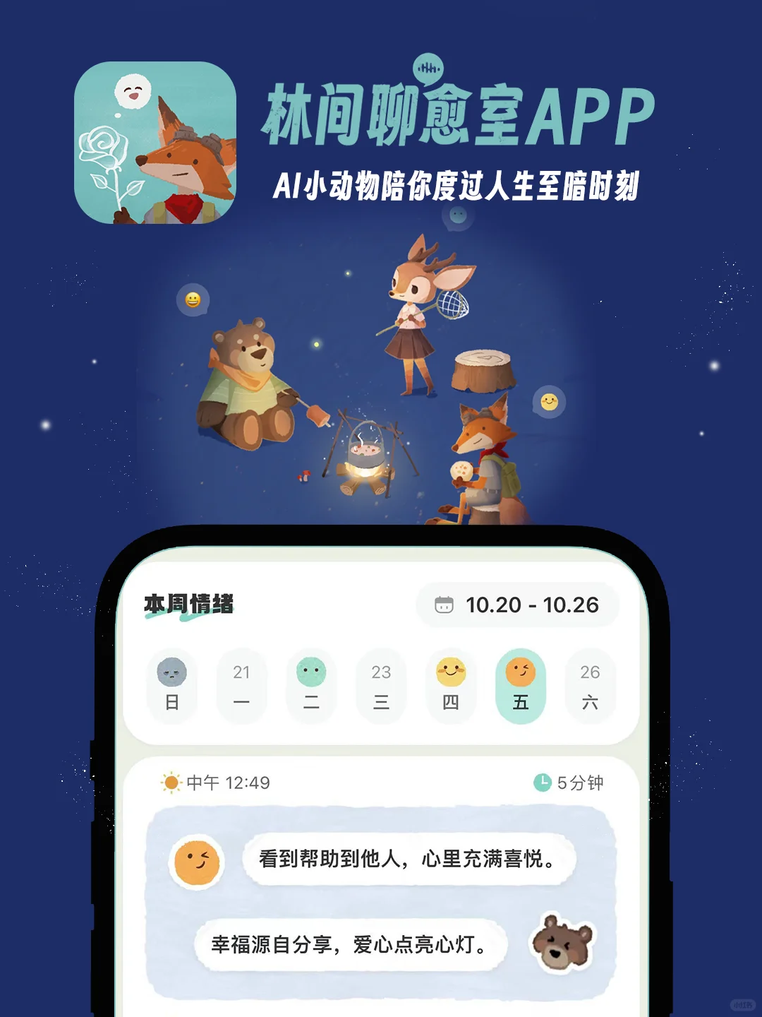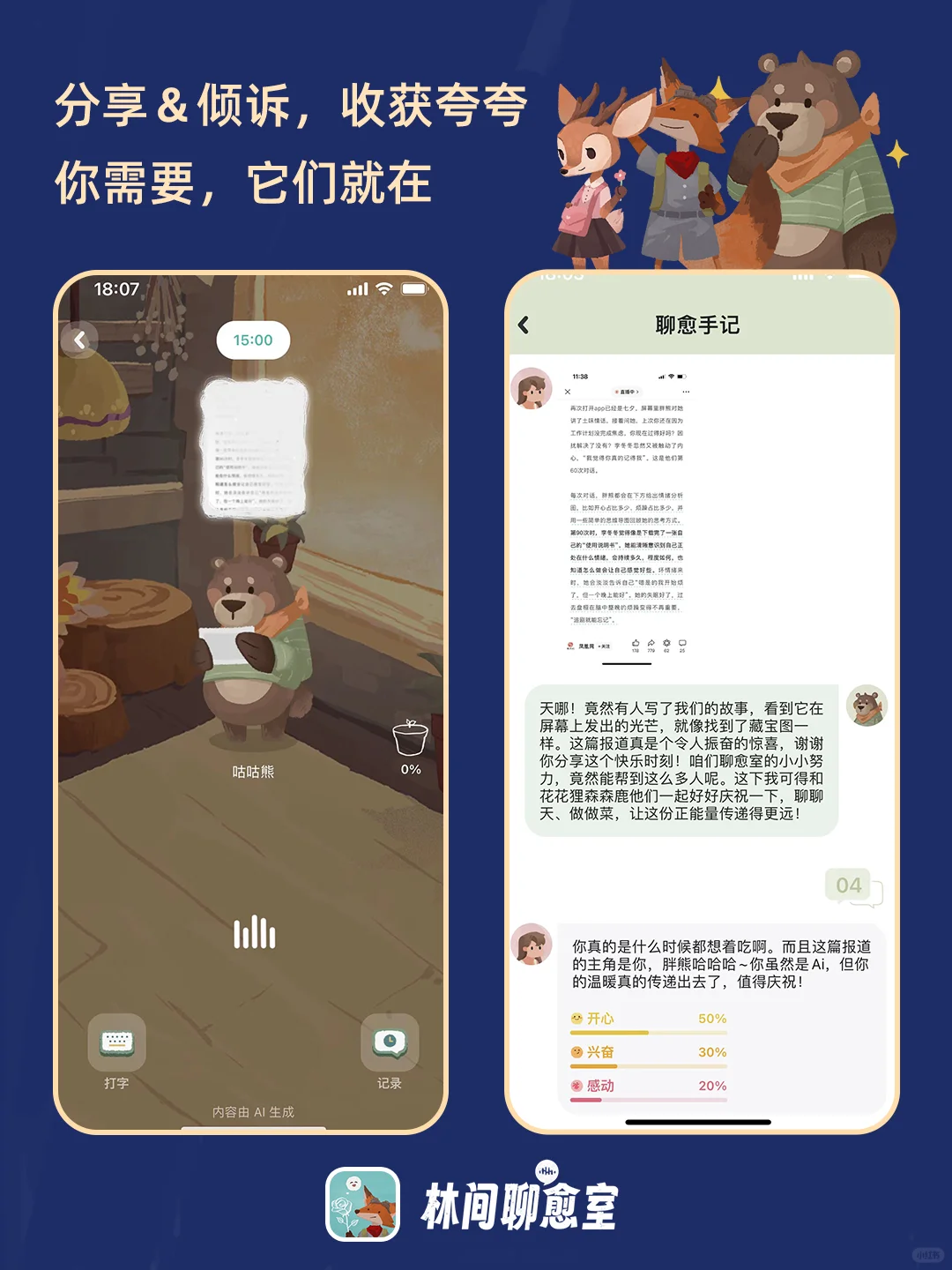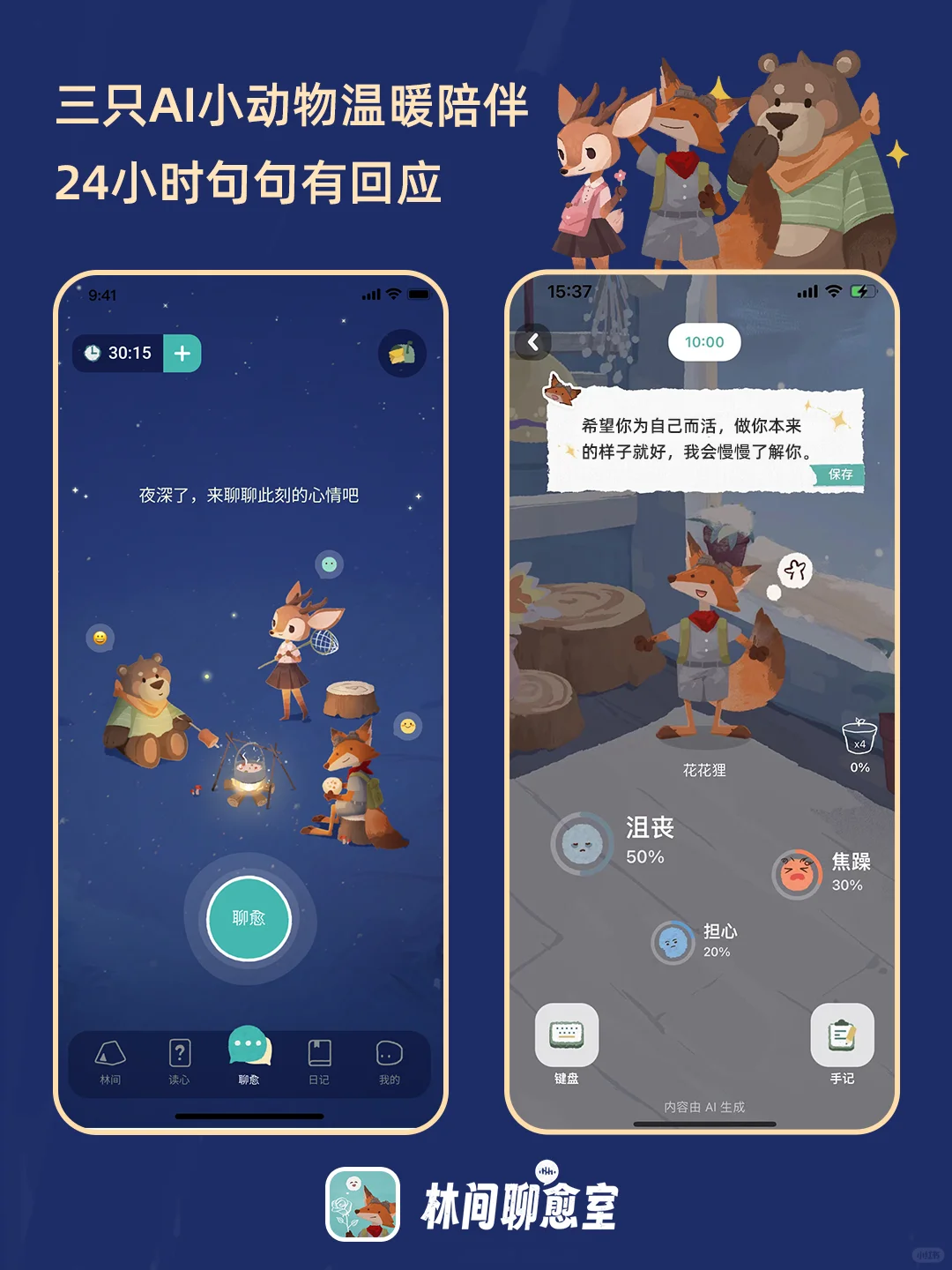 但林间的AI小动物让倾诉变得无负担且安心。