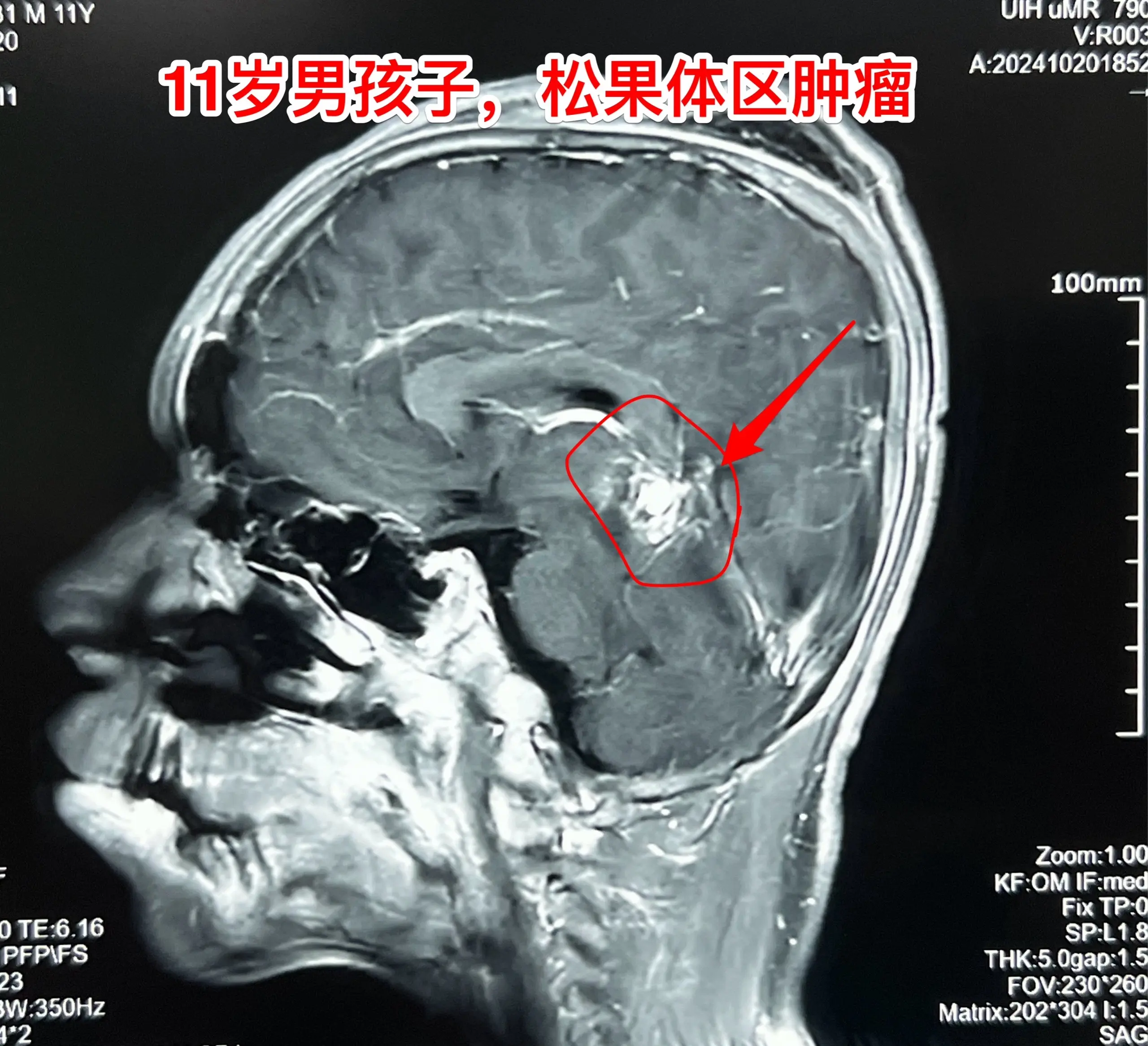 才11岁的男孩子,脑部居然出血了。出血主要位于松果体区及第三脑室。在外院立即作了脑室外引流术,达到挽救生命的效果。随后作了磁共振检查,显示松果体区有肿瘤,这次脑部出血的根源在于松果体区肿瘤的自发出血。