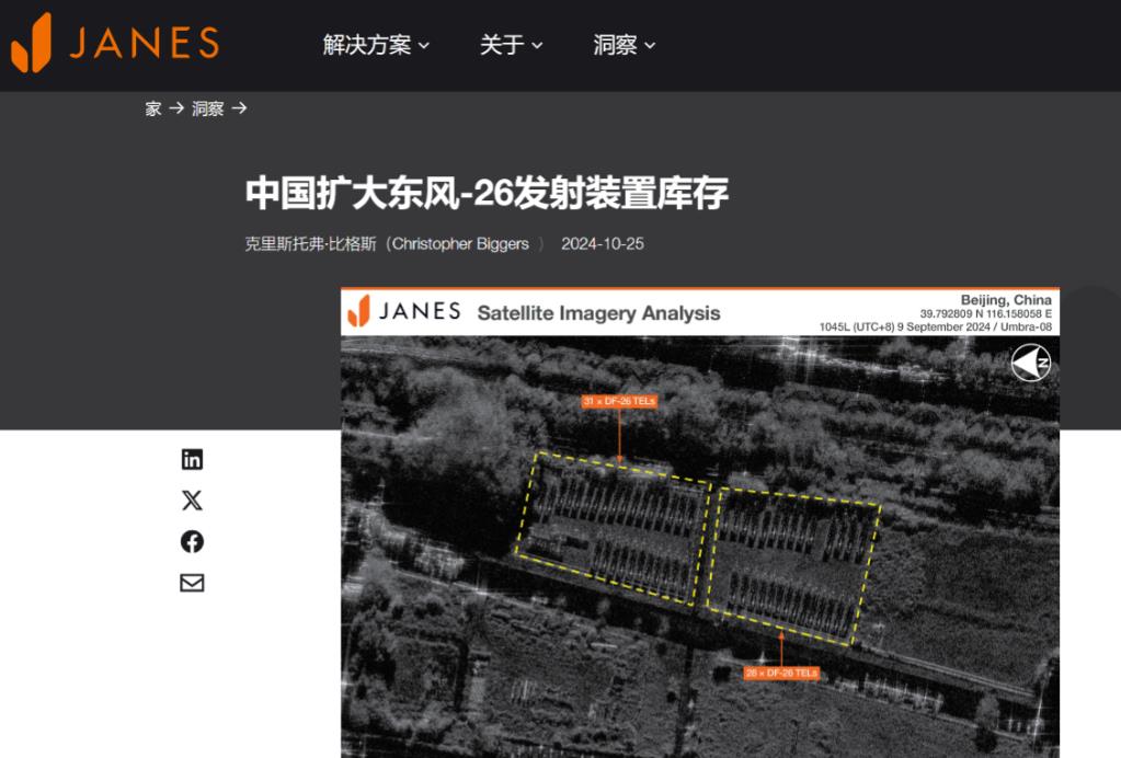 当地时间10月25日,最新一期英国《简氏防务周刊》杂志刊登文章称,根据最近一段时间来自美国商业遥感卫星的照片显示,在中方某地停放着近60辆东风-26TEL三用导弹发射车。