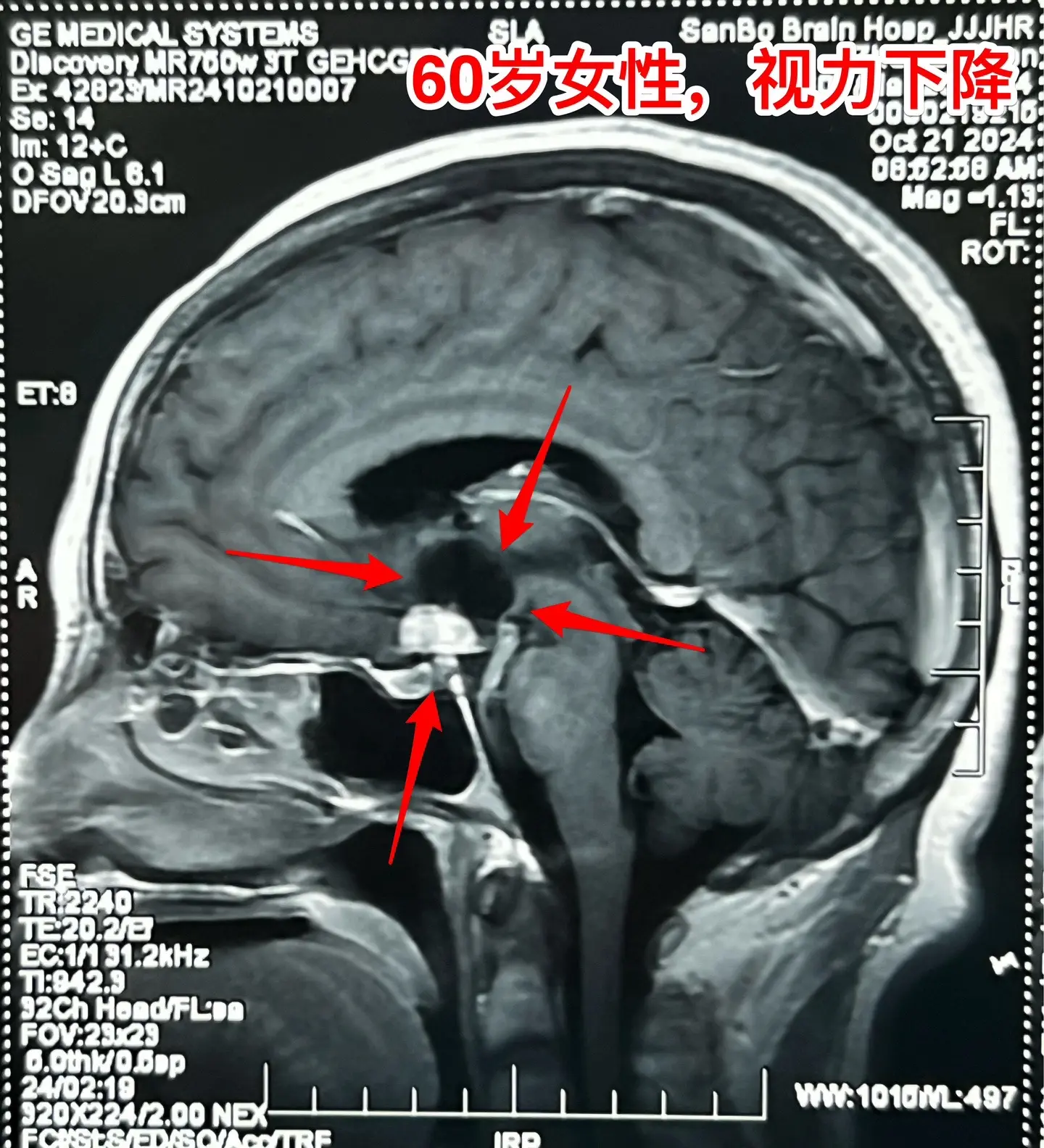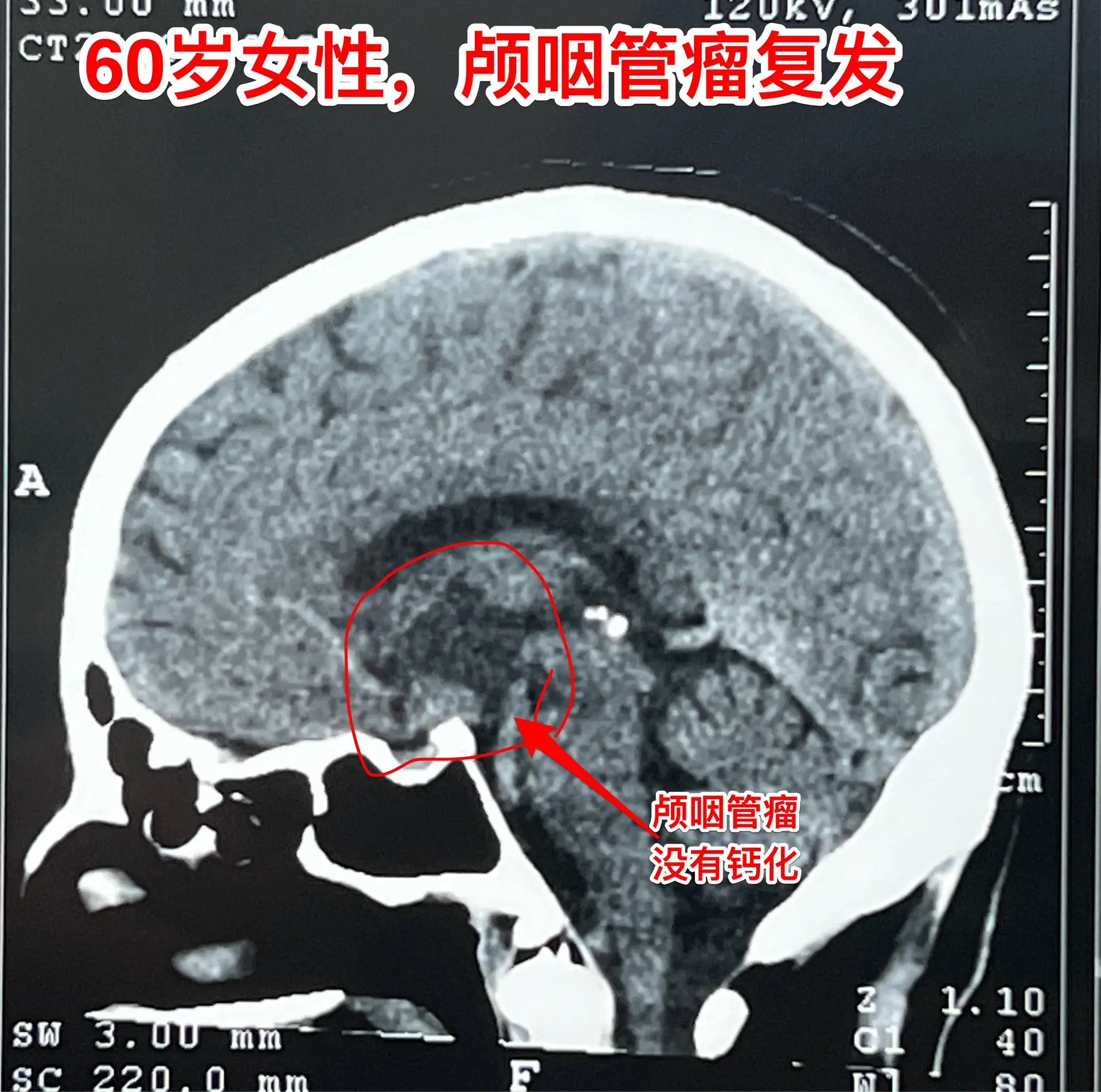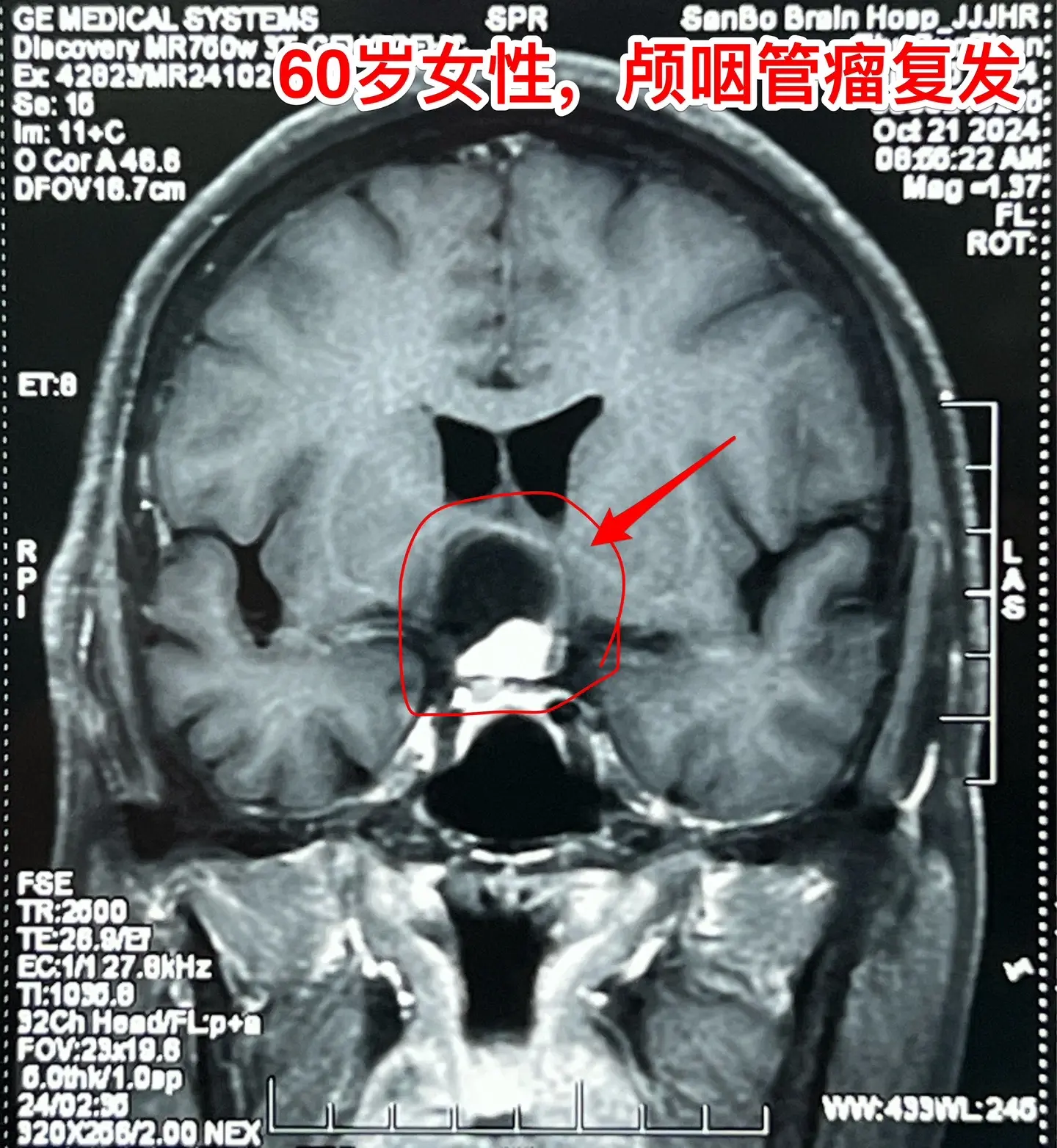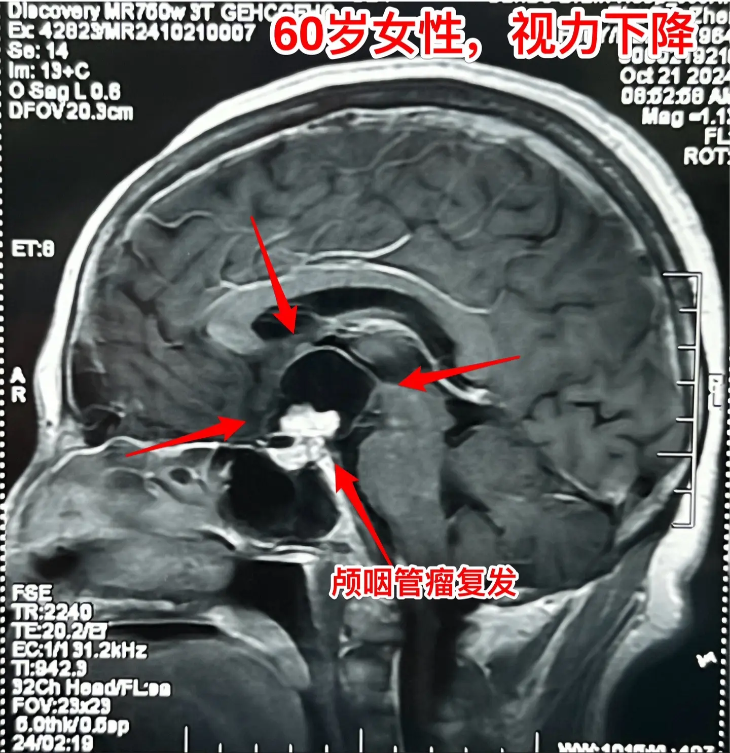 今年九月份患者左眼视力又出现下降,快失明了。在当地医院复查磁共振显示肿瘤复发了,十月份来我科住院。10月31日作了开颅手术,将颅咽管瘤切除了。手术后老人说视力有好转。