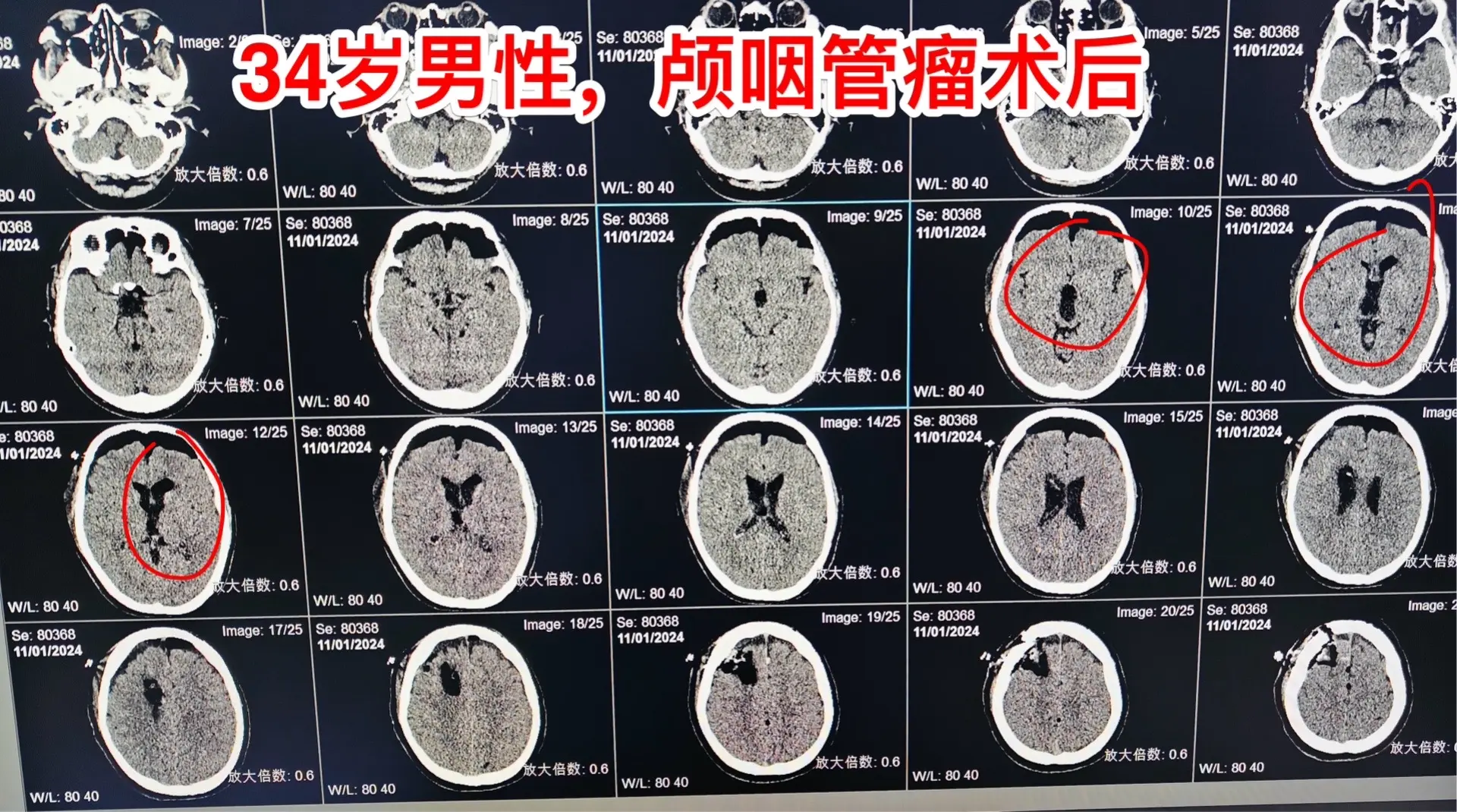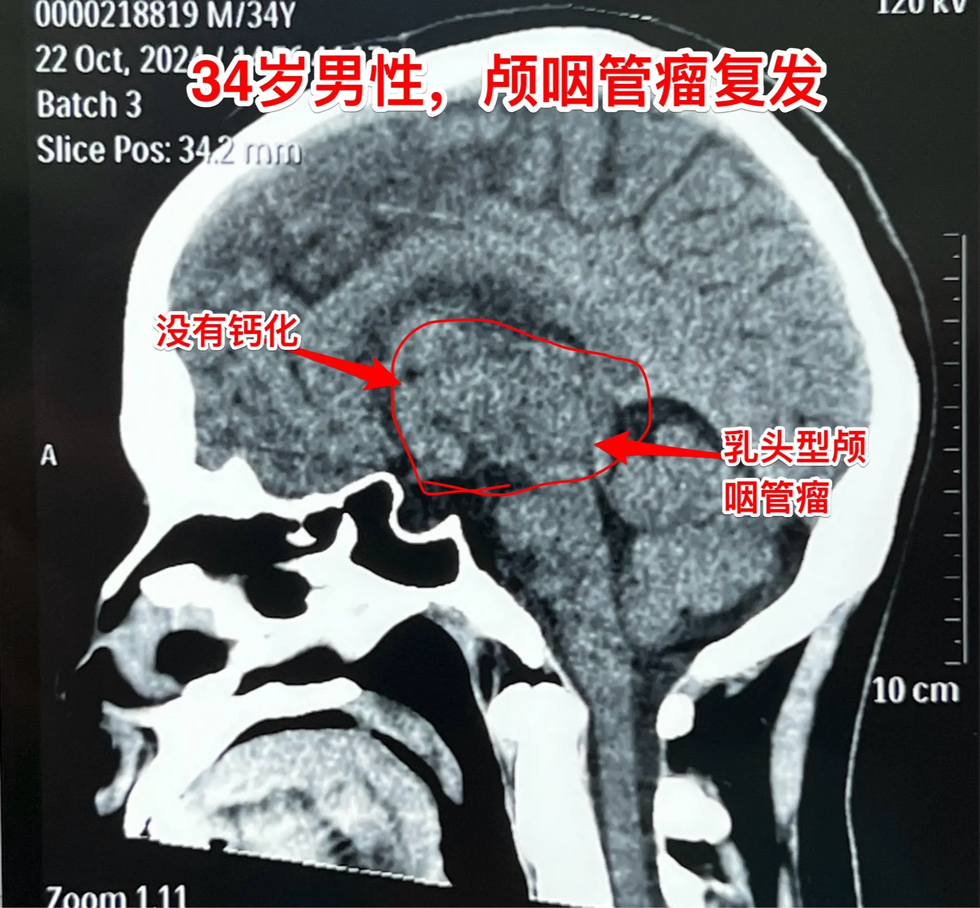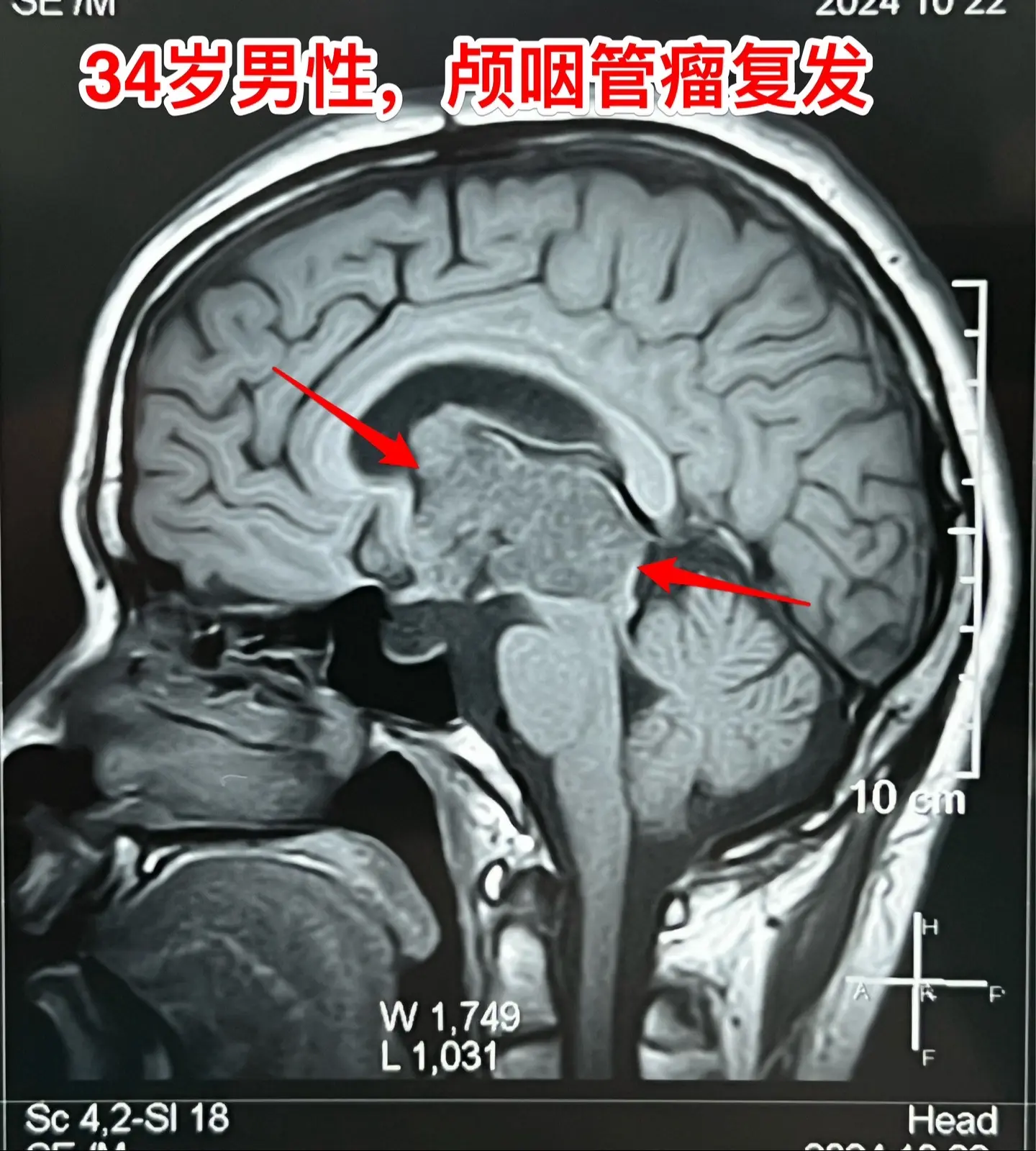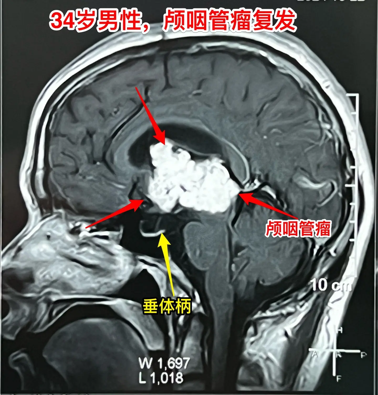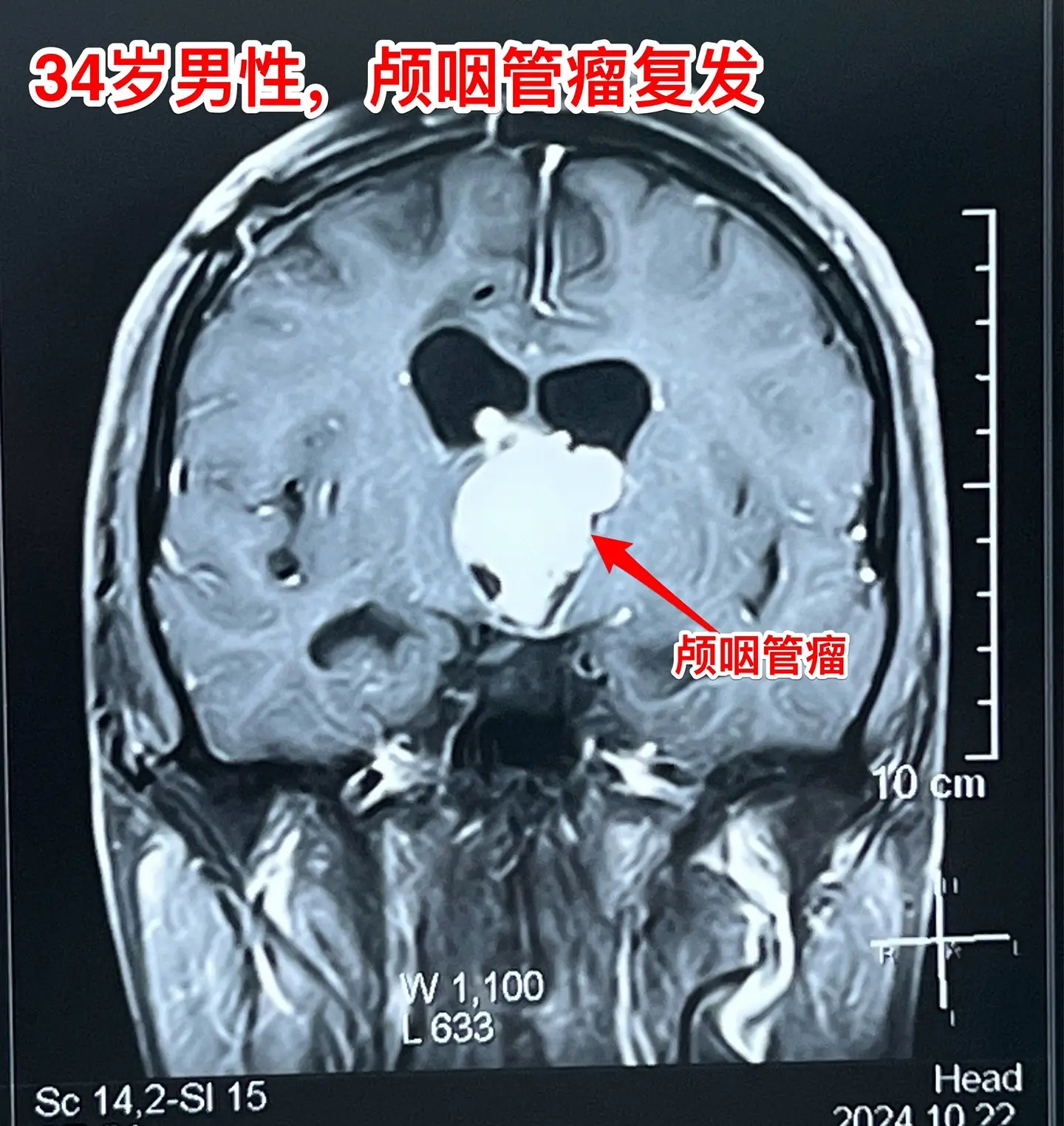 34岁广州男性颅咽管瘤复发。一年前他在广州市某医院行开颅手术切除颅咽管瘤,是乳头型颅咽管瘤。