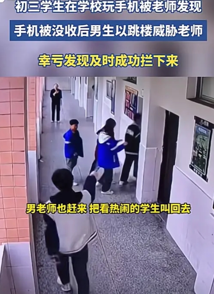 (来源:青岛广电生活在线2024年11月5日关于《初三学生被老师没收手机,一气之下以跳楼威胁老师,楼道内的男老师看准时机,将其一把救下》的报道)