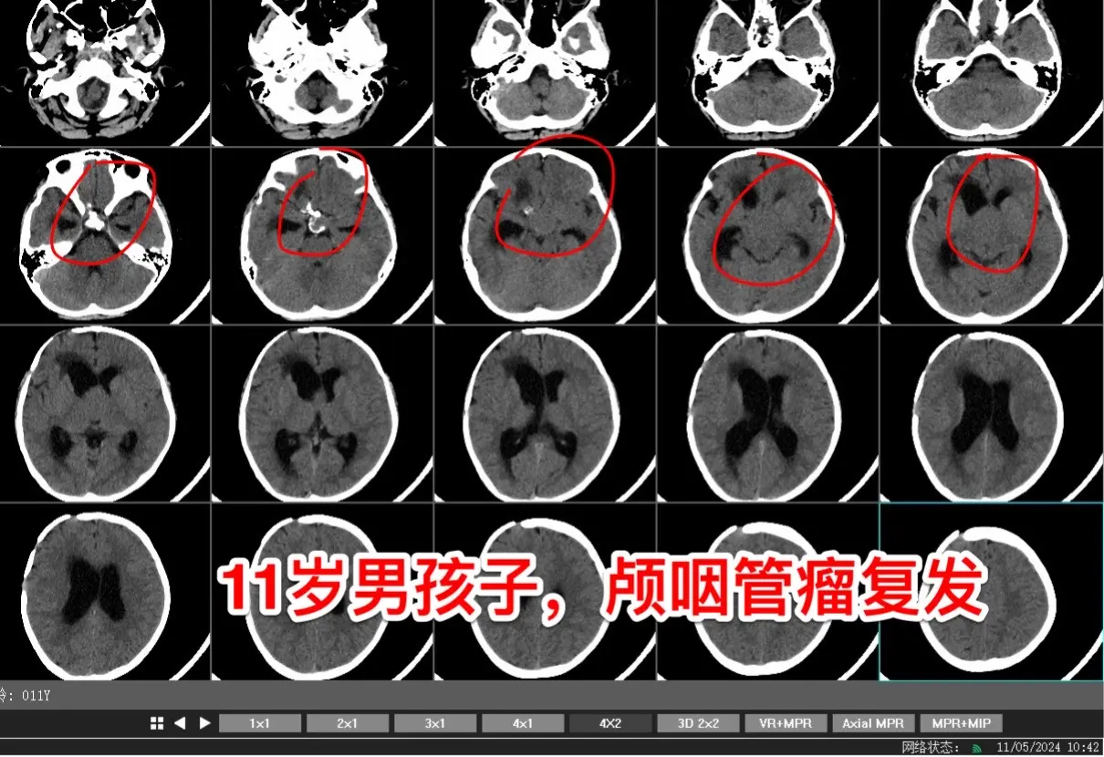 病人11岁,辽宁省朝阳市人,在之前的四年时间内曾经作过一次开颅手术、一次经鼻内镜手术。这次因颅咽管瘤复发,不得不作第三次手术。手术过程顺利!当天下午病人就从ICU回到神经外科八病区普通病房。