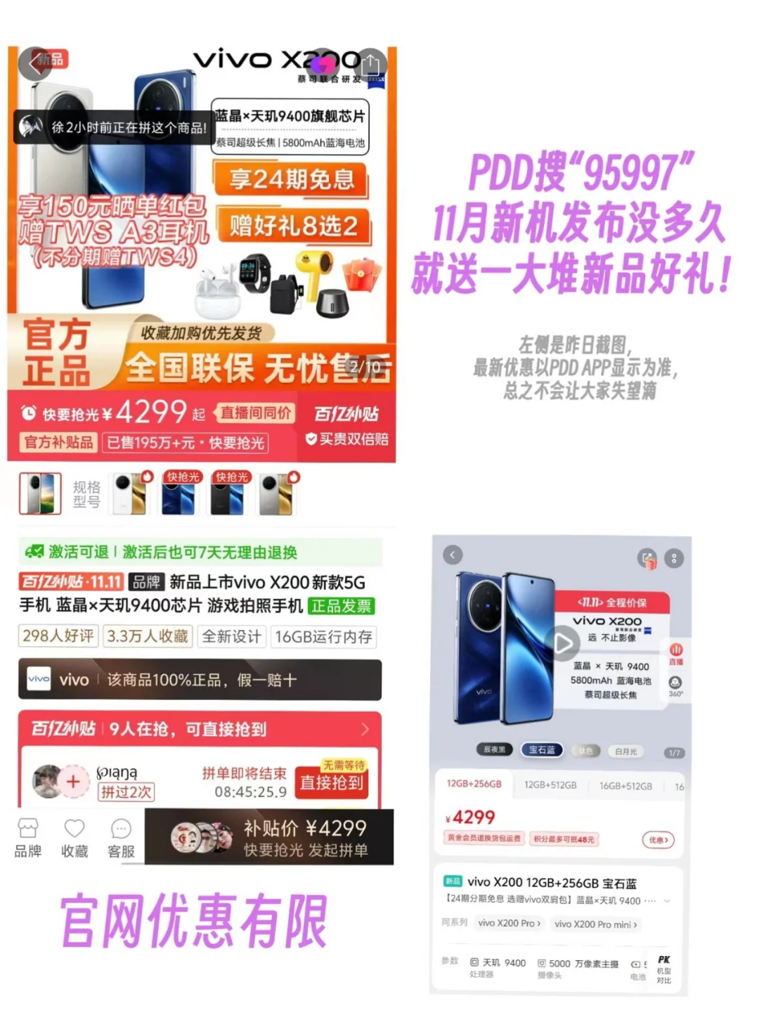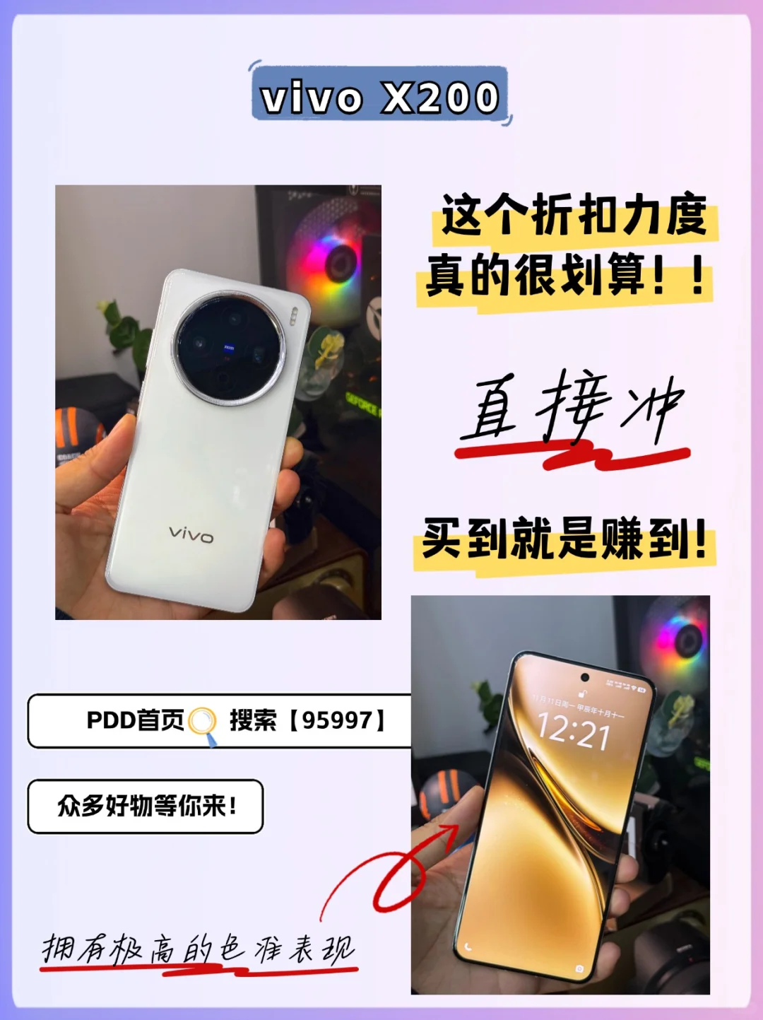拼多多搜索【95997】可以直达数码特惠专场,去年发布的机型统统大降价,像vivo x100低至3000多。买新机也会送很多优惠,今天介绍的3款都有新机好礼,如果遇上以旧换新活动的话还至高补贴千元~