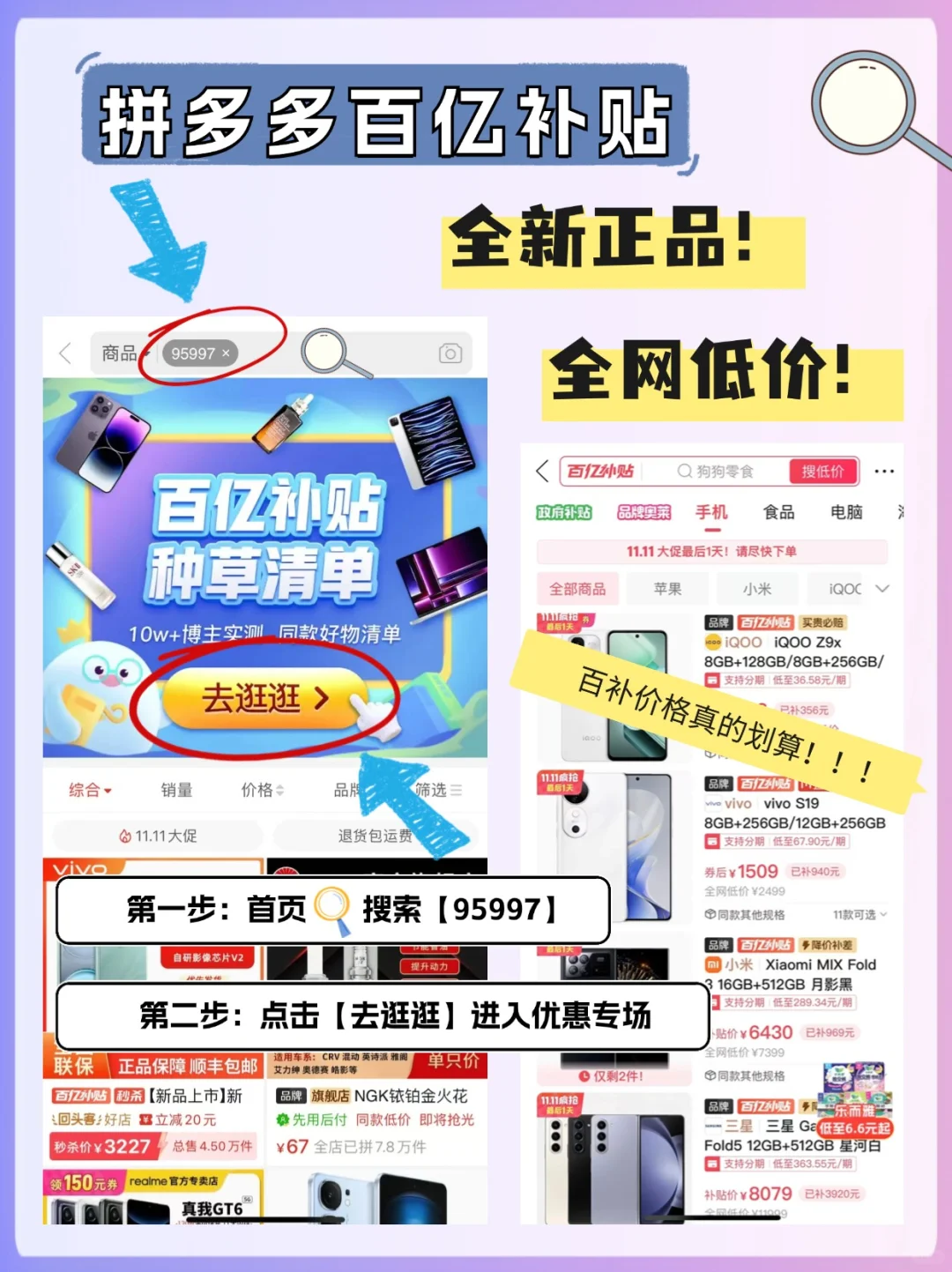 参加的方法也很简单,打开拼多多APP搜索【95997】点击页面进入百亿补贴活动会场,里面有海量全新大牌正品都是全网低价💕,新机刚发布就送大量好礼,更多热门机型甚至有能省下上千元的🧧想要换手机的朋友千万不要错过❗