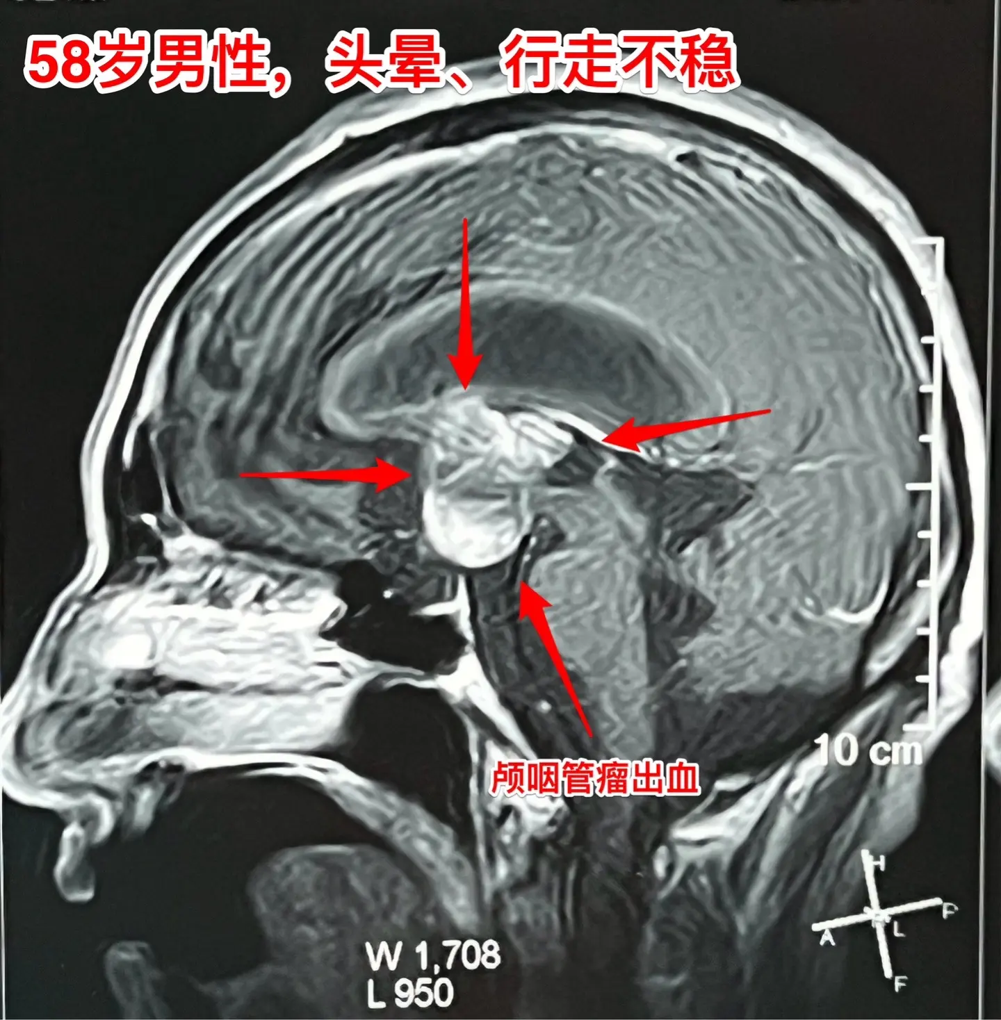 58岁的南通市男性,九年前体检发现鞍区病变,无任何症状,一直没有做任何治疗。四个月前开始出现头晕、行走不稳,同时还有思维糊涂,有一次癫痫发作。这次到医院检查就发现鞍区肿瘤增大了,而且导致了脑积水。