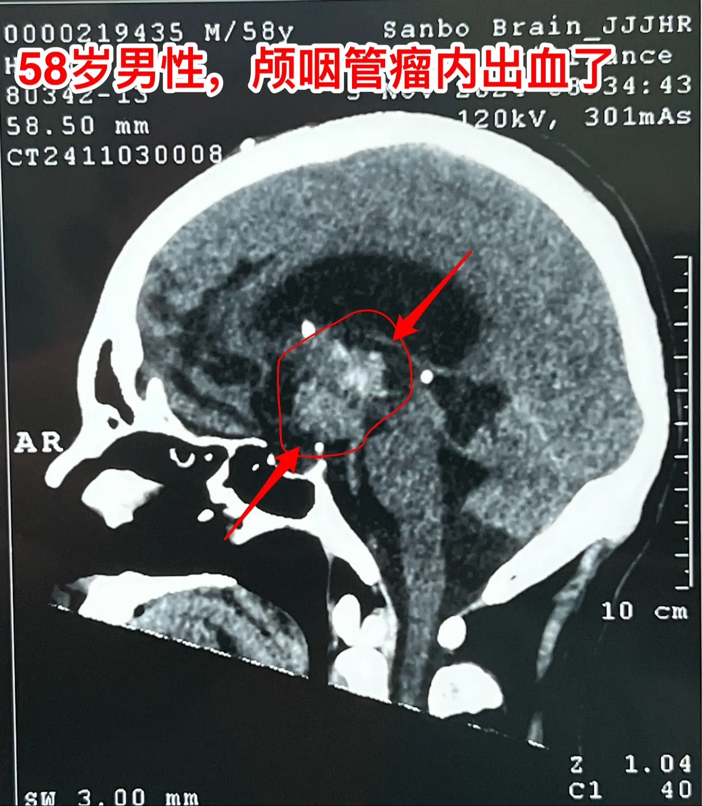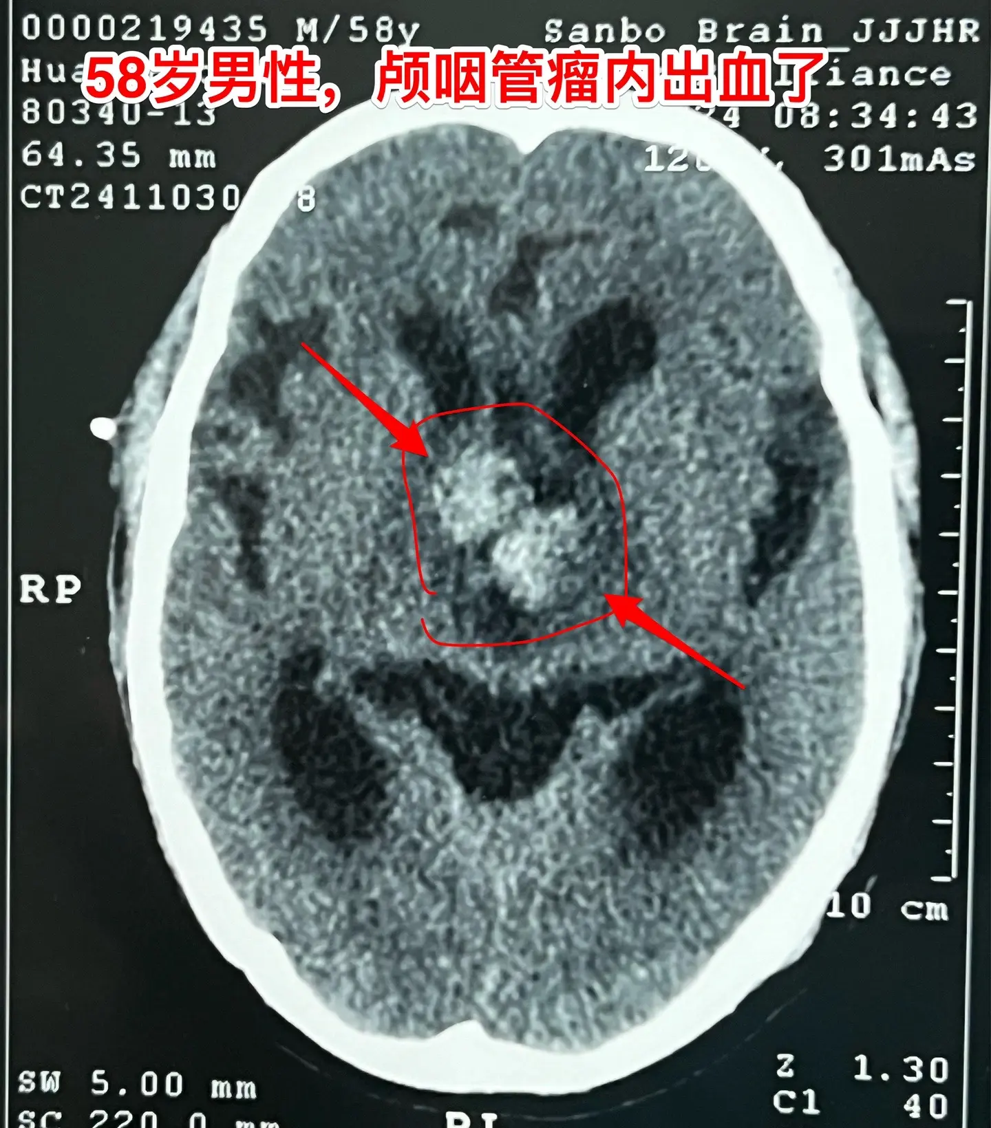 2024.10到我科住院,病人不仅仅是思维糊涂,还出现头痛症状。行头部CT检查提示颅咽管瘤内出血了。