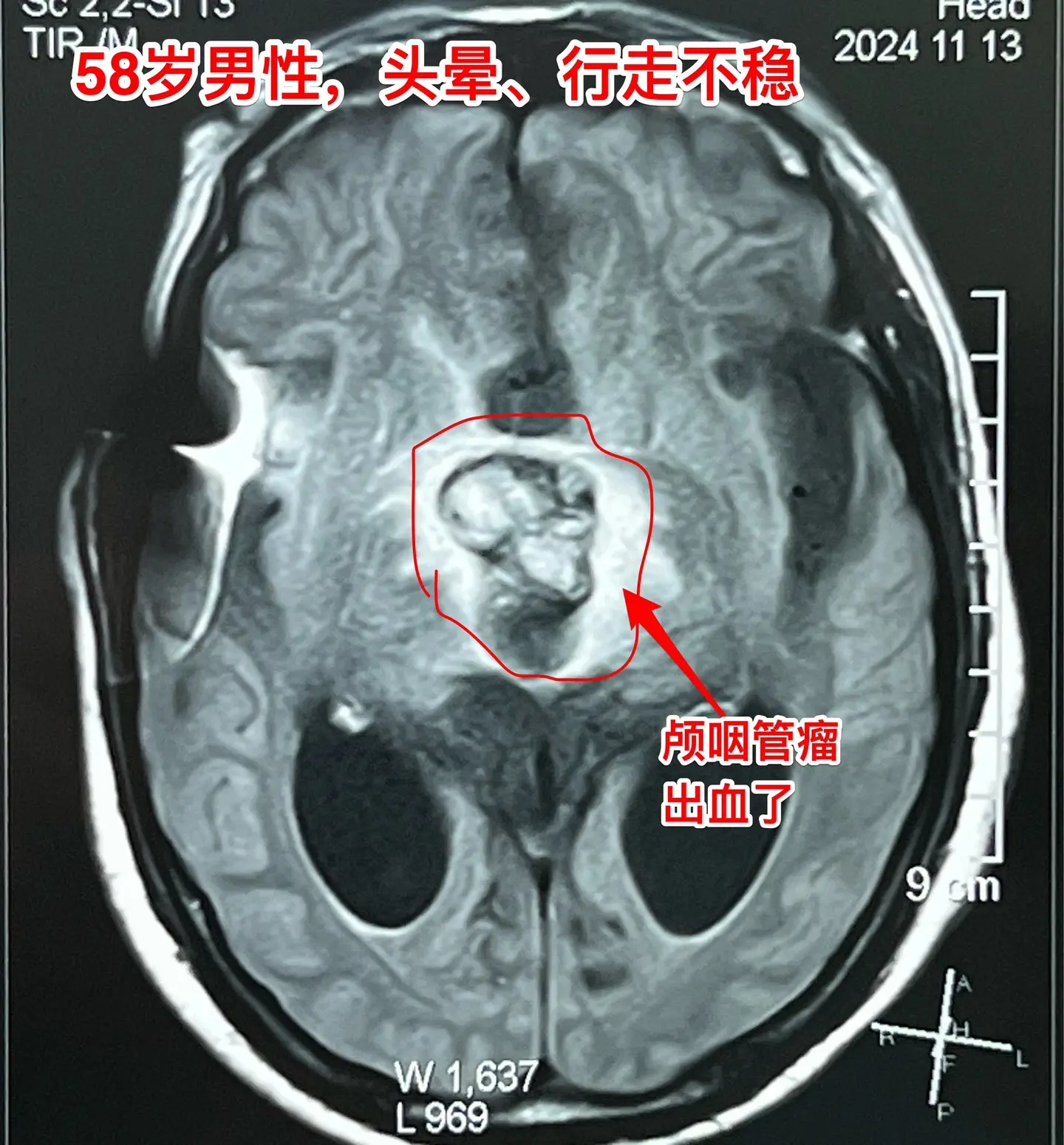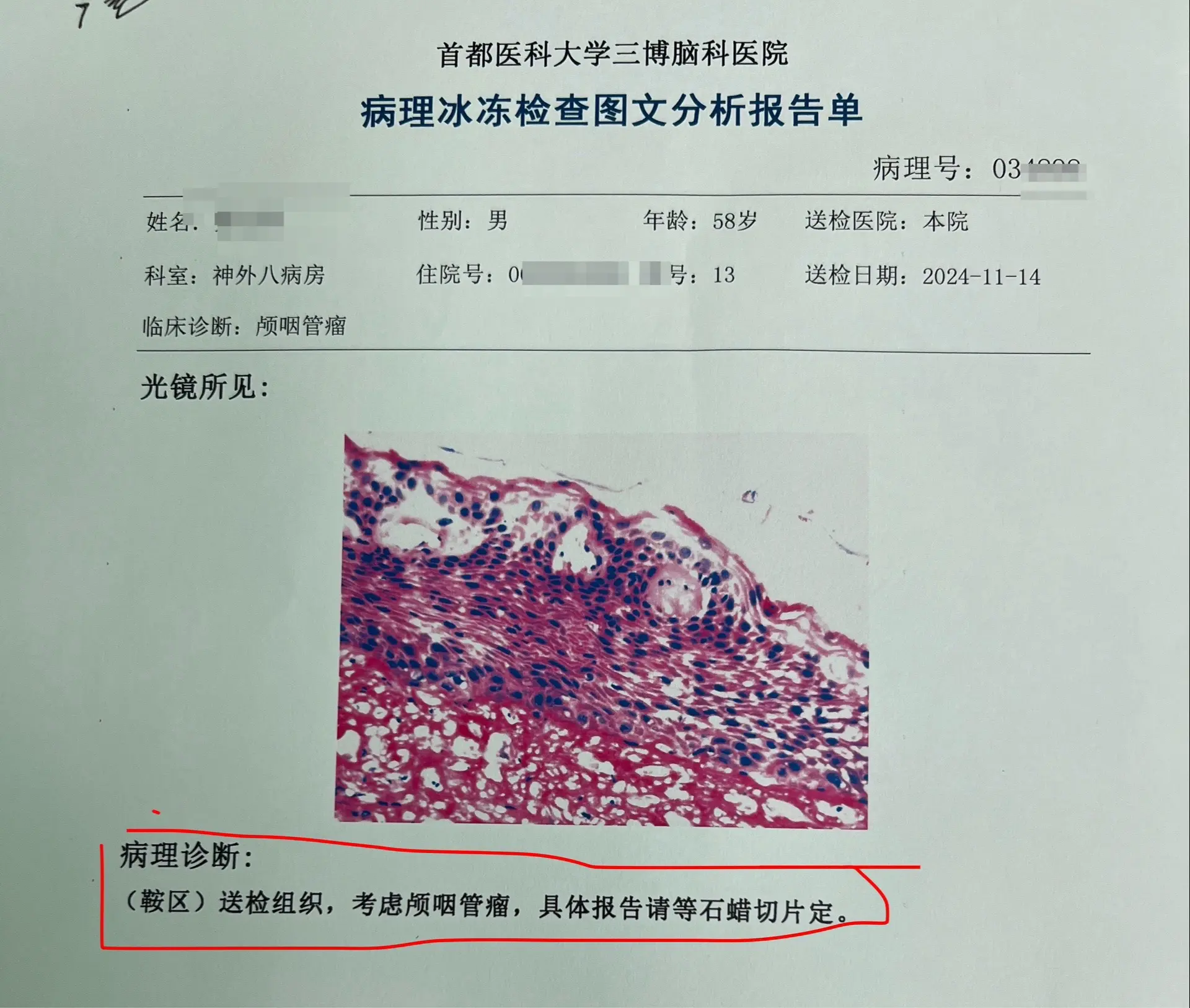 2024年11月14日作了开颅手术。切除肿瘤过程中可以看见肿瘤内有陈旧出血。病理报告为乳头型颅咽管瘤。乳头型颅咽管瘤出现瘤卒中的概率是很低的,我曾经在2008年报告了一例。造釉细胞性颅咽管瘤几乎不出现瘤卒中。